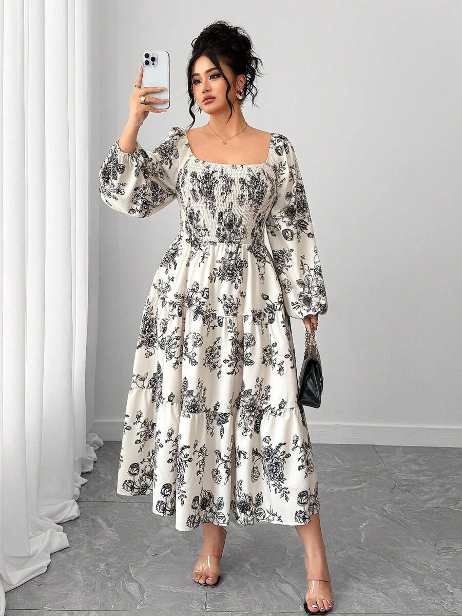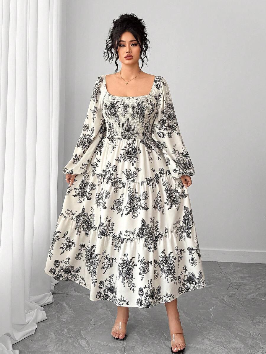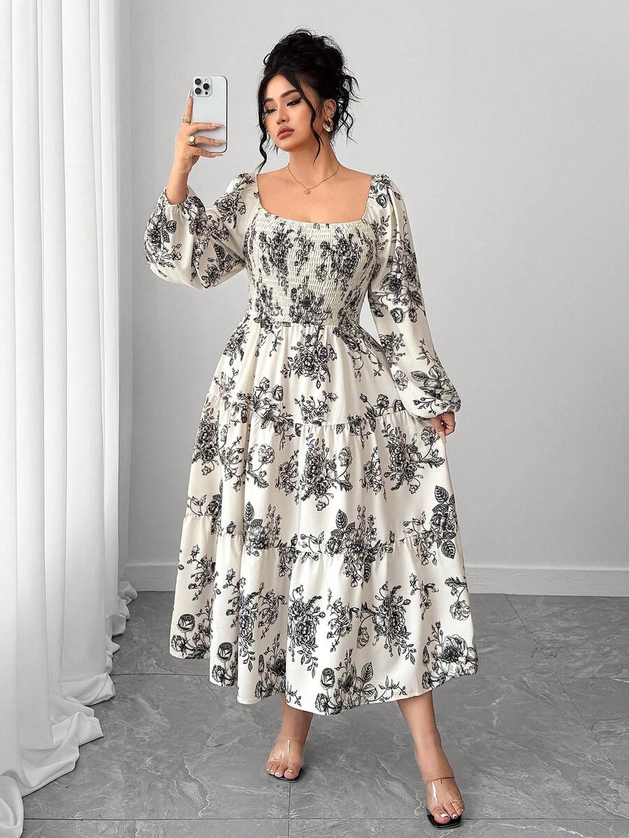 Vestido casual de manga larga con cuello cuadrado y estampado floral para vacaciones de otono para mujer de talla grande
