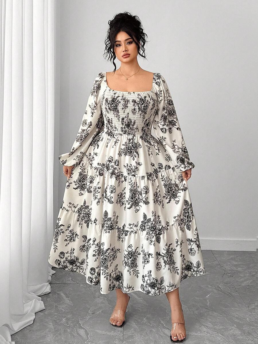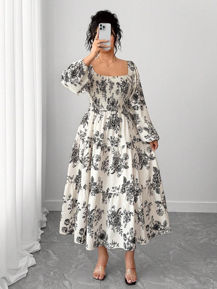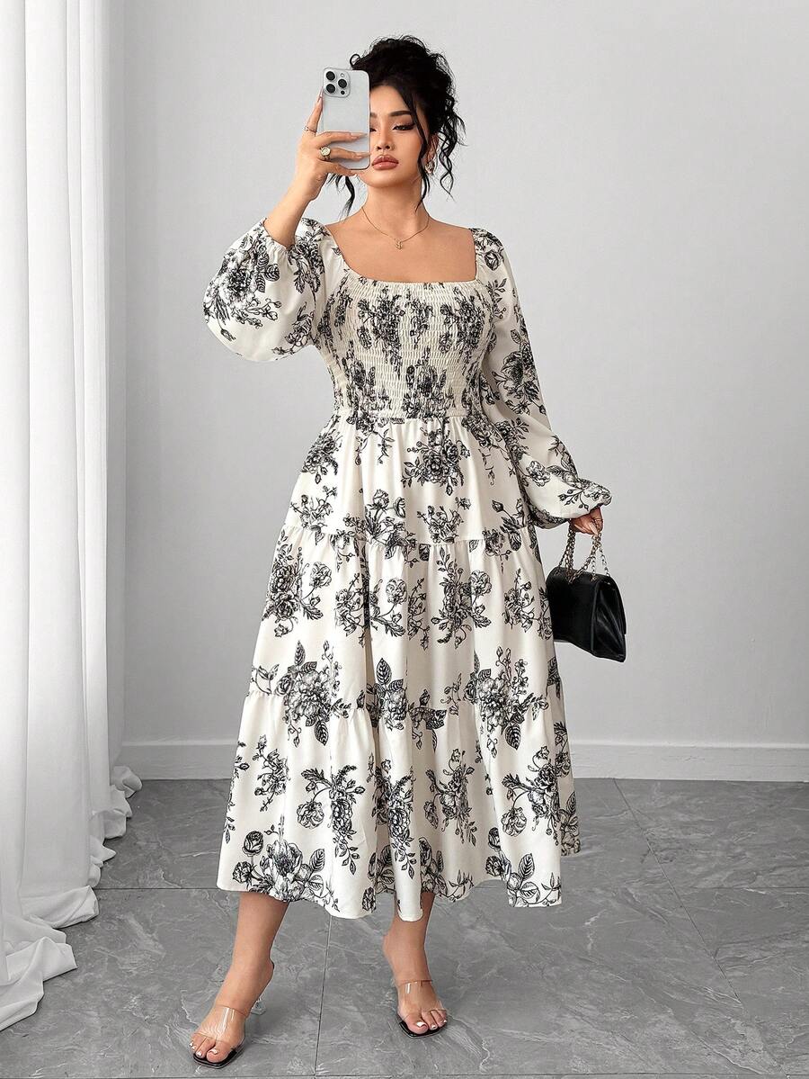 Vestido casual de manga larga con cuello cuadrado y estampado floral para vacaciones de otono para mujer de talla grande