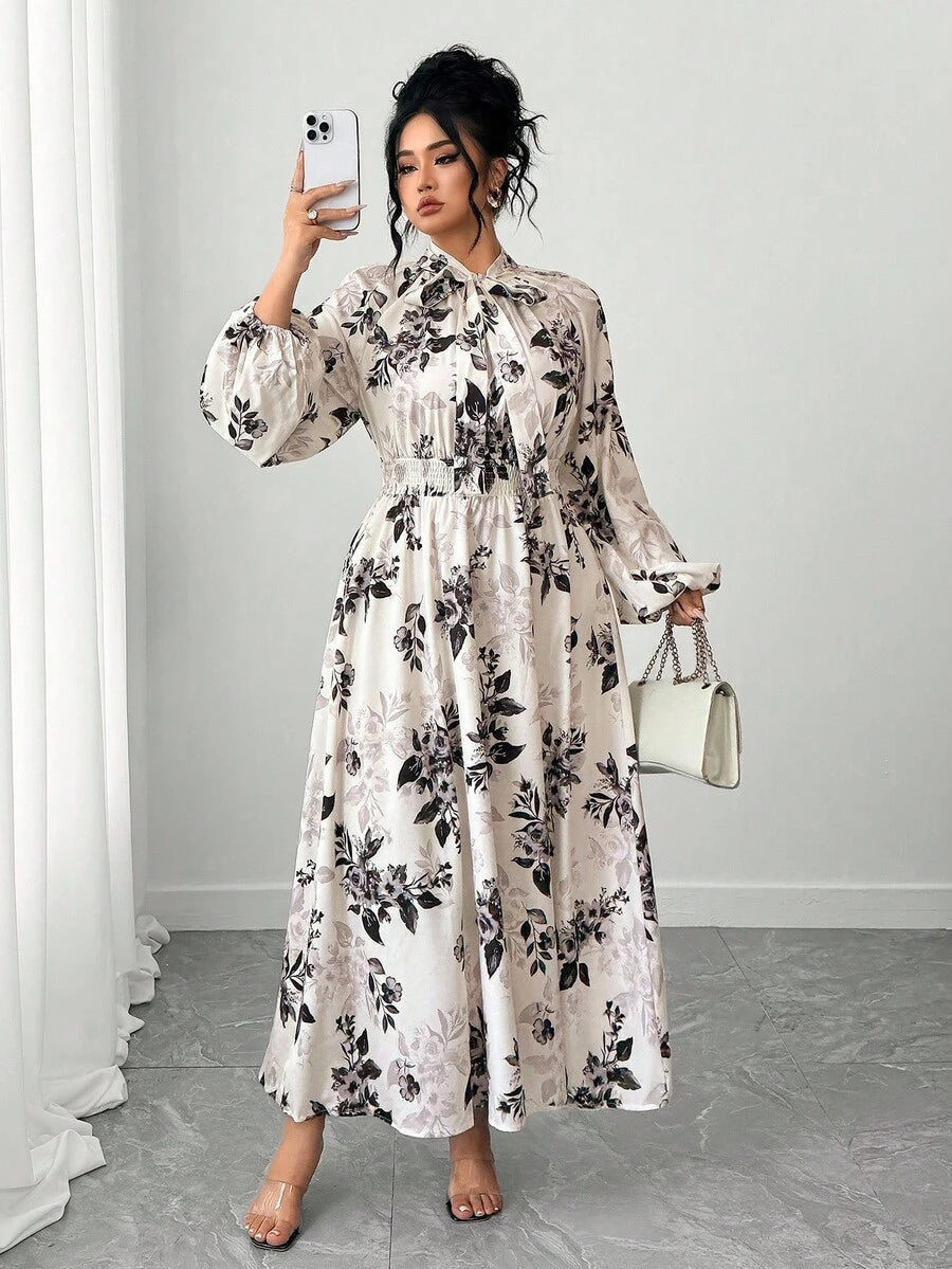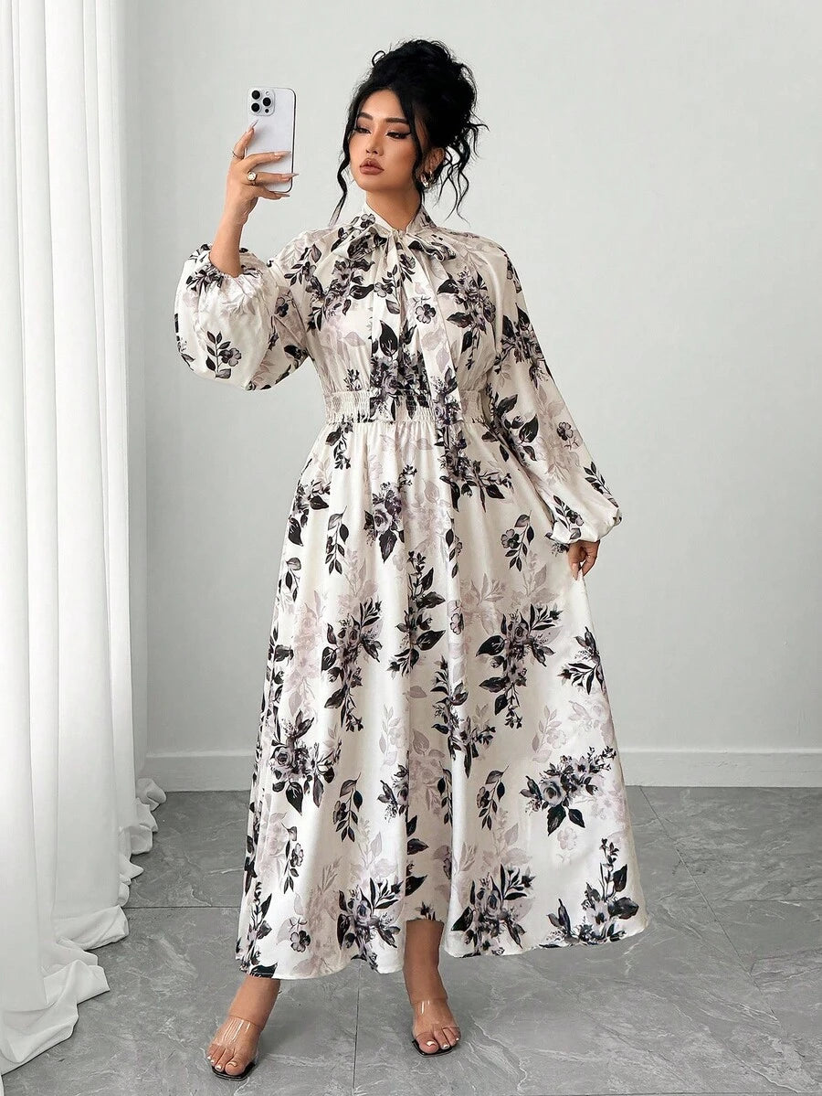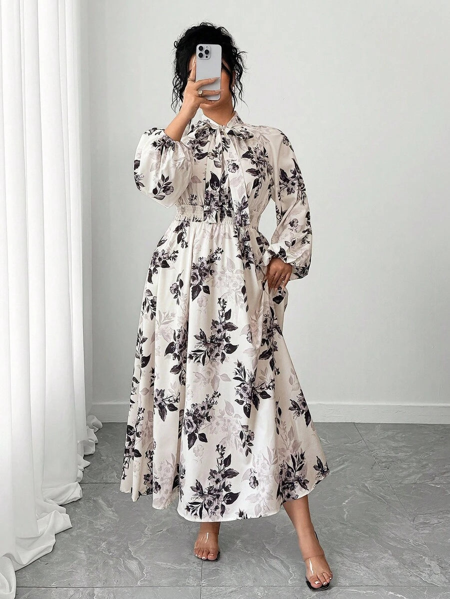 Vestido largo de mujer talla grande con mangas farol raglan y estampado floral de cuello completo con lazo para primavera y otono