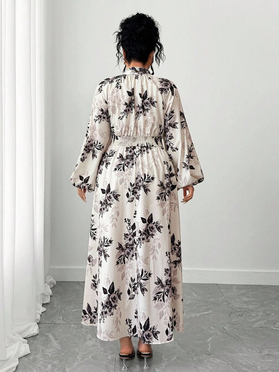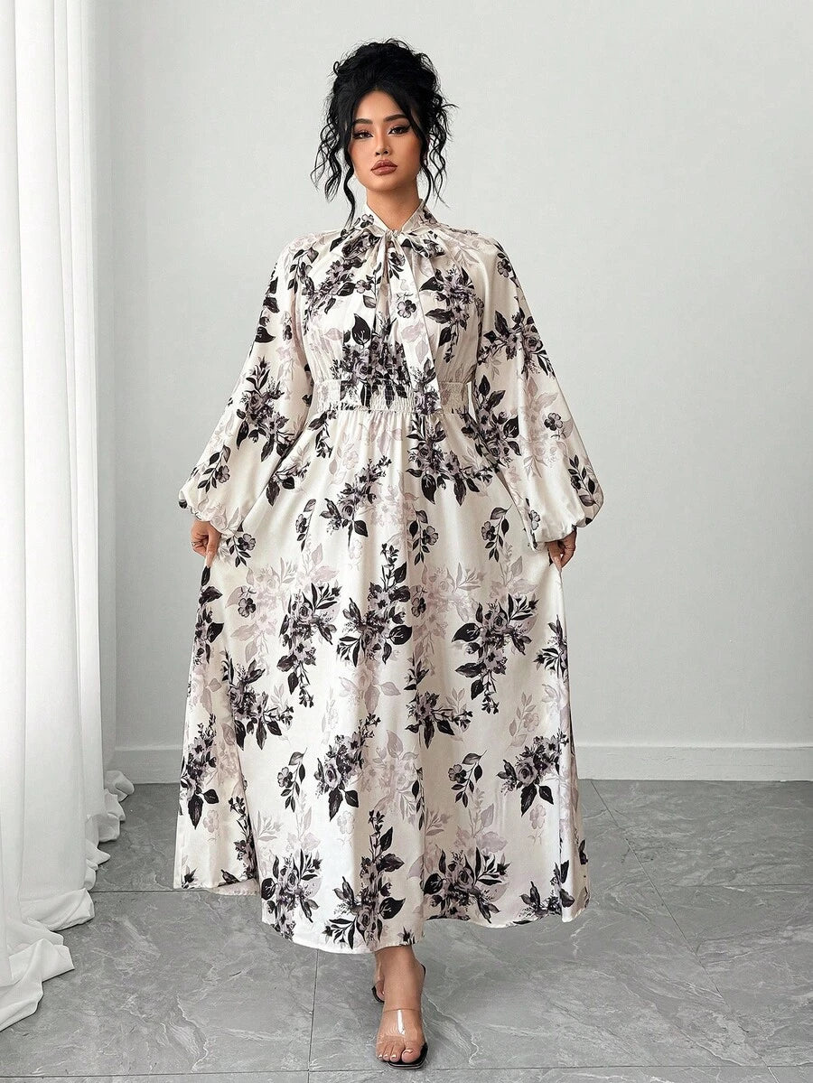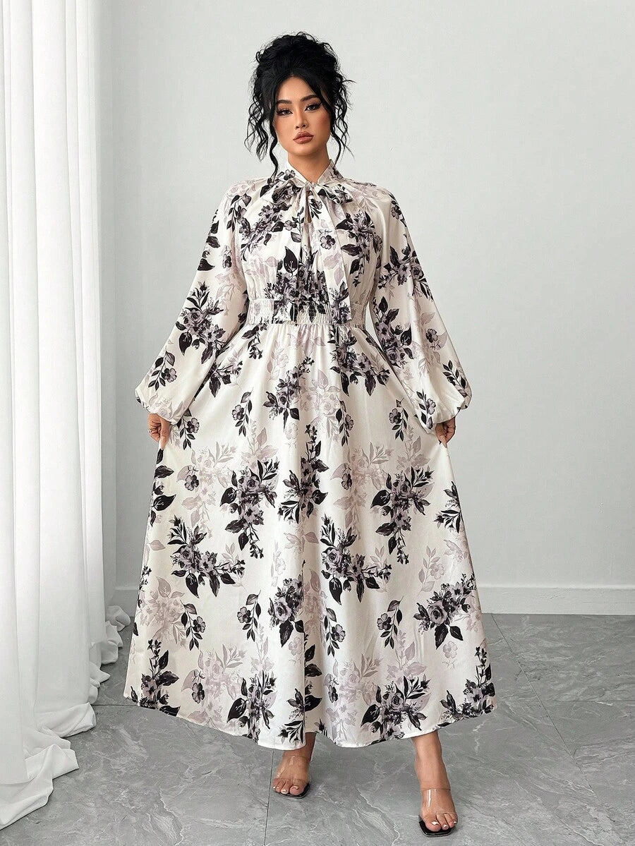 Vestido largo de mujer talla grande con mangas farol raglan y estampado floral de cuello completo con lazo para primavera y otono