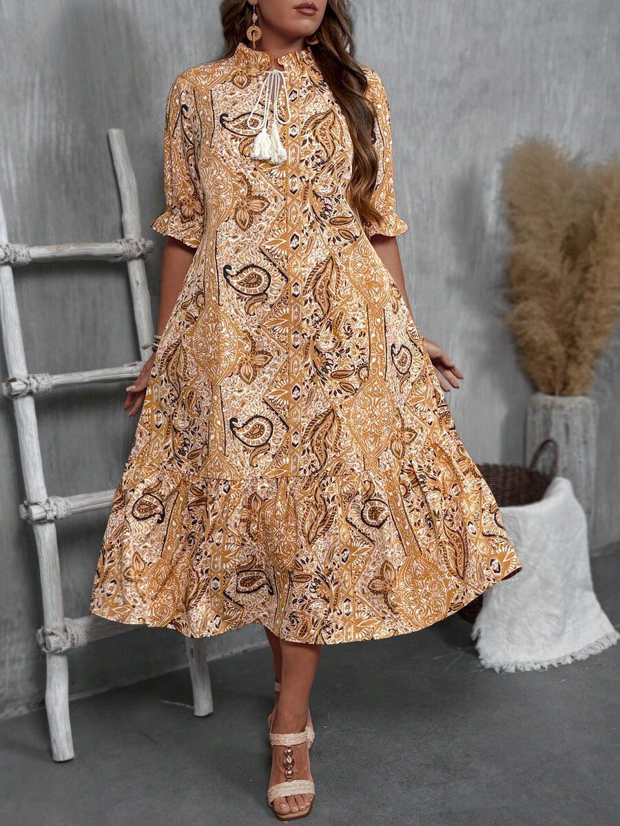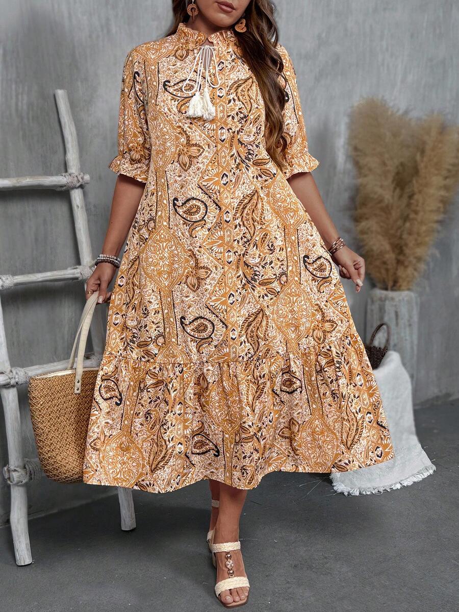 Vestido holgado casual con estampado de cuello en v y mangas abullonadas para mujer de talla grande