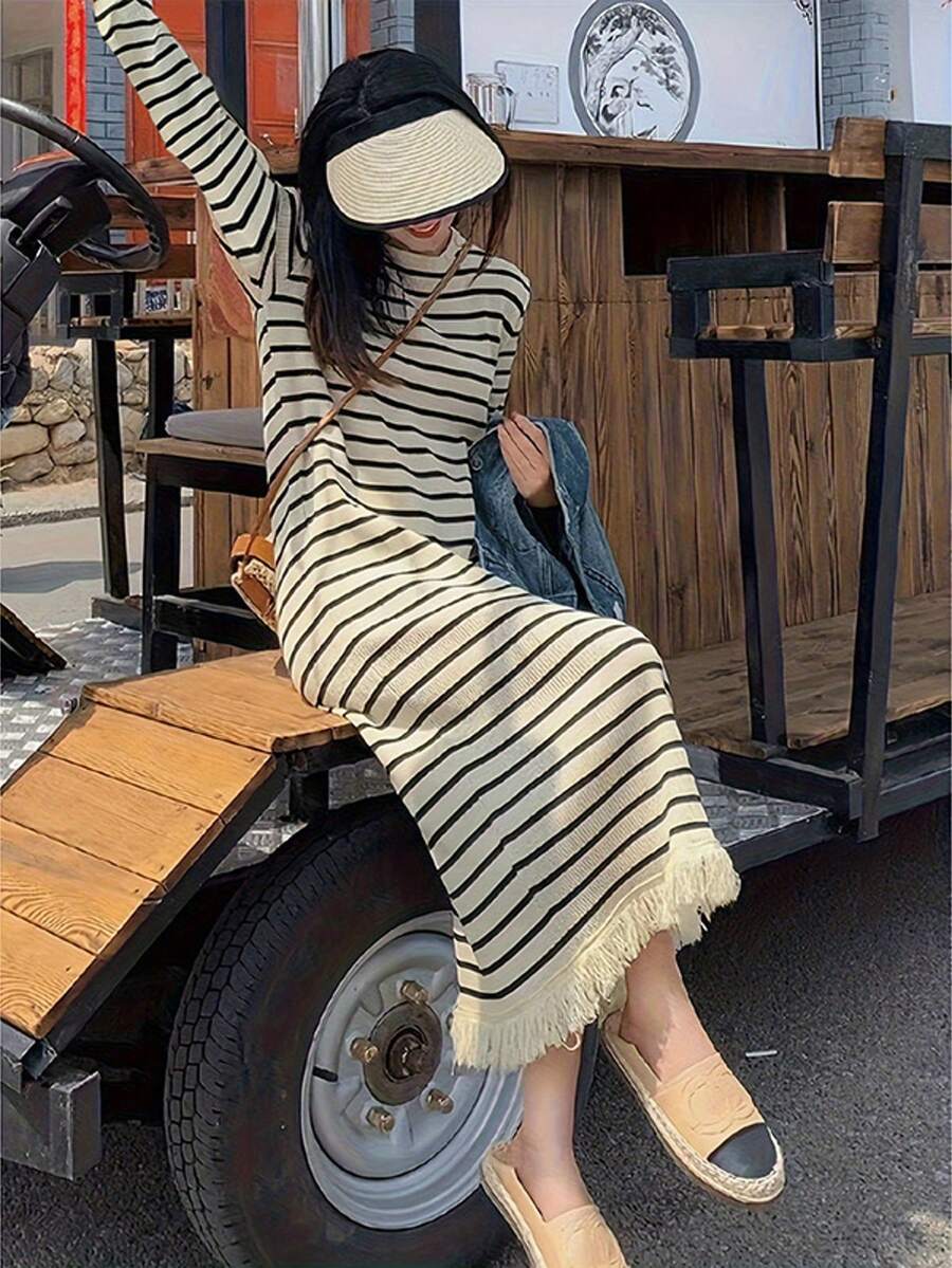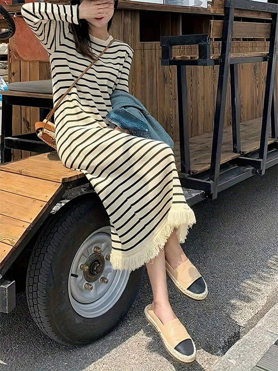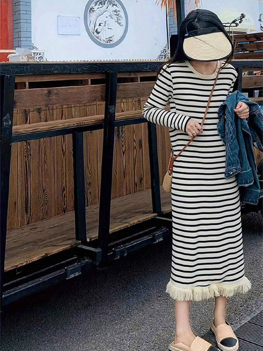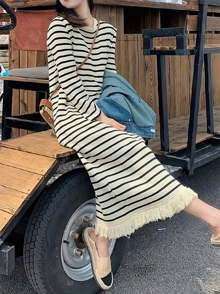 Vestido de manga larga con flecos y rayas estilo retro para mujeres, suelto y estilizador, nueva llegada de otono