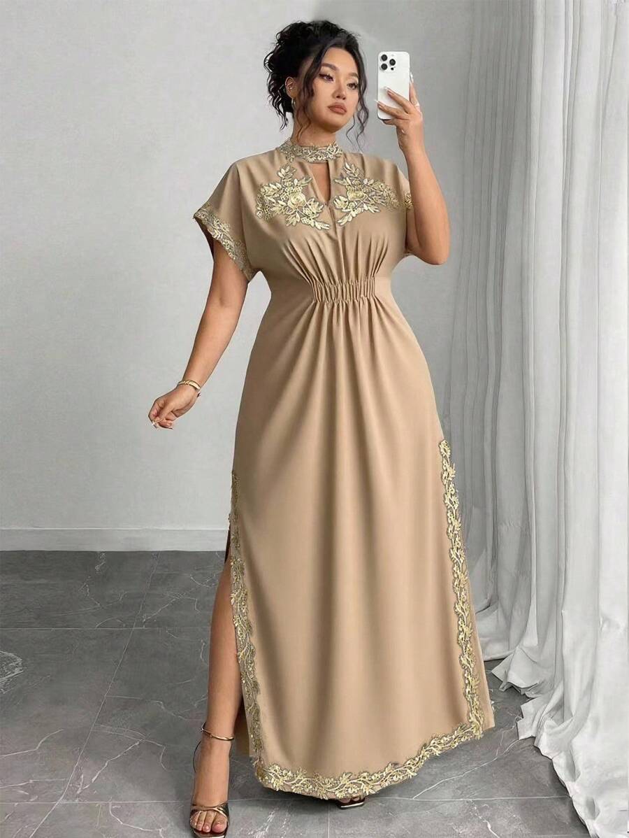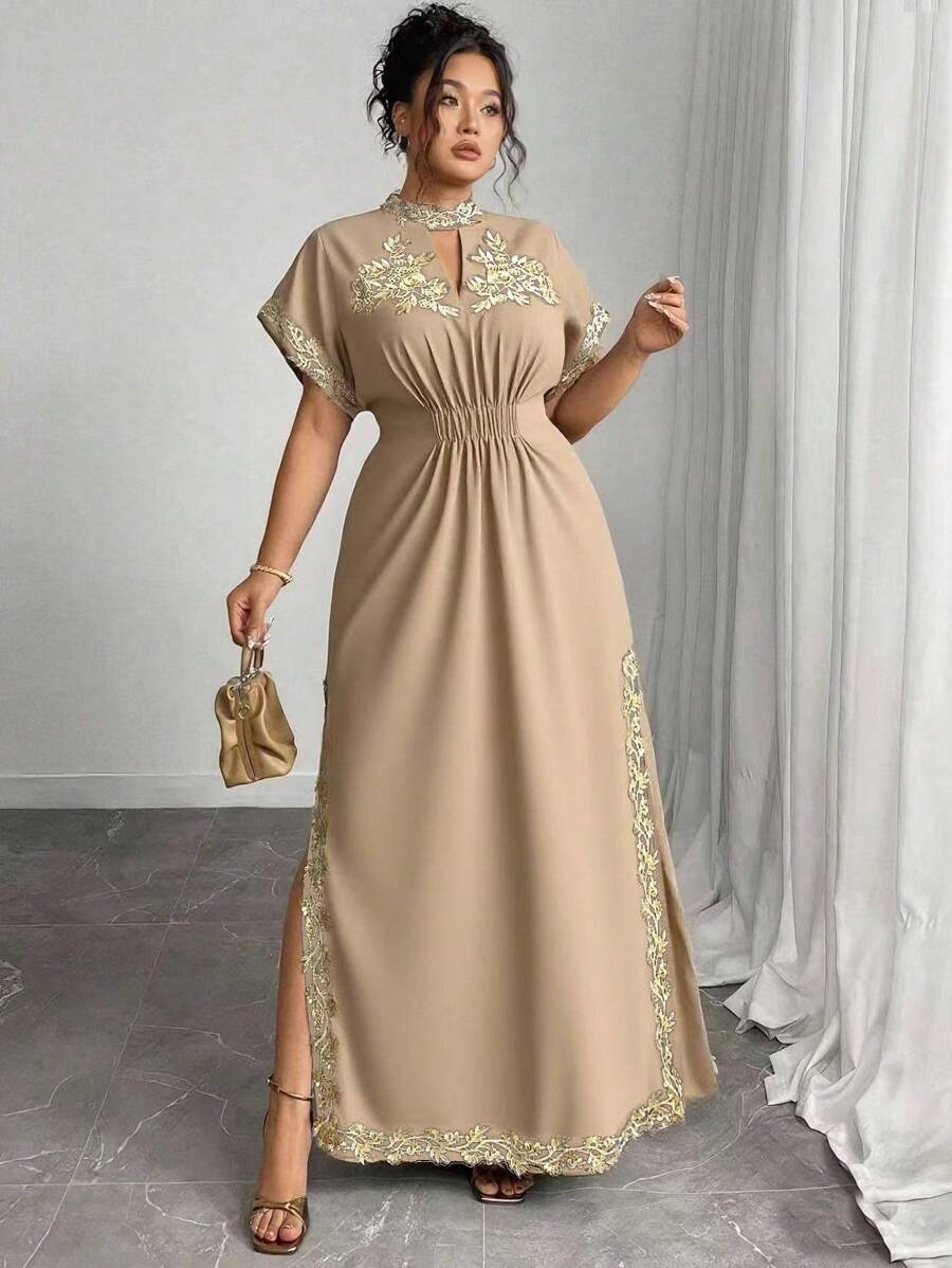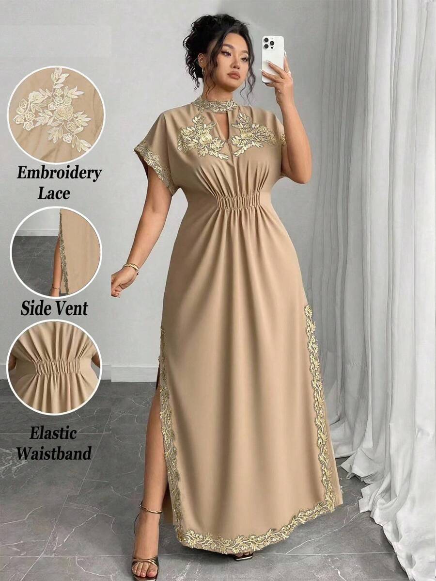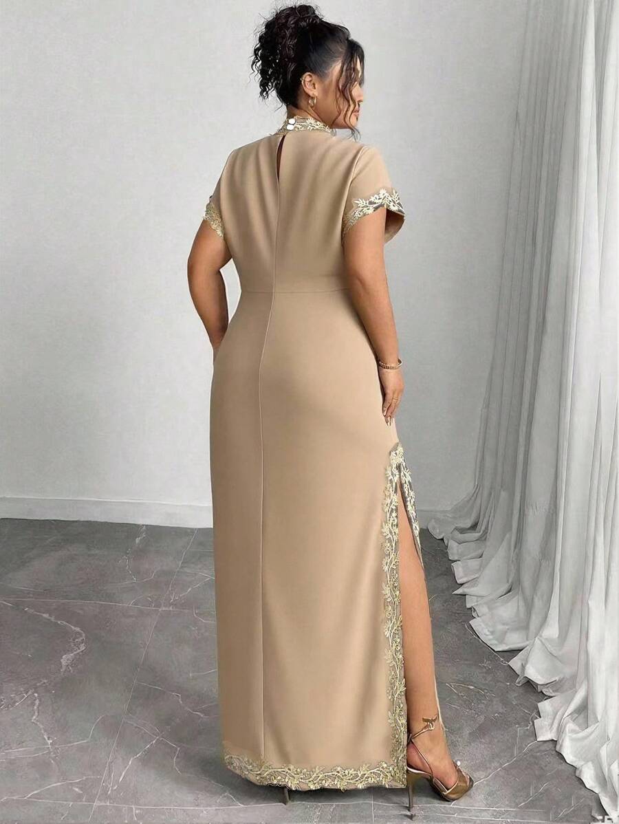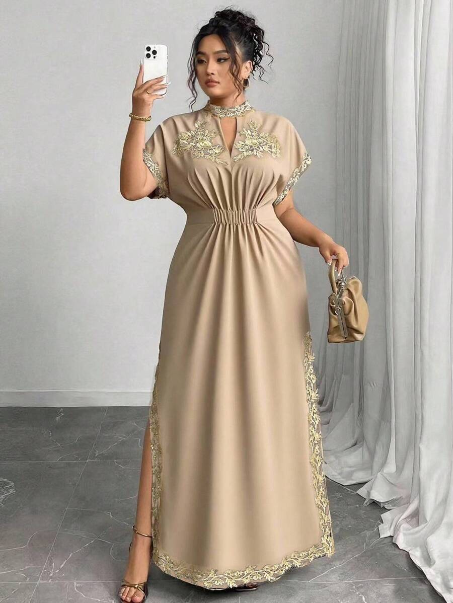 Vestido maxi de manga larga de diseno versatil para mujer de talla grande, elegante, de unicolor, con bordado romantico y aplicaciones, para fiesta, coctel, cita, concierto, vacaciones, primavera/verano