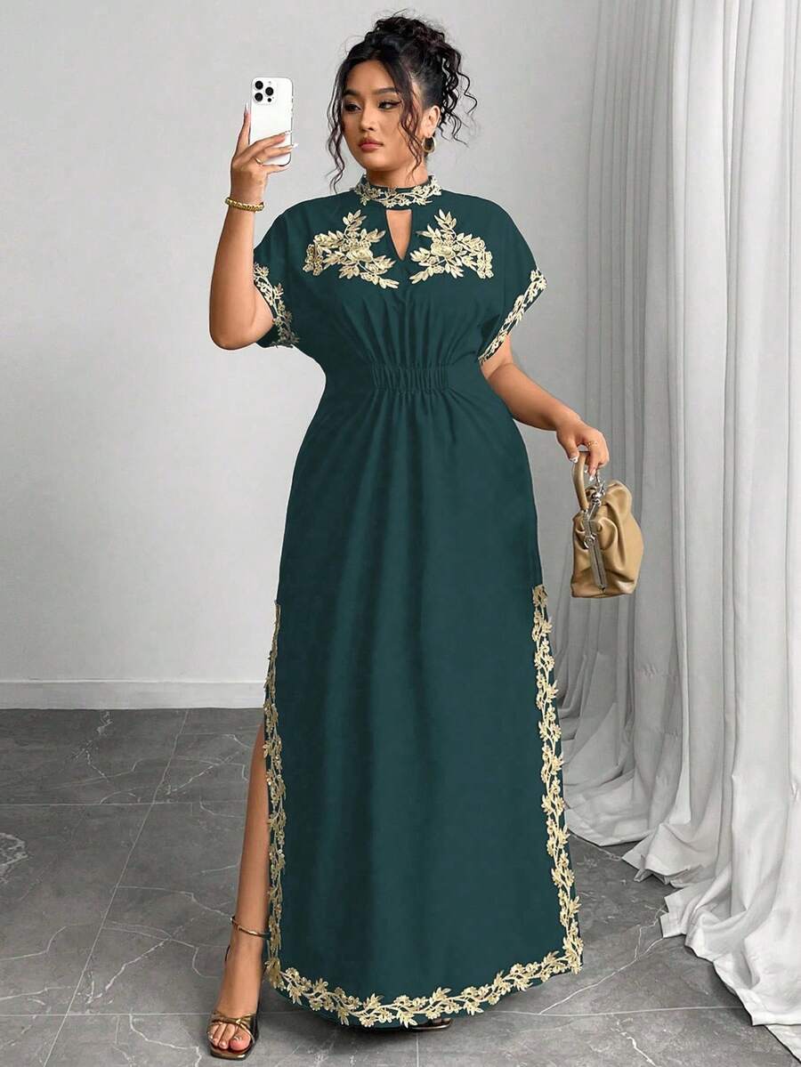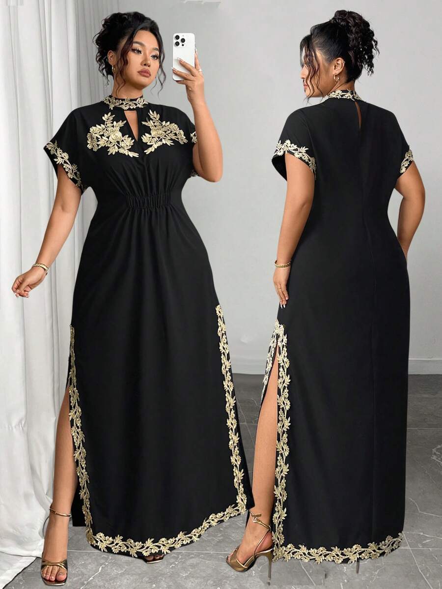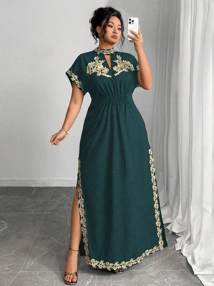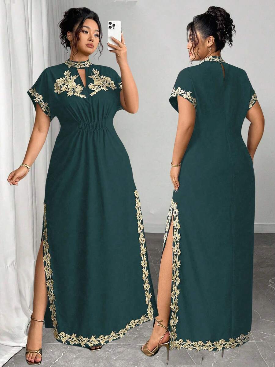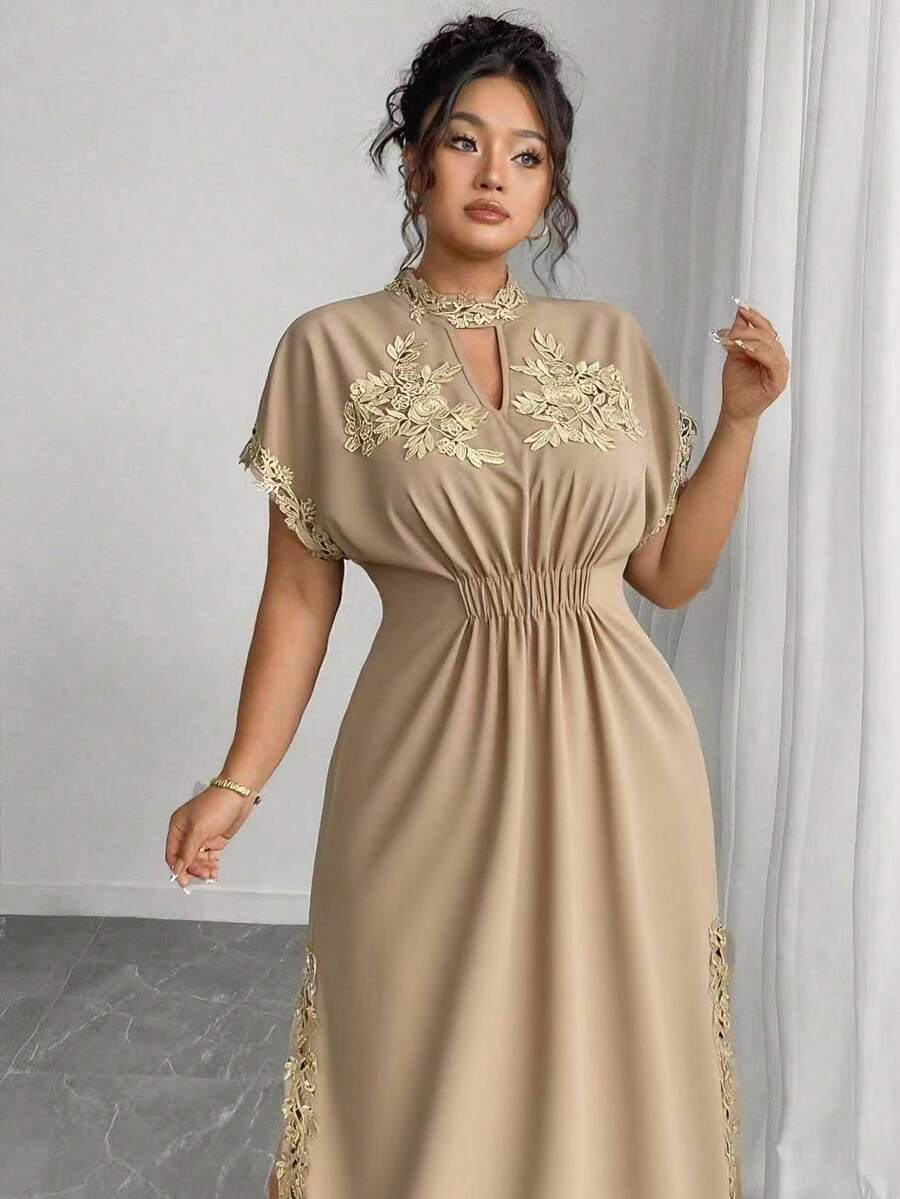 Vestido maxi de manga larga de diseno versatil para mujer de talla grande, elegante, de unicolor, con bordado romantico y aplicaciones, para fiesta, coctel, cita, concierto, vacaciones, primavera/verano