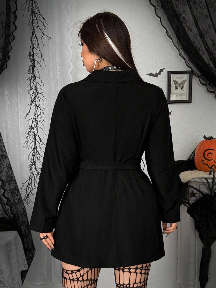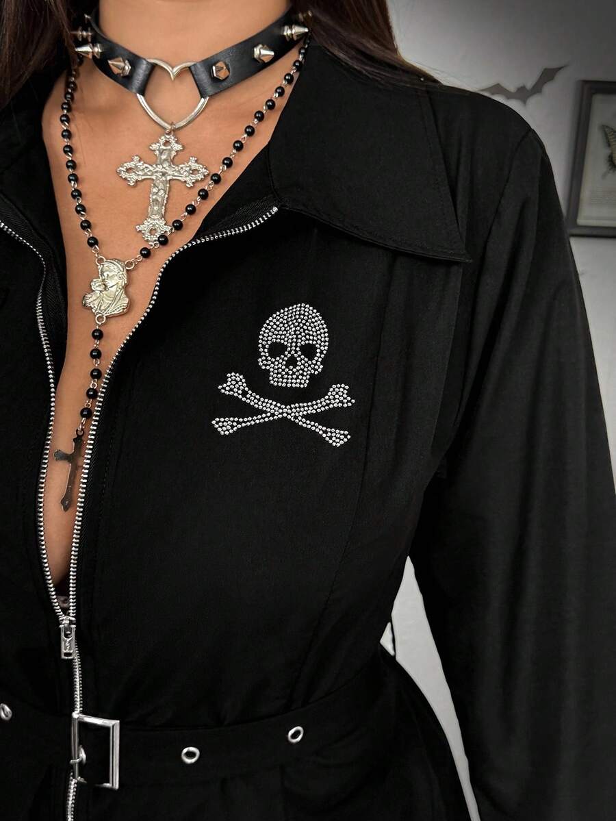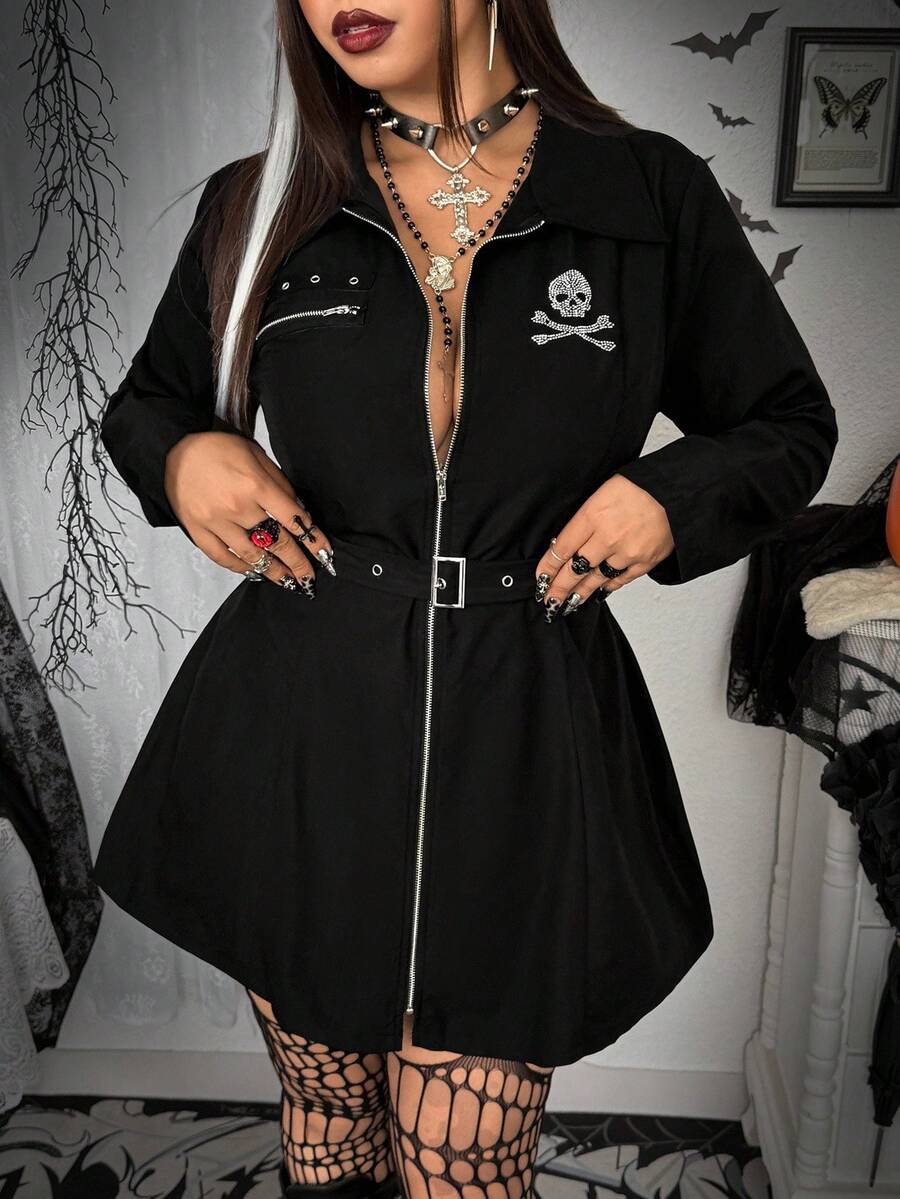 Whyspr vestido de linea a de talla grande para mujer, con cuello cuadrado, cierre delantero con cremallera metalica, cintura cenida, elegante, retro, lindo, calavera, punk, gotico, chic para otono/invierno