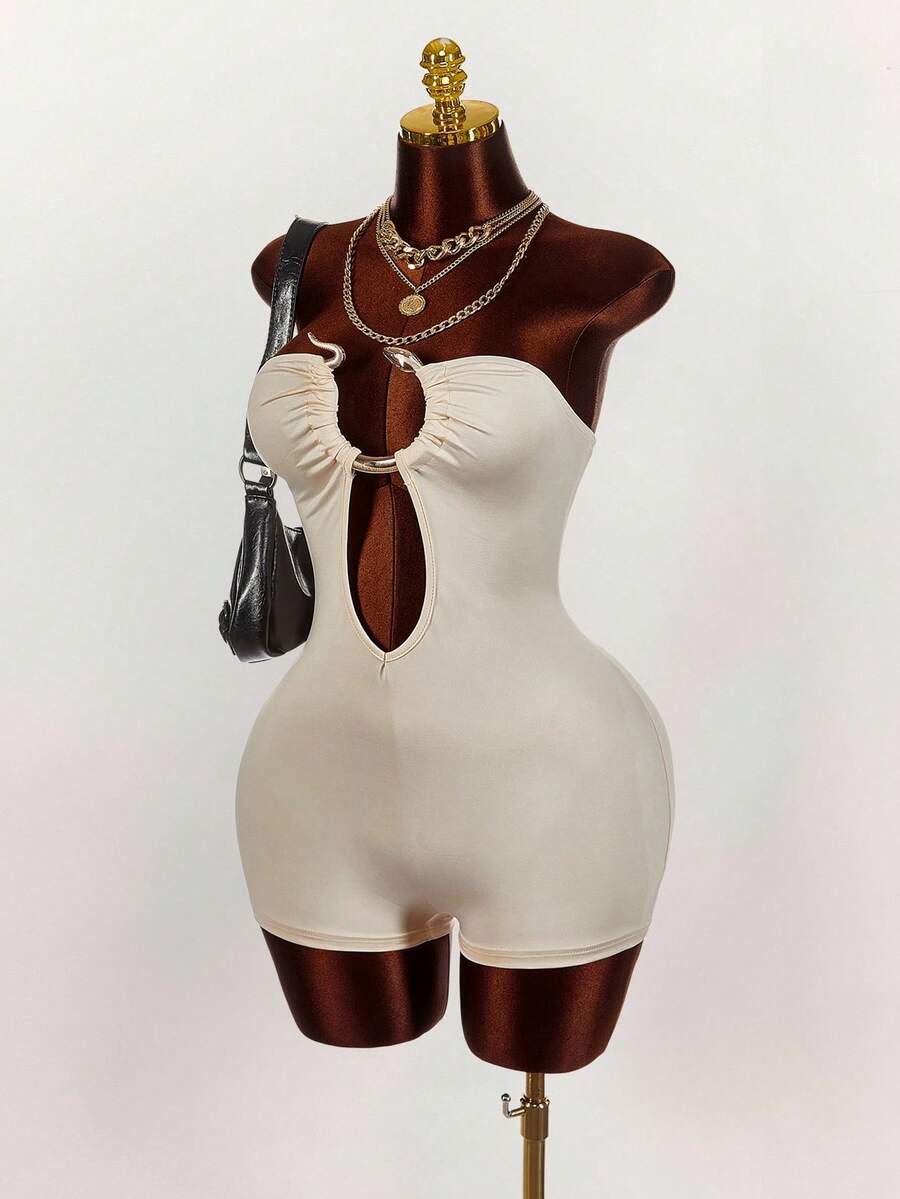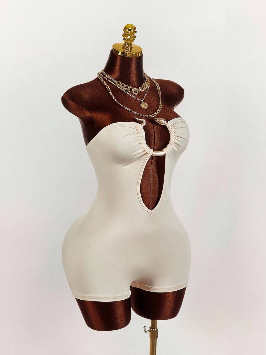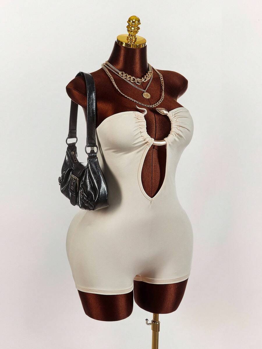 Amplova enterizo sexy de talla grande para mujer con anillo decorativo, unicolor y diseno calado