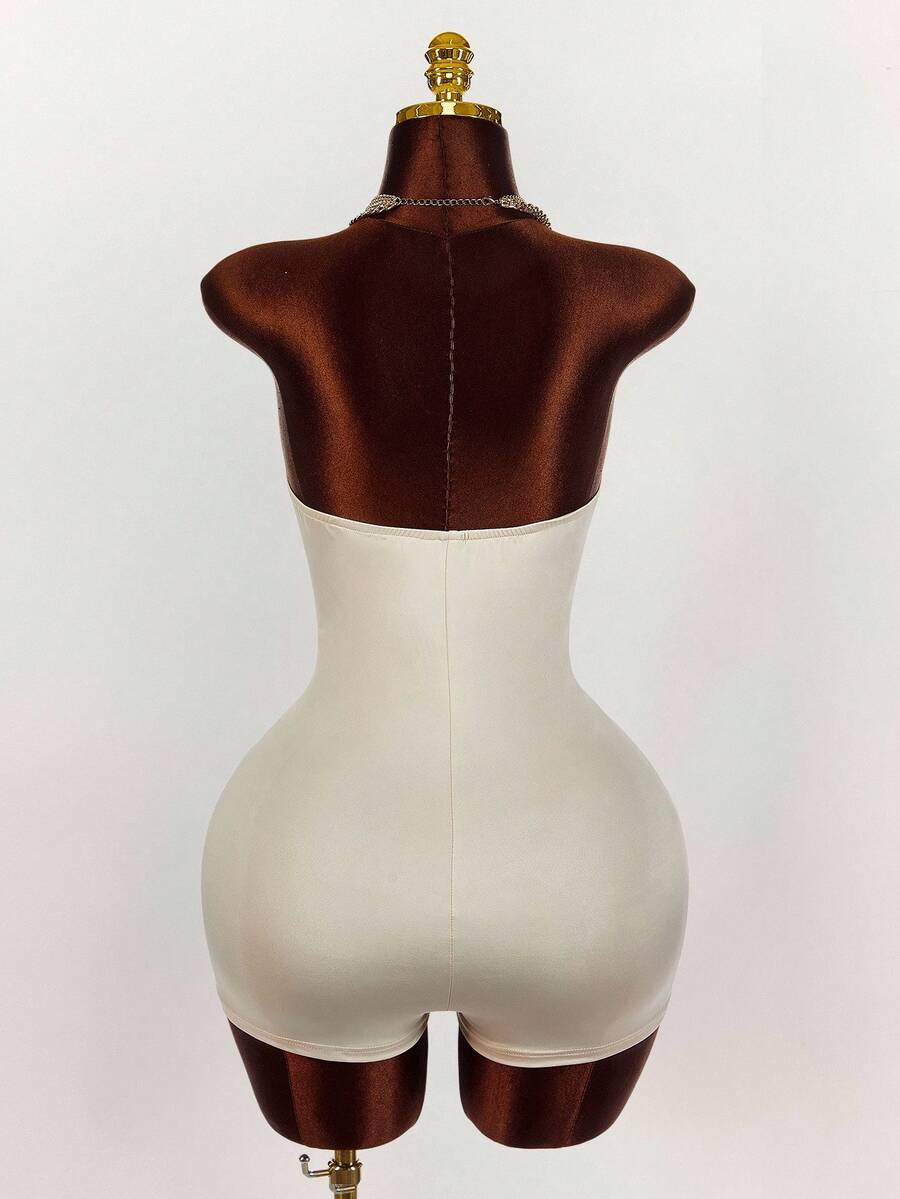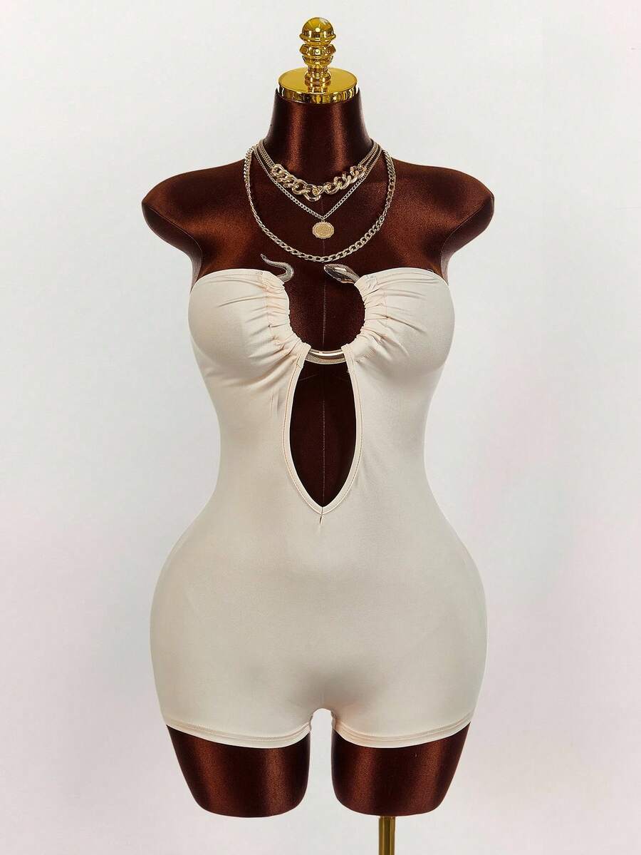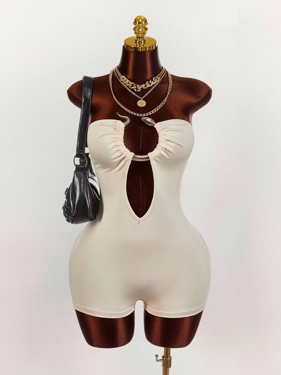 Amplova enterizo sexy de talla grande para mujer con anillo decorativo, unicolor y diseno calado