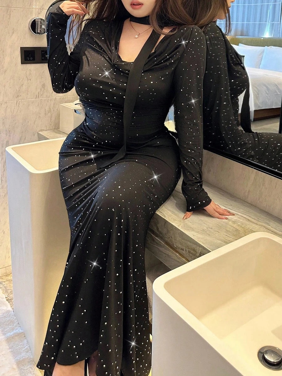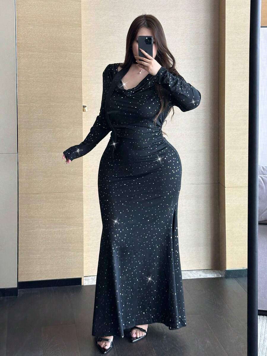 Vibekara vestido maxi elegante de fiesta retro de talla grande para mujer, con mangas largas plisadas, lentejuelas brillantes y ajustado en la bottom, en color negro, para otono e invierno