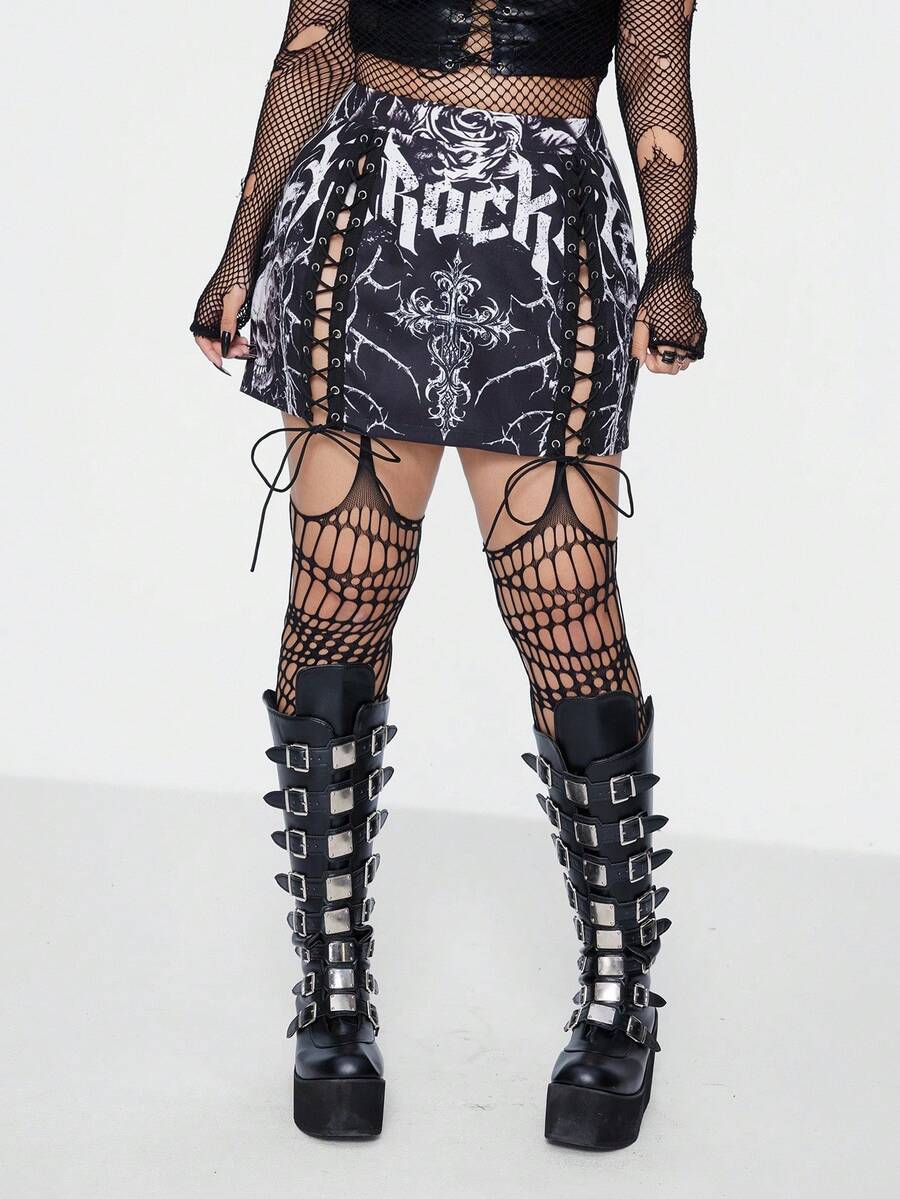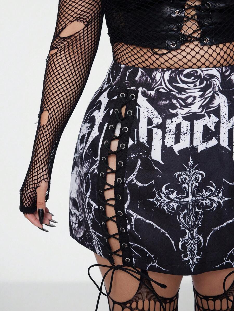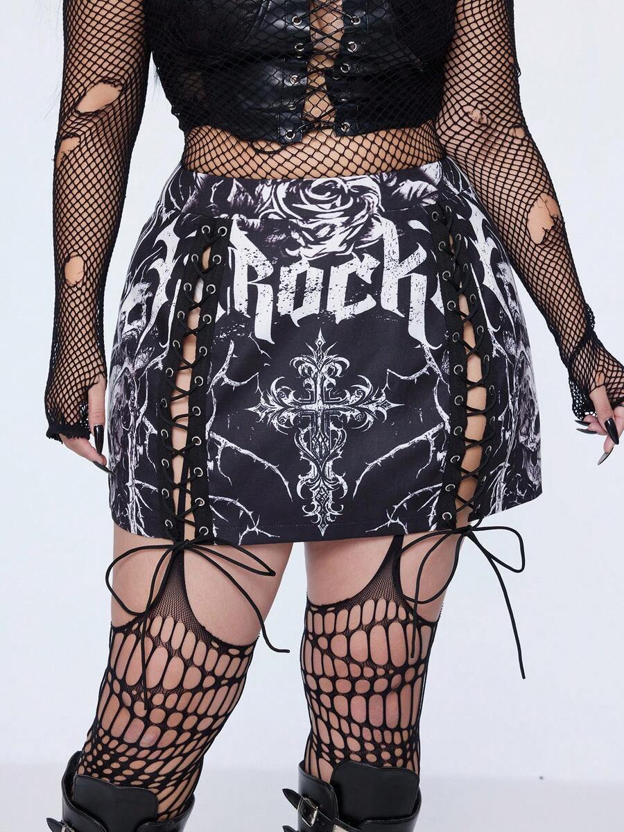Whyspr minifalda gotica retro punk de talla grande para mujer, con contraste blanco y negro, estampado de calavera y cruz, y ojetes metalicos huecos con cordones