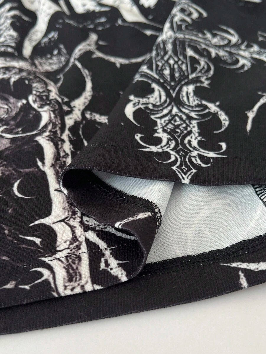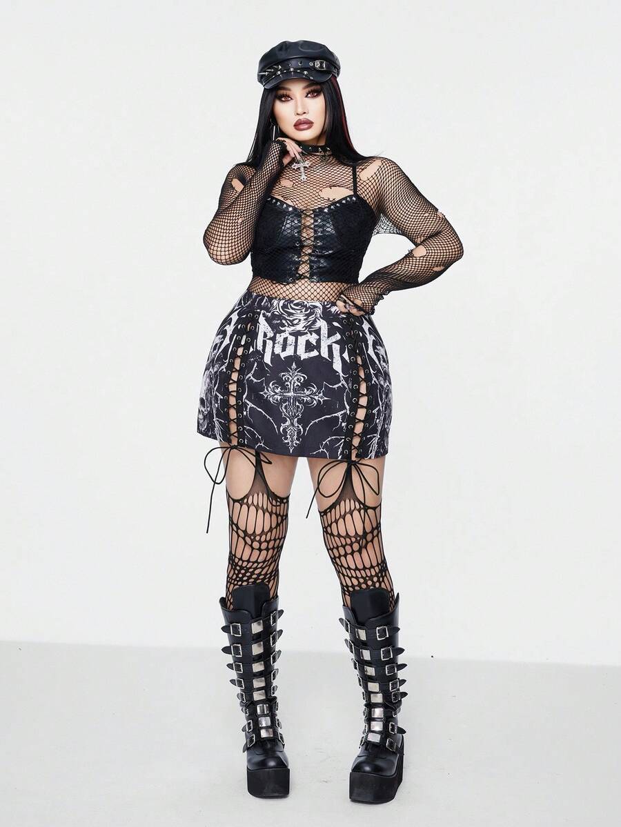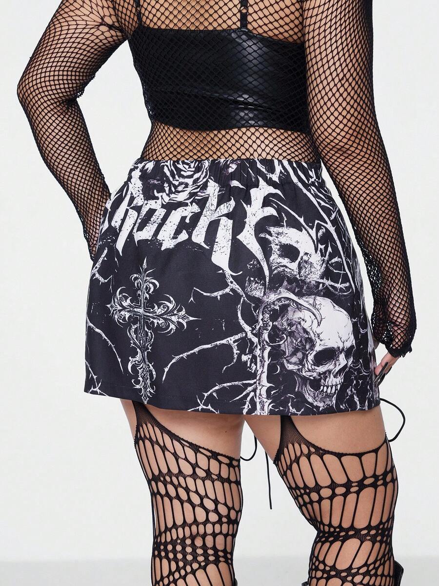 Whyspr minifalda gotica retro punk de talla grande para mujer, con contraste blanco y negro, estampado de calavera y cruz, y ojetes metalicos huecos con cordones