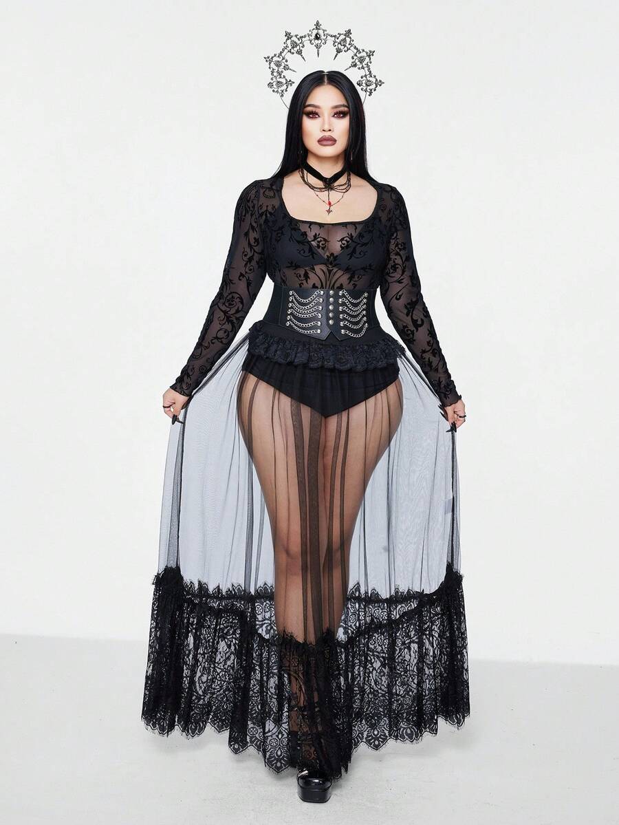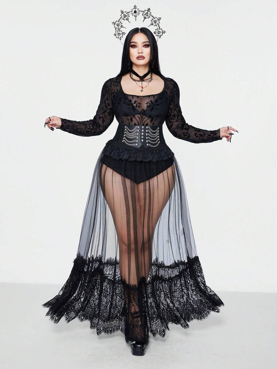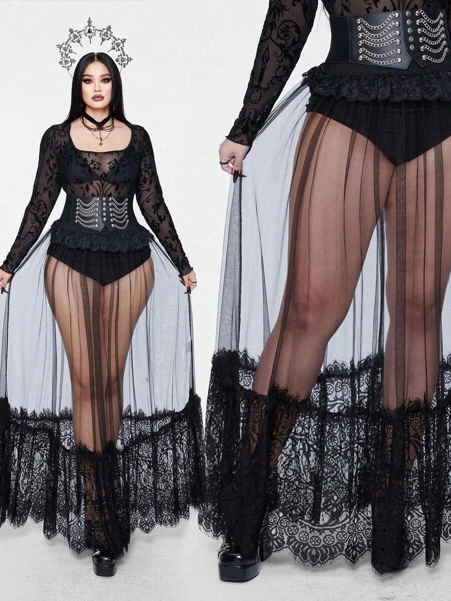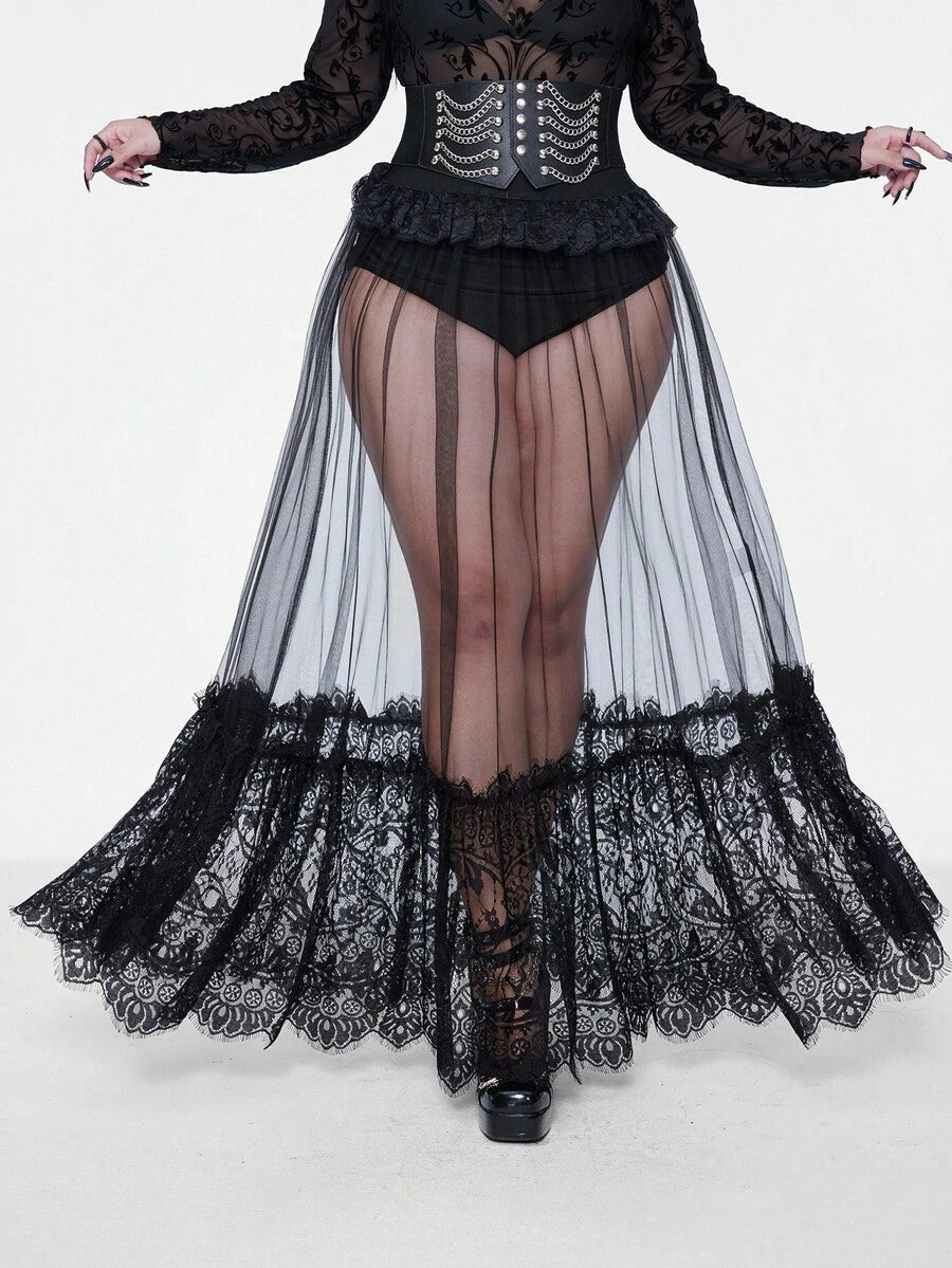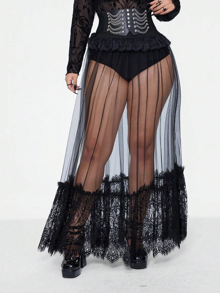 Whyspr falda larga vaporosa y transparente de cintura alta con volantes de encaje elegante y gotico, falda larga sexy y vaporosa de varias capas, falda estilizadora superpuesta, eterea