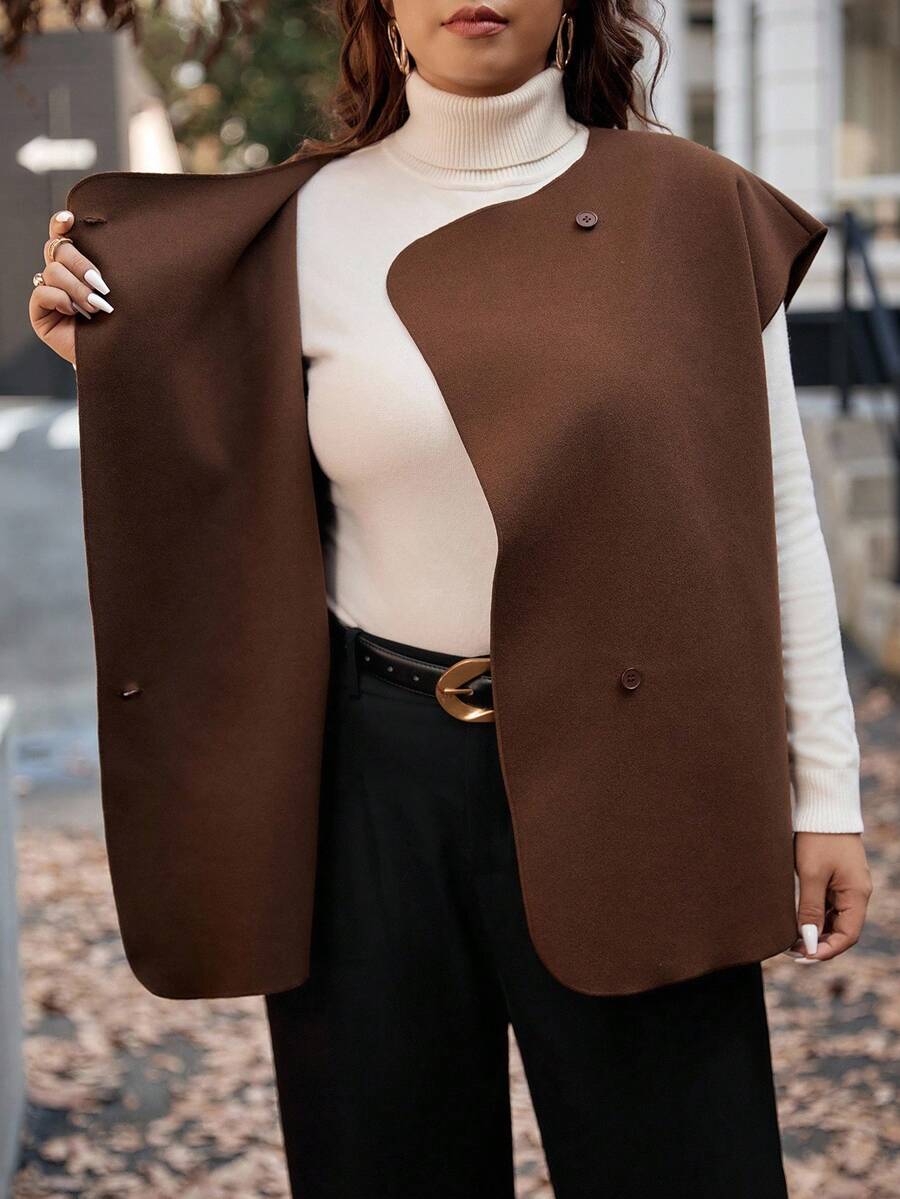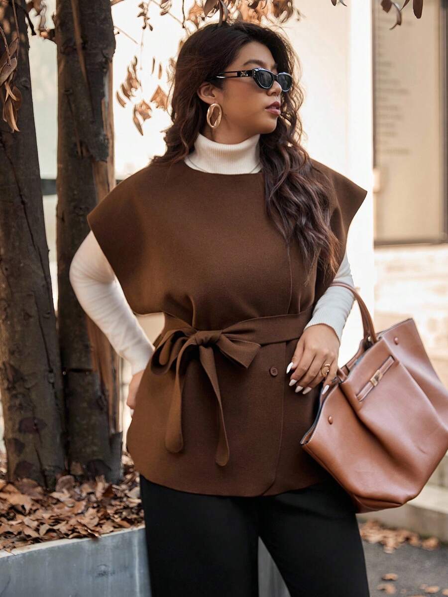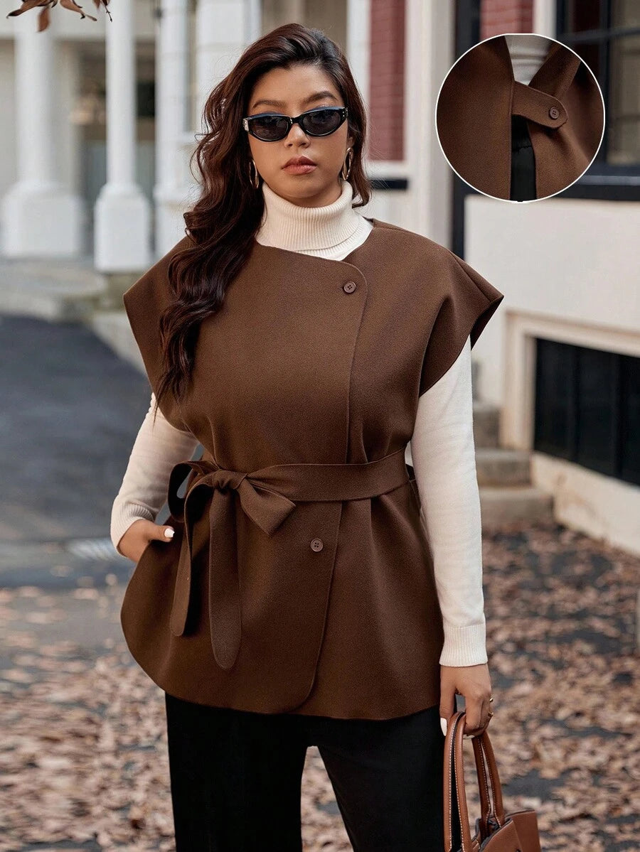 Vionelle chaqueta de lana con cuello redondo, hombros caidos, botones asimetricos en la cintura y lazo en la cintura, elegante para oficina francesa/viajes/uso casual, adecuada para primavera, otono e invierno, talla grande para mujeres