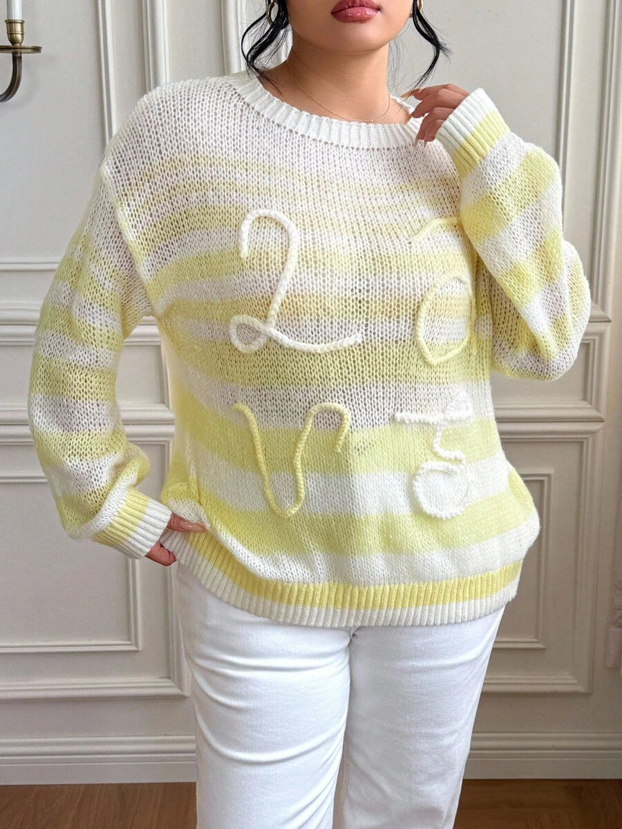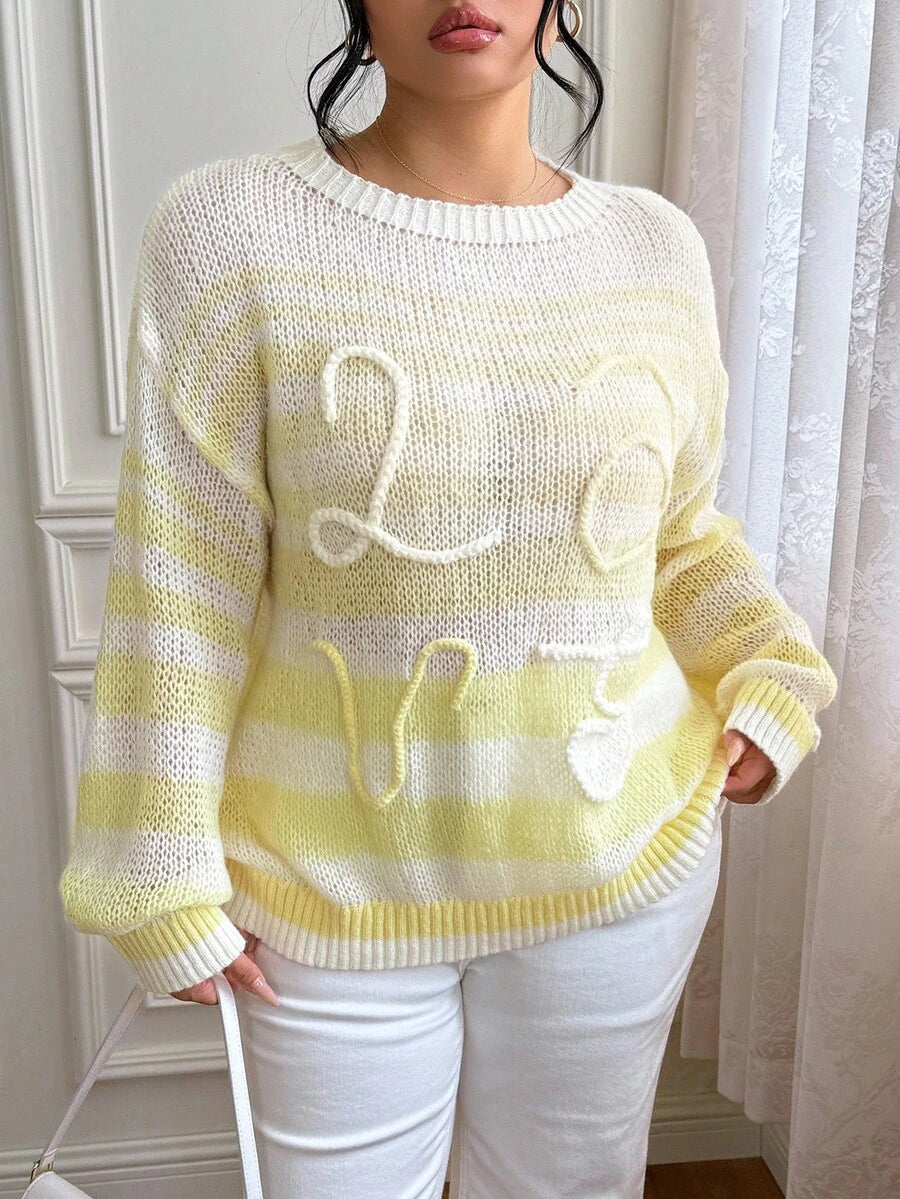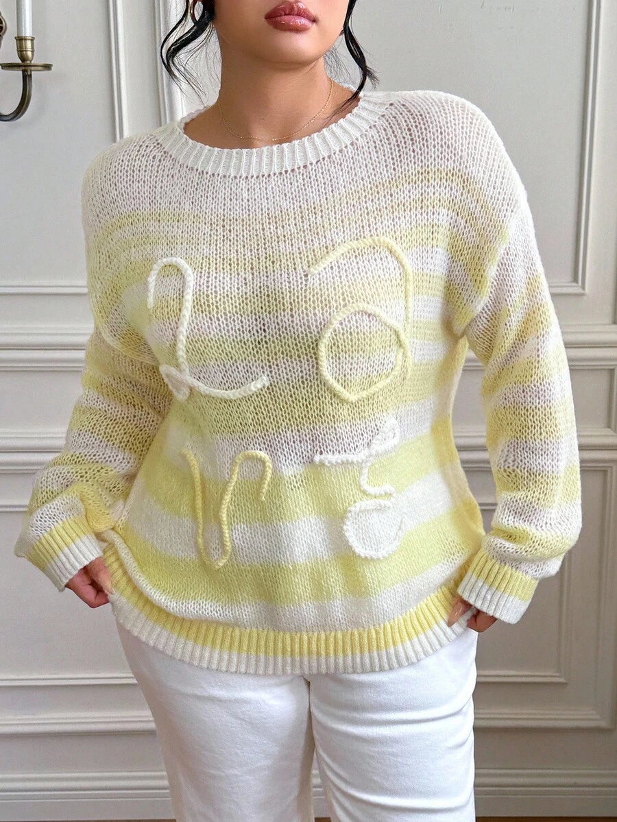 Vionelle sueter casual de cuello redondo de punto con rayas, calado y bordado de letras para mujer de talla grande