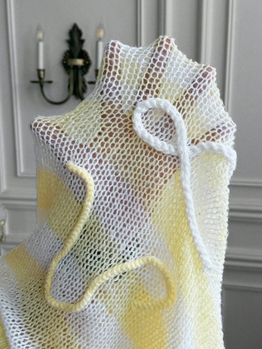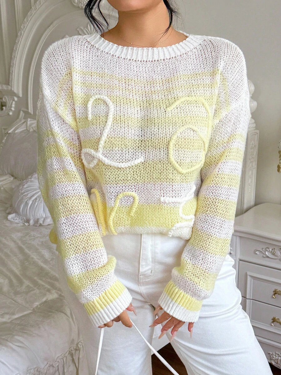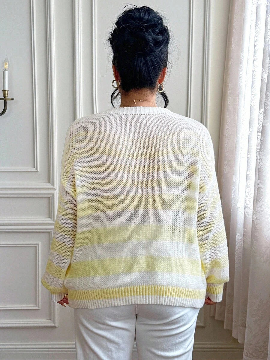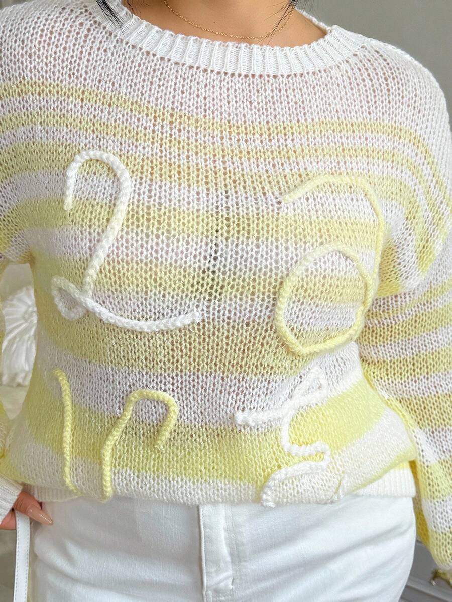 Vionelle sueter casual de cuello redondo de punto con rayas, calado y bordado de letras para mujer de talla grande