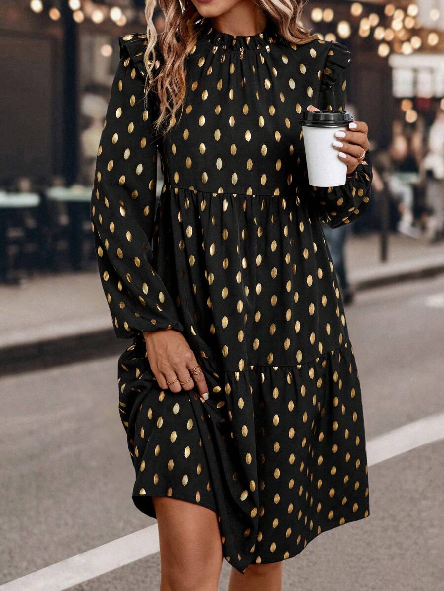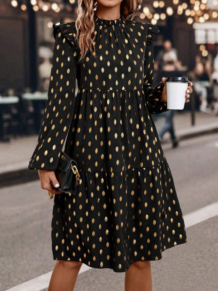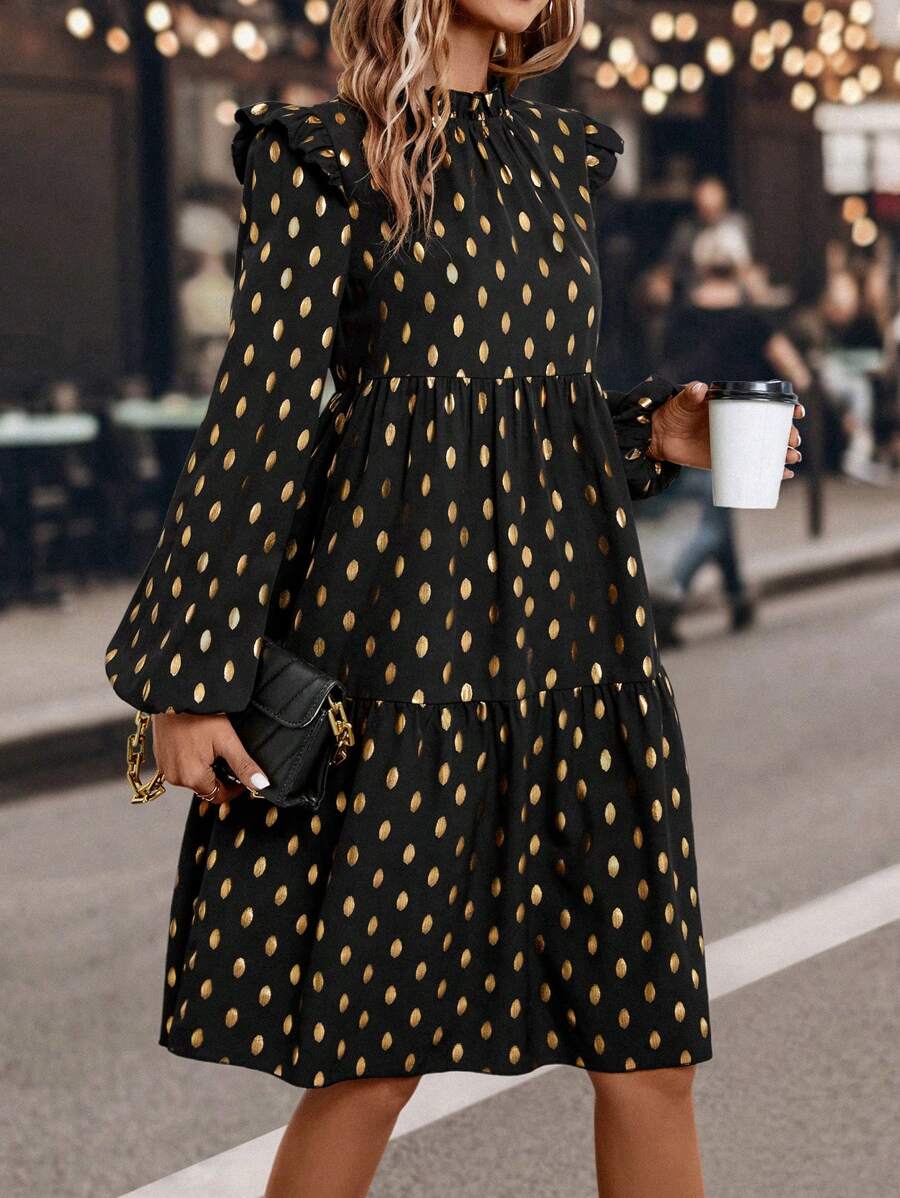 Vestido con estampado de lunares dorados ribete con fruncido de manga farol