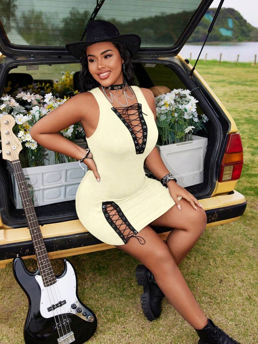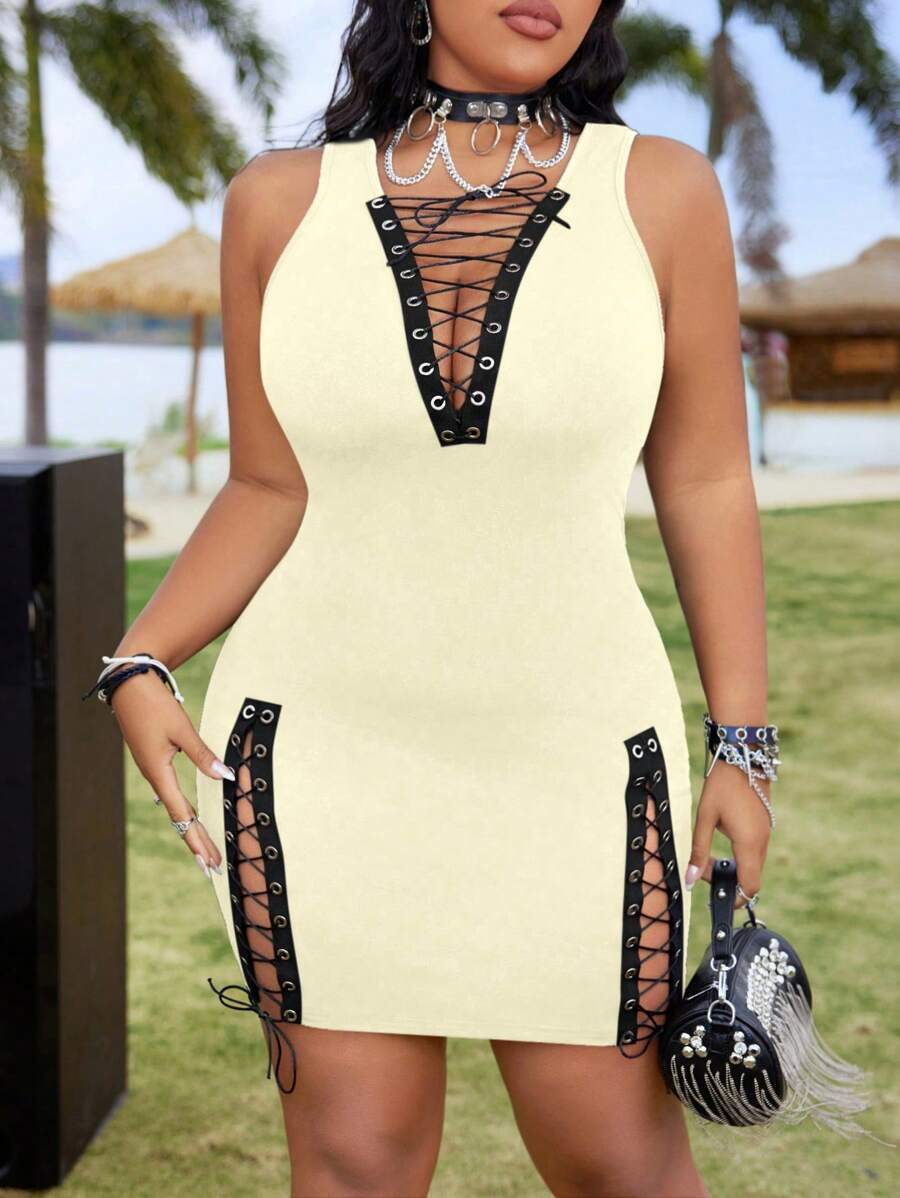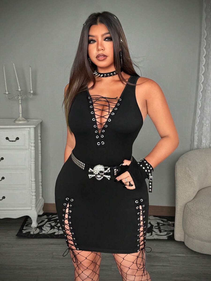 Whyspr mini vestido atractivo sin mangas con cordones para mujer de talla grande