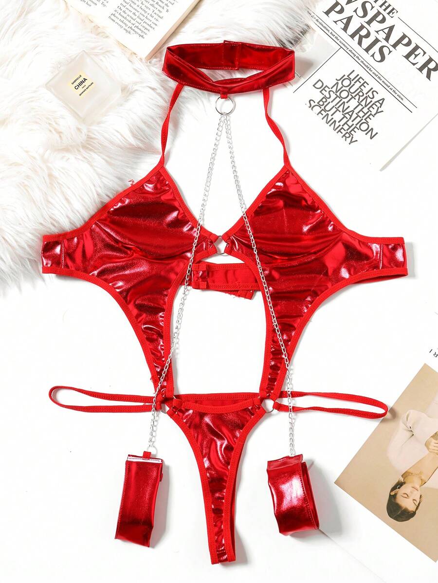 1 pieza enterizo clasico y sexy con espalda abierta y cordones, disfraz de juego de roles con esposas negro brillante, para rave