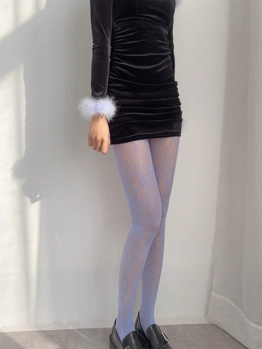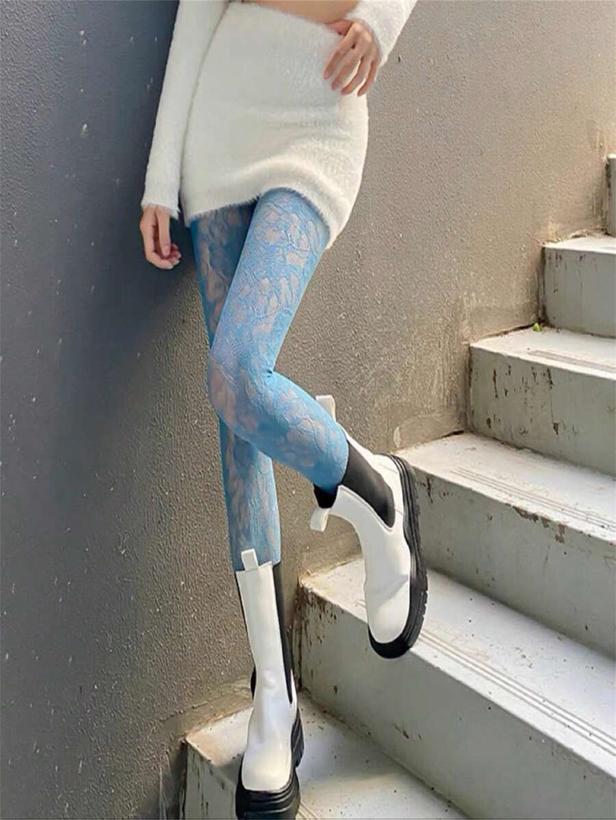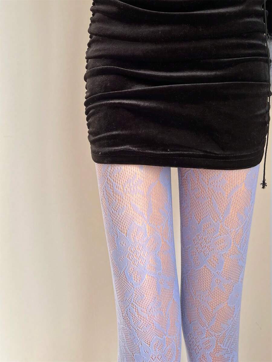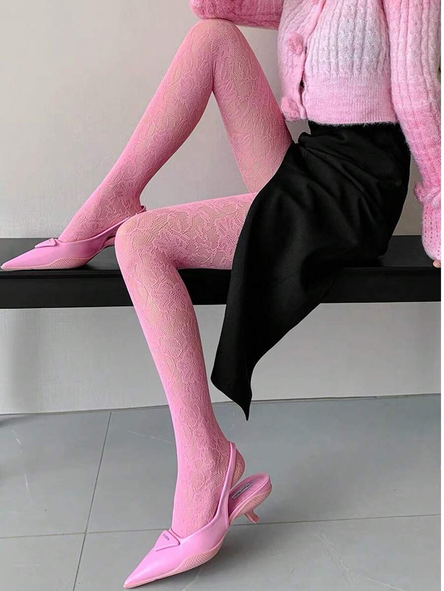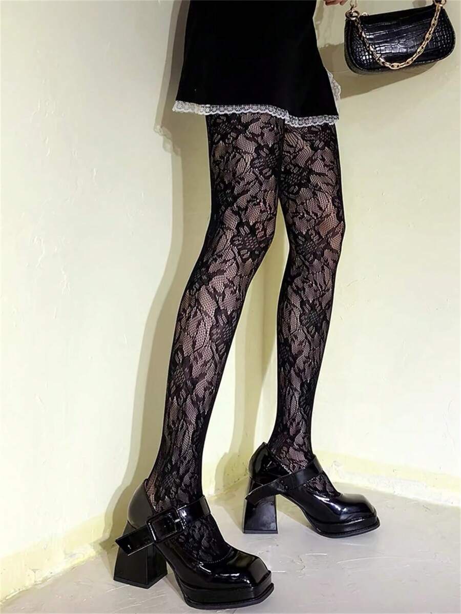 Medias de red coloridas para mujeres / ninas con patron floral en la parte inferior, red de malla jacquard hueca, estilo dulce y fresco