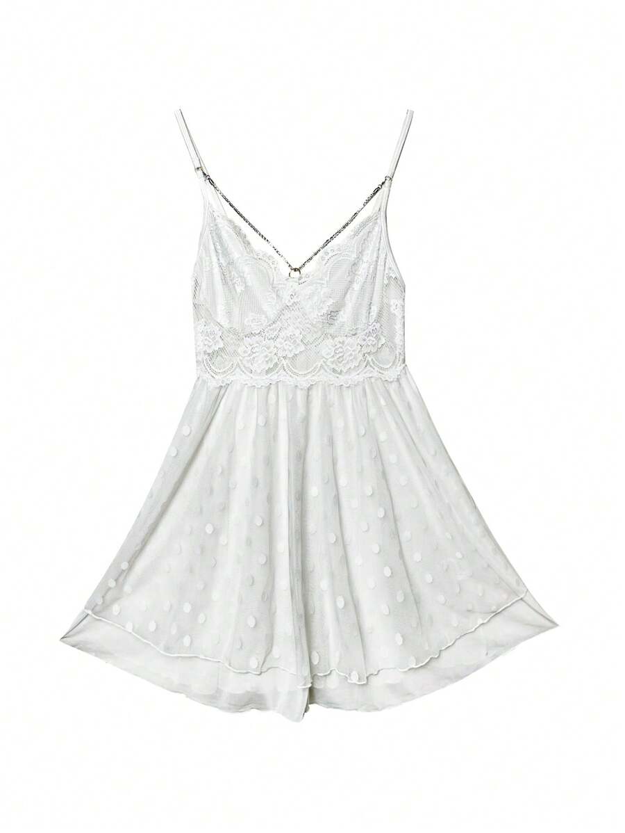 Vestido de noche de pijama para damas con contraste de encaje, decoracion de malla, strass y cadena, sin mangas