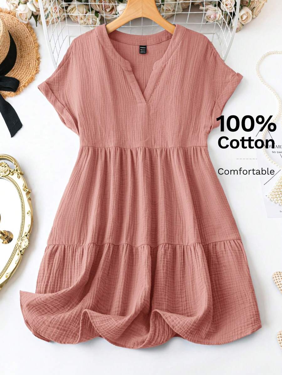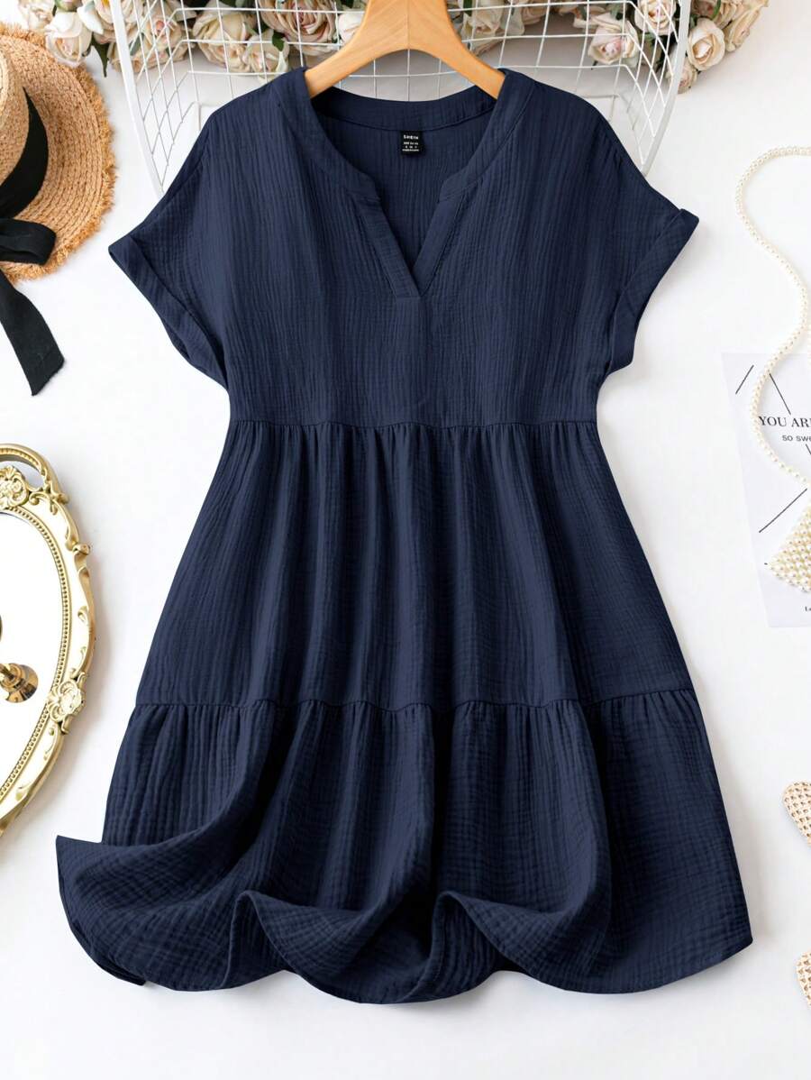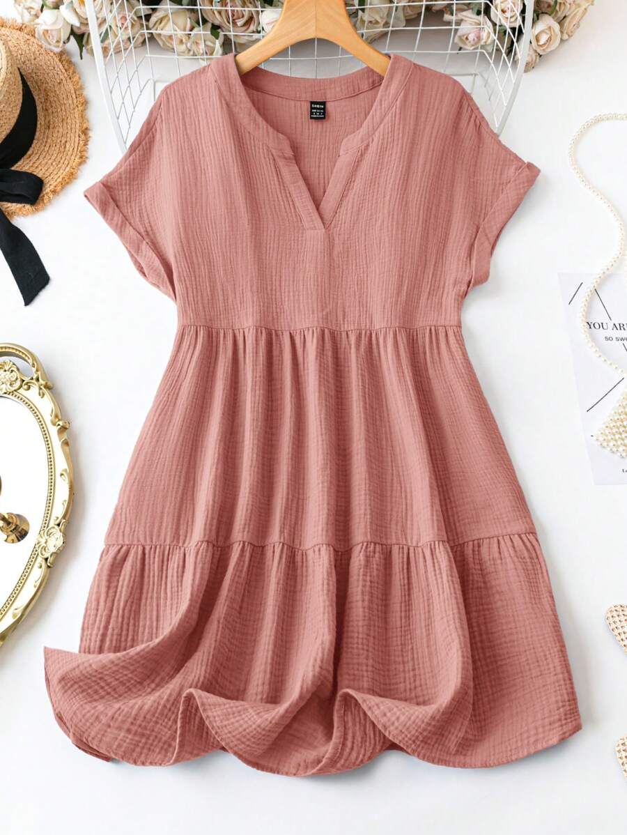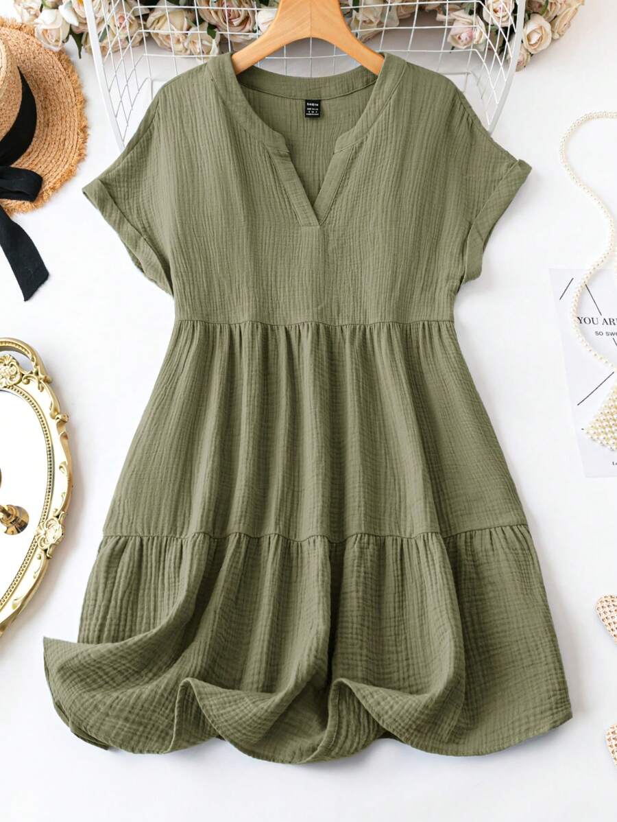 Vestido de muneca de bebe de manga corta y ala de murcielago con volantes, escote de pico con muescas y unicolor para mujer en verano