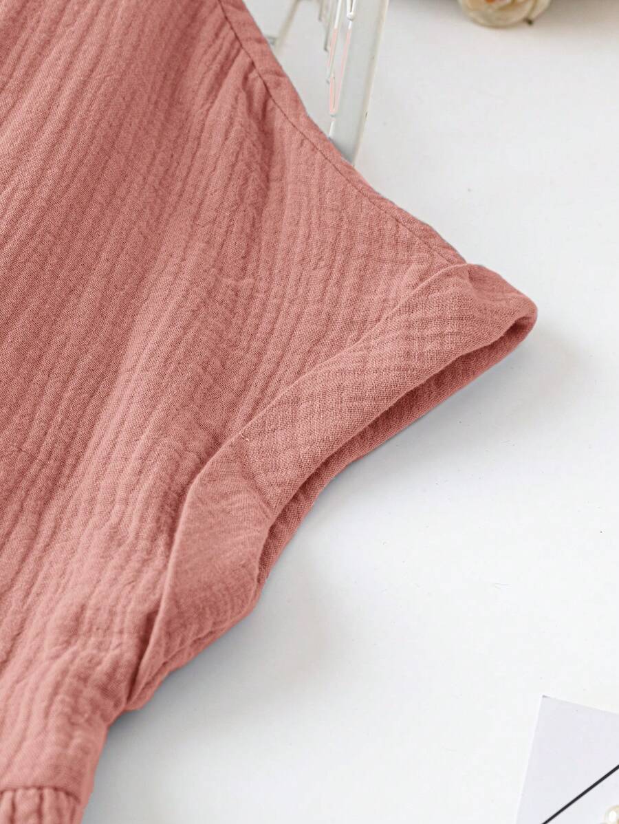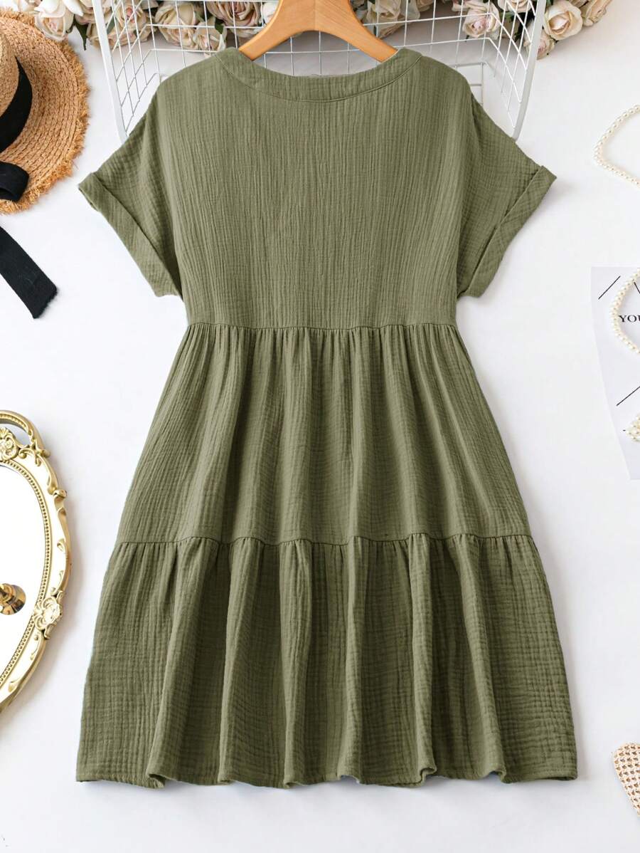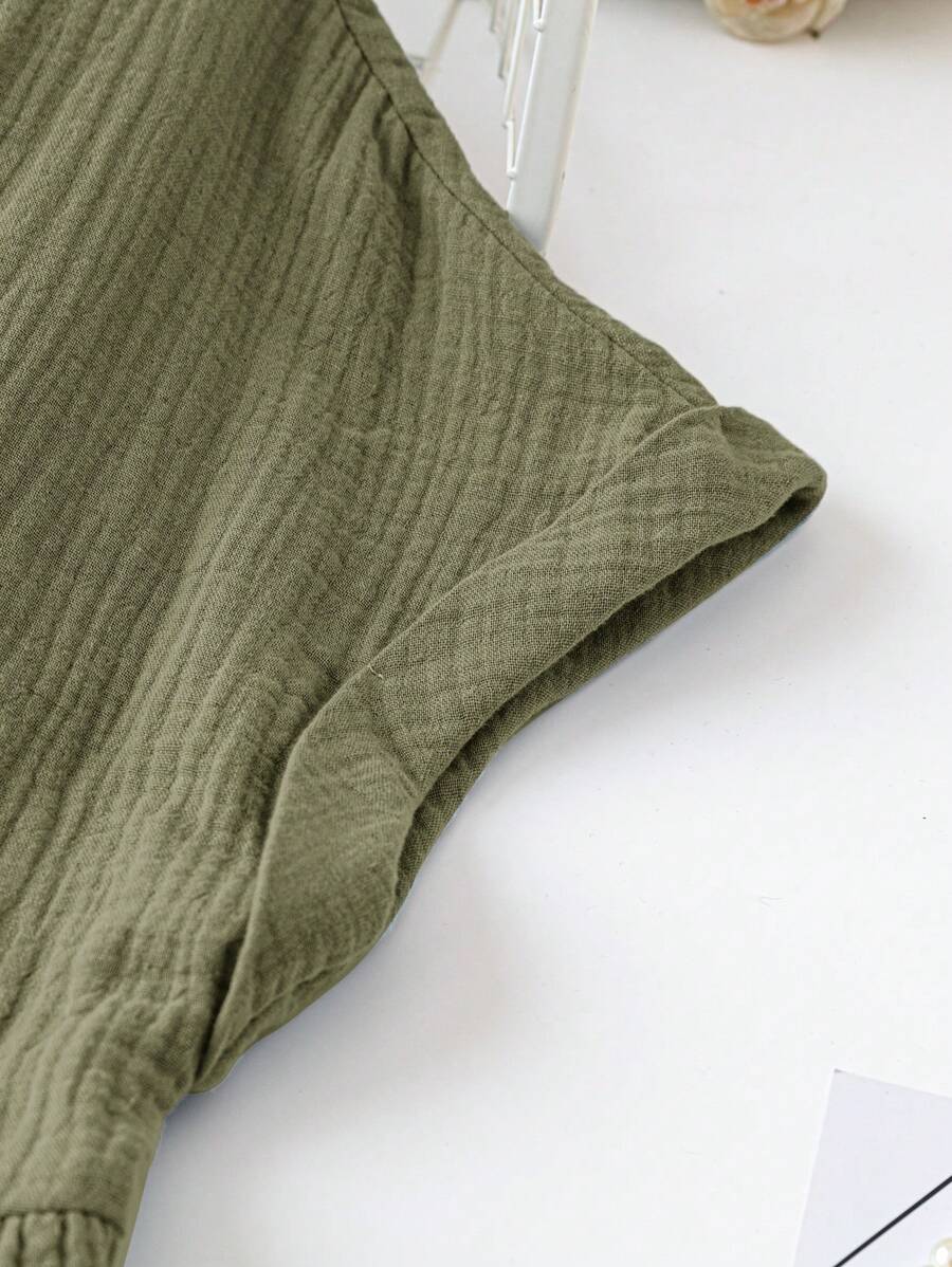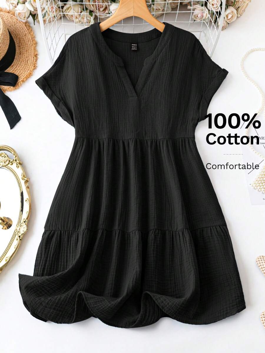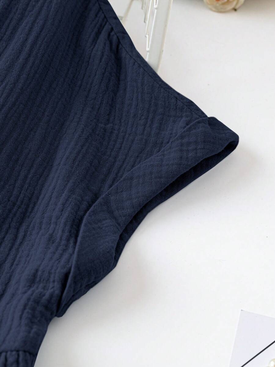 Vestido de muneca de bebe de manga corta y ala de murcielago con volantes, escote de pico con muescas y unicolor para mujer en verano