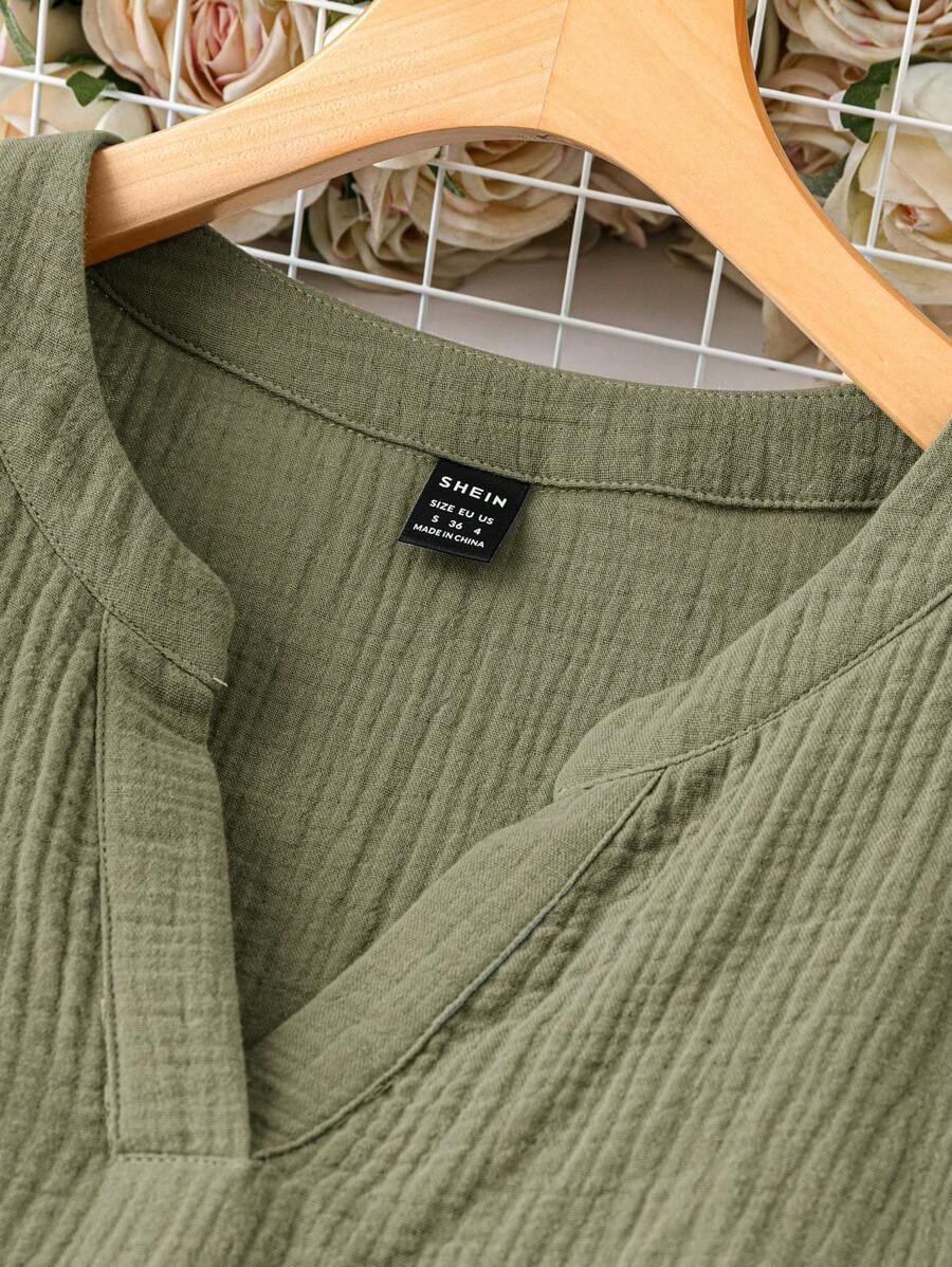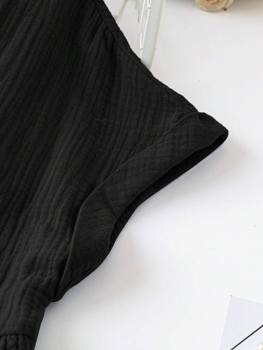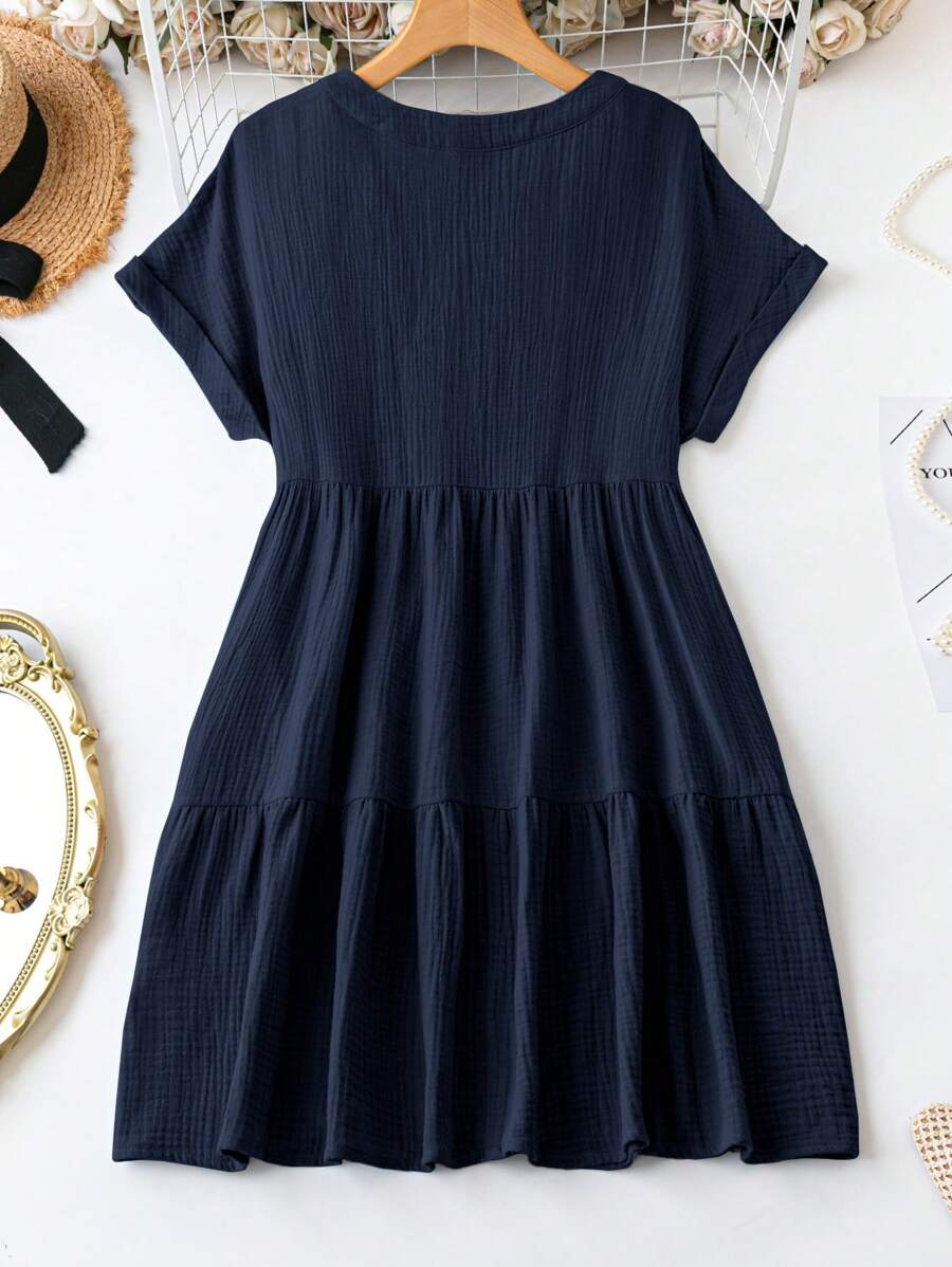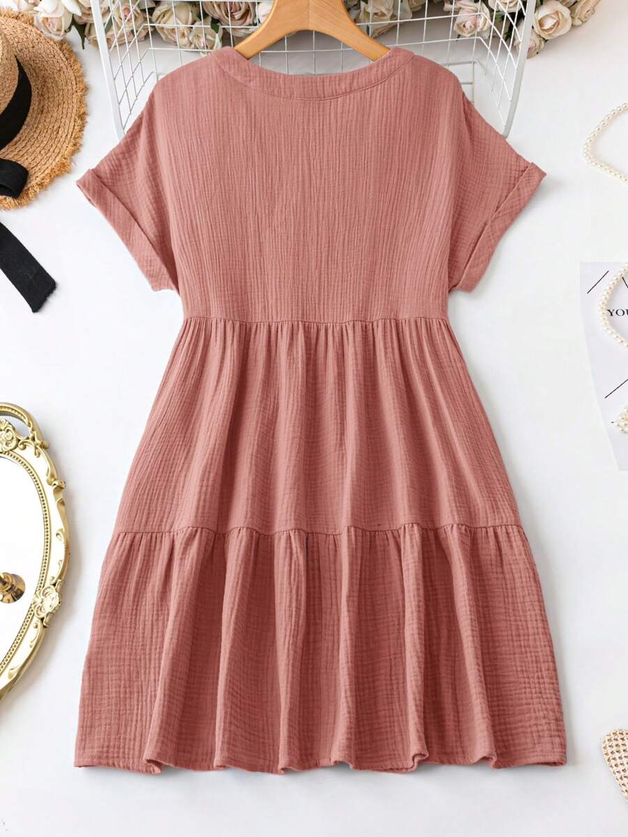 Vestido de muneca de bebe de manga corta y ala de murcielago con volantes, escote de pico con muescas y unicolor para mujer en verano