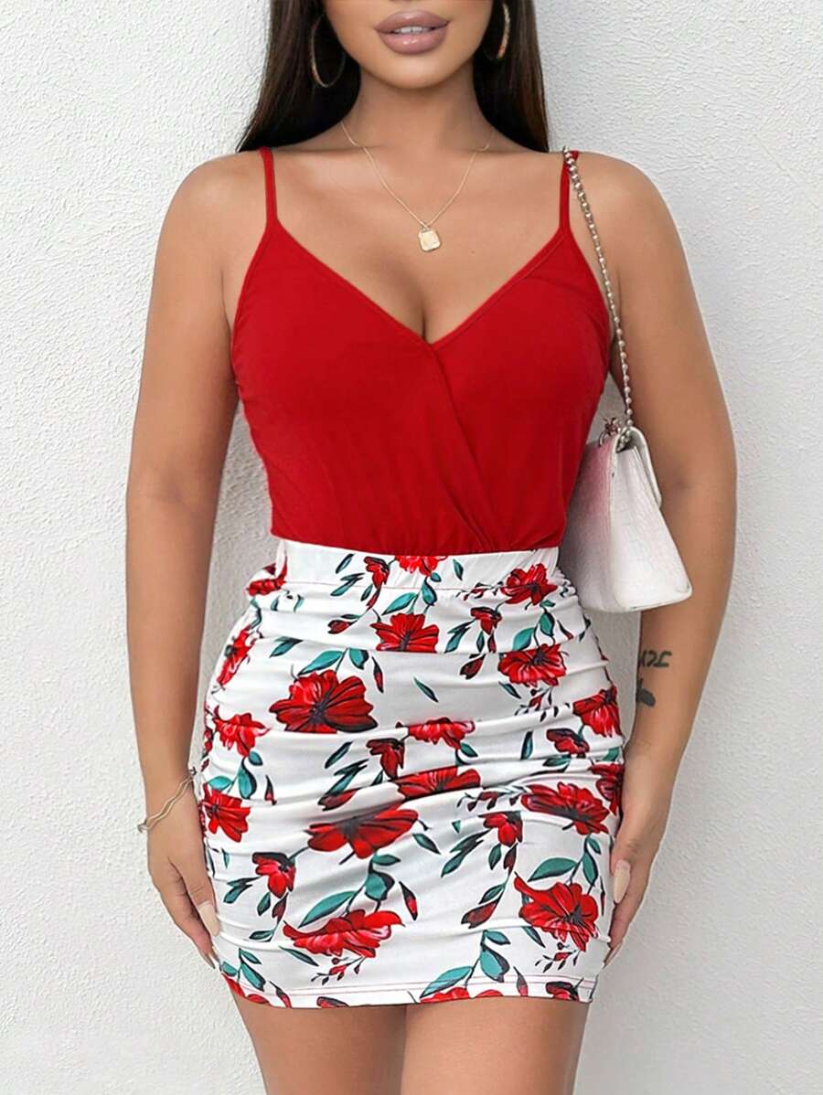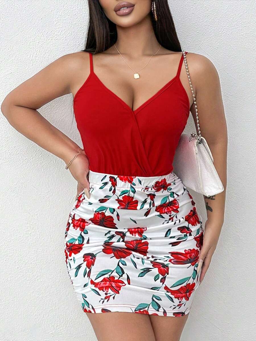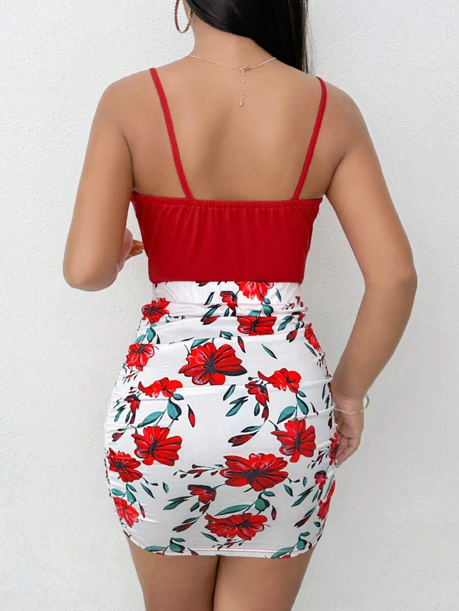 2 piezas/conjunto sexy mujer parte superior de tirantes cruzados con estampado floral rojo y falda con volantes