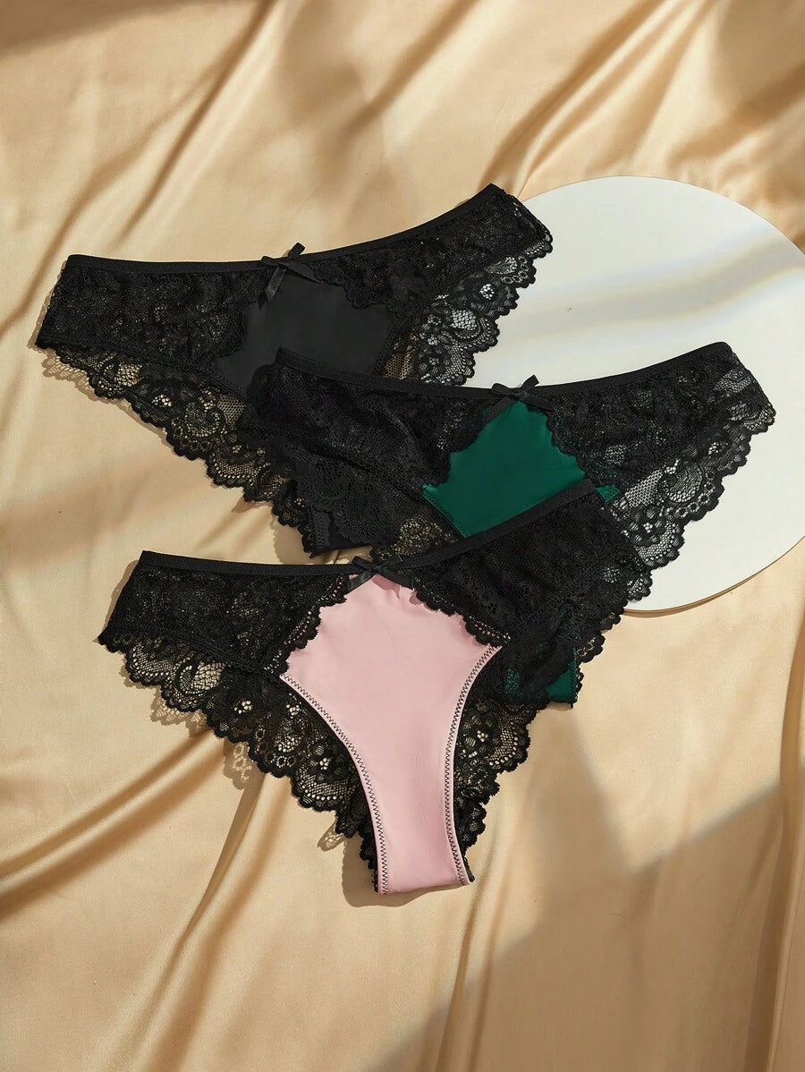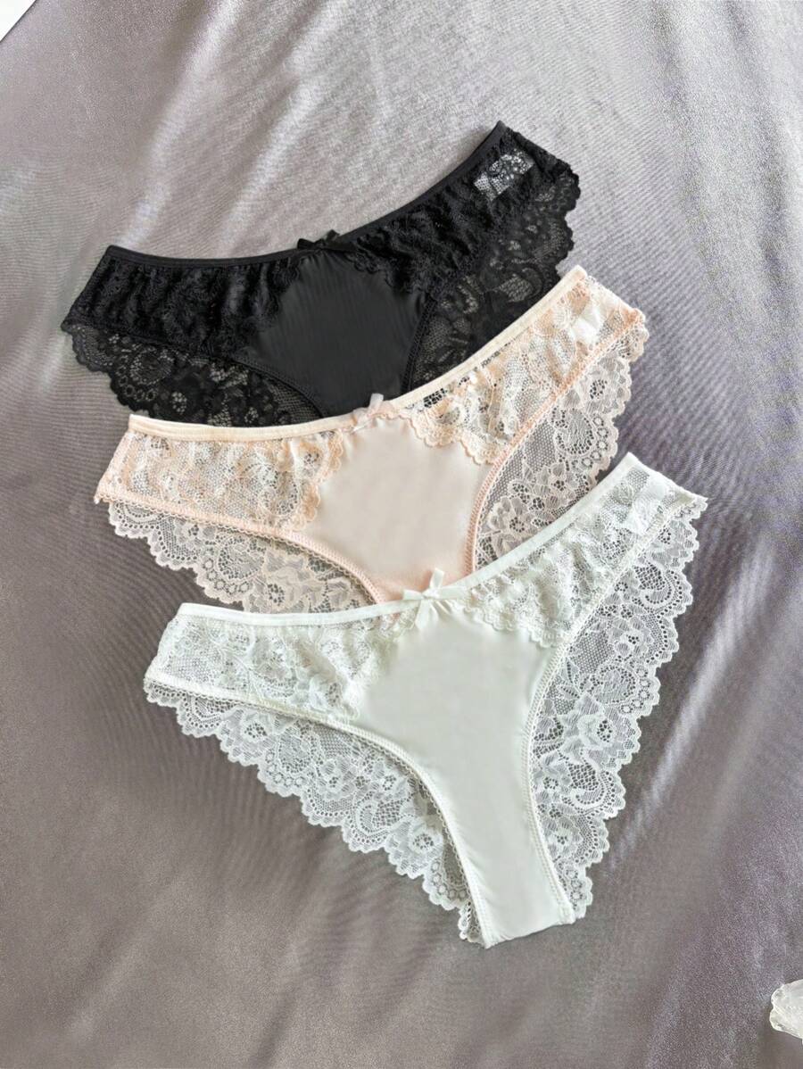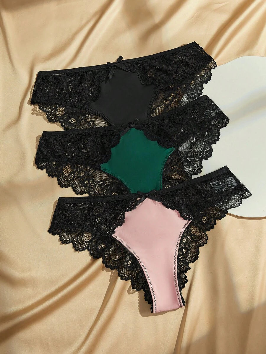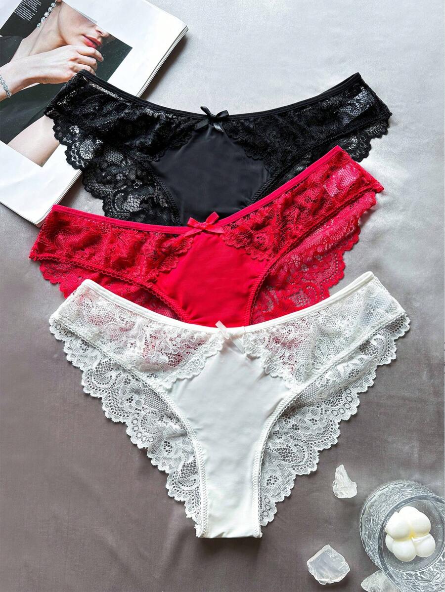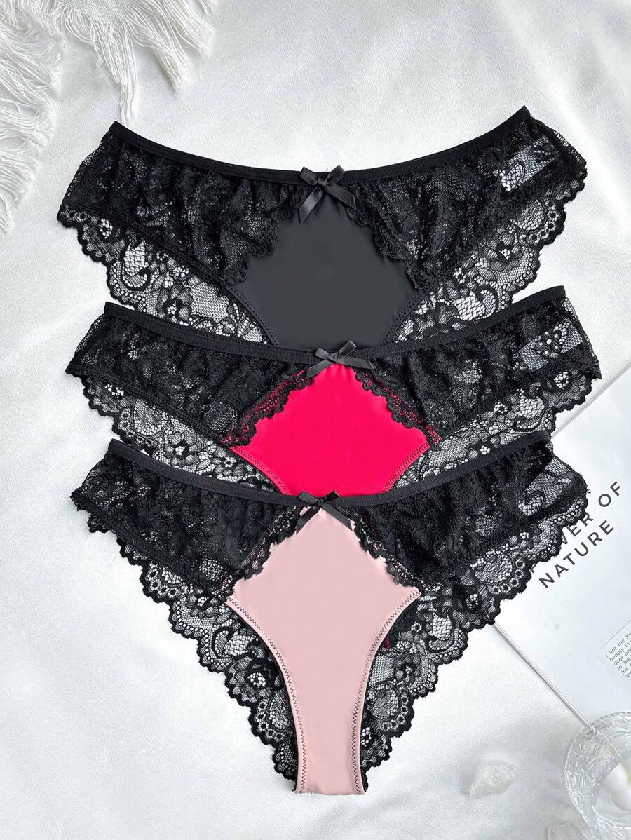 3 piezas de ropa interior de mujer de unicolor con encaje y decoracion de mono en la cintura baja