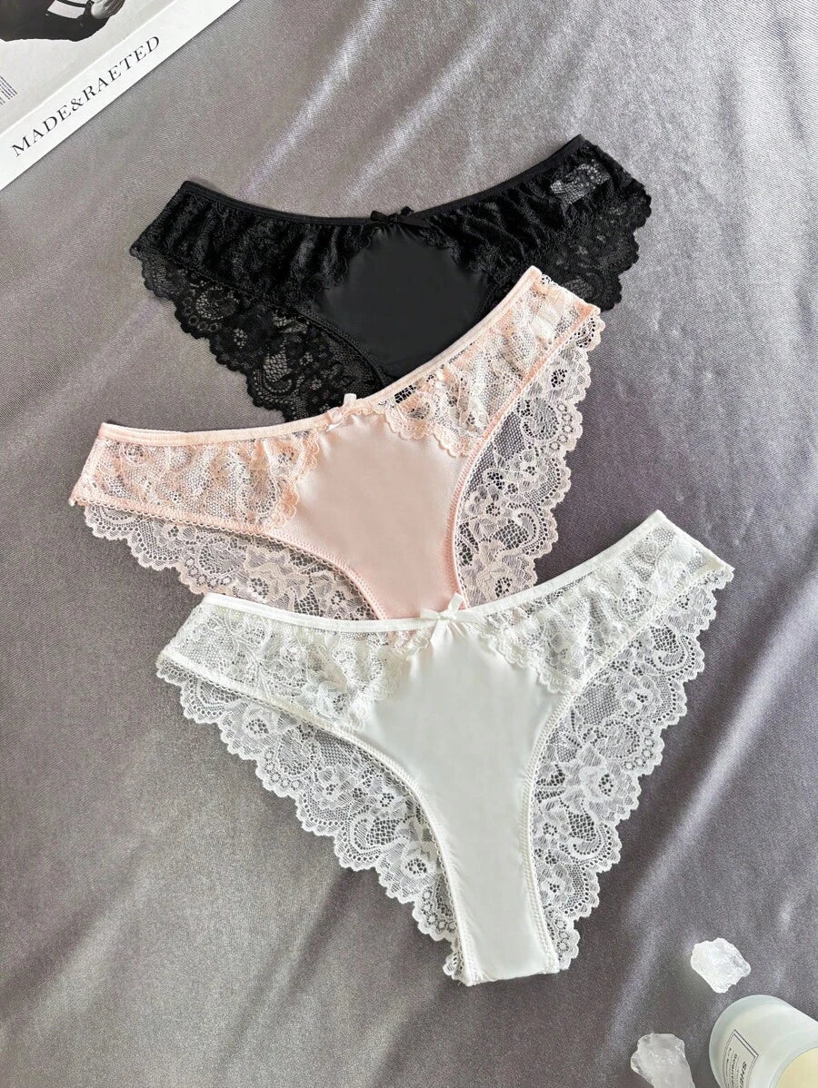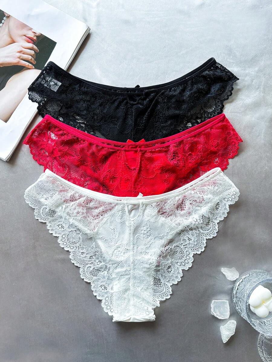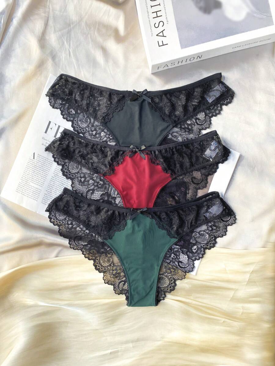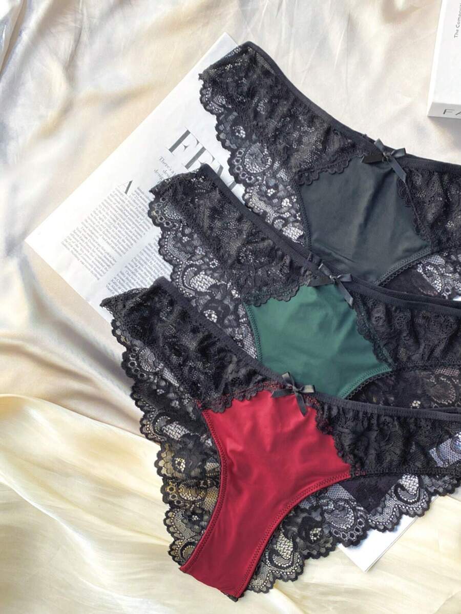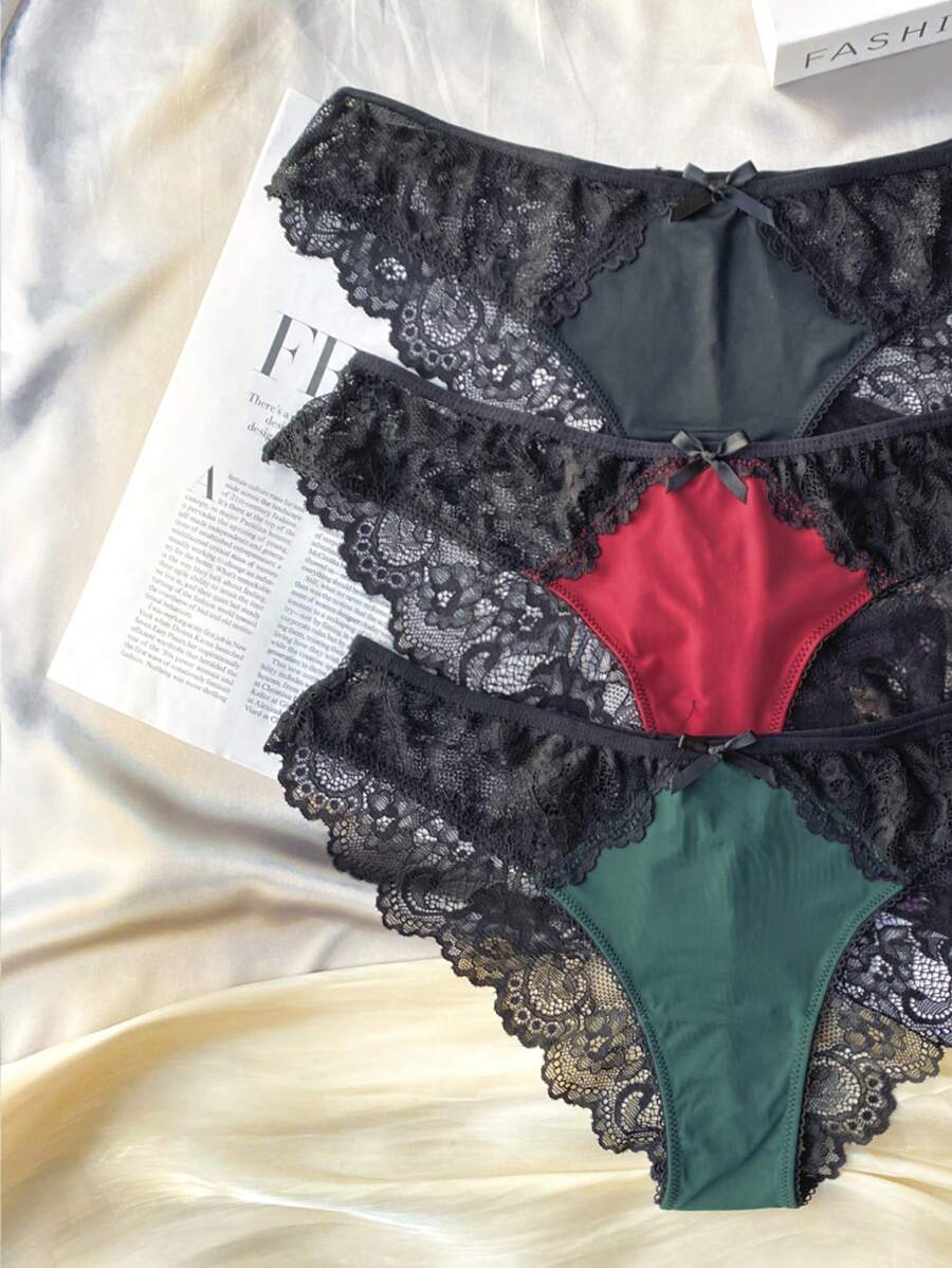 3 piezas de ropa interior de mujer de unicolor con encaje y decoracion de mono en la cintura baja