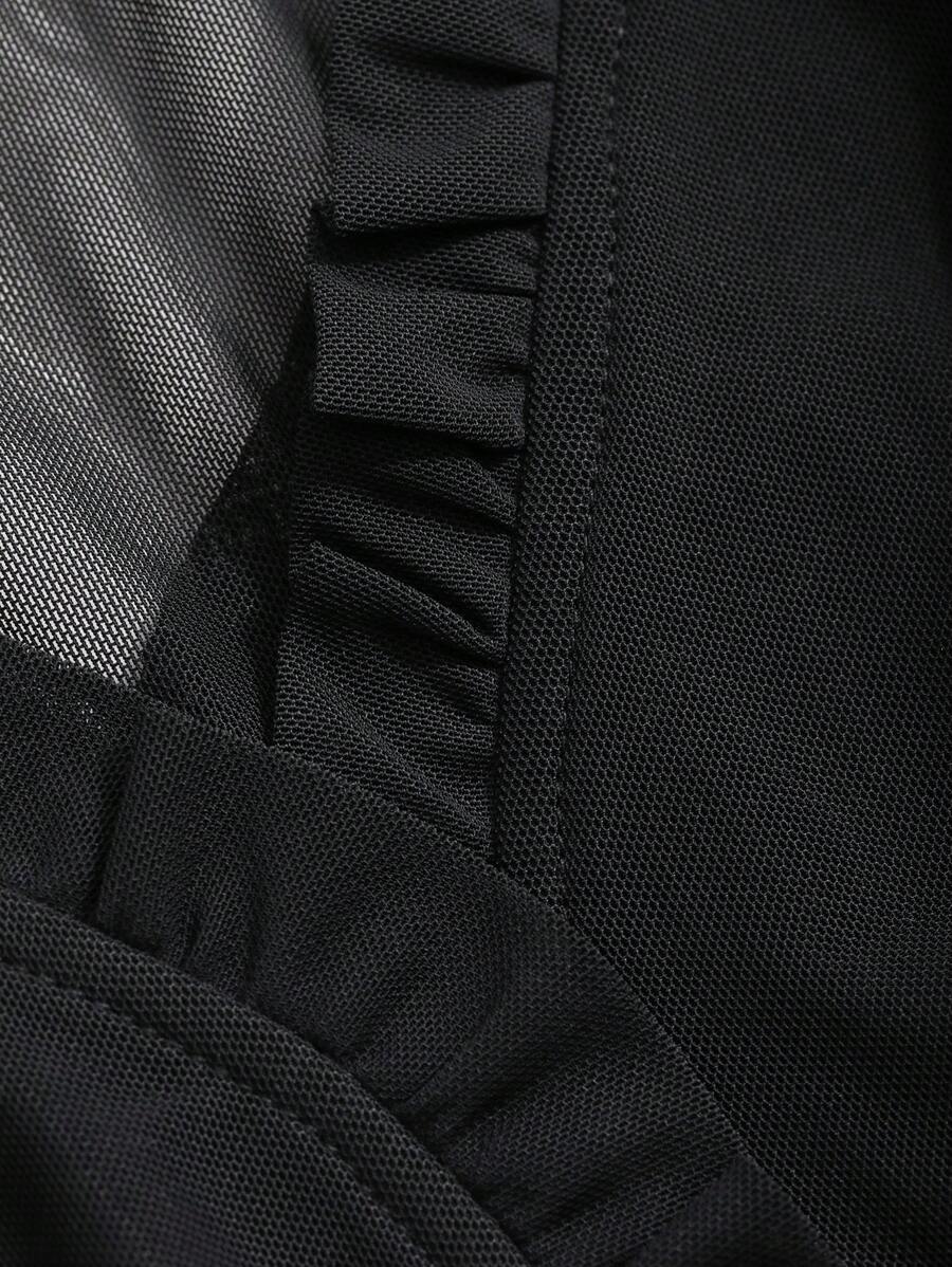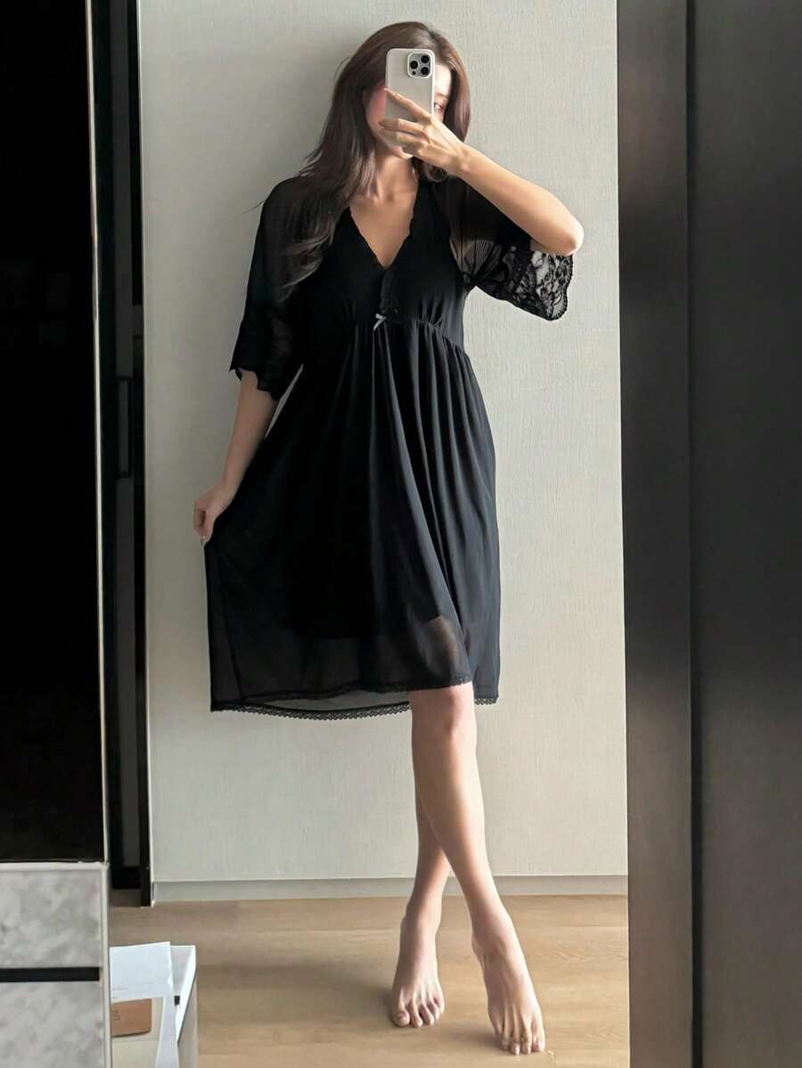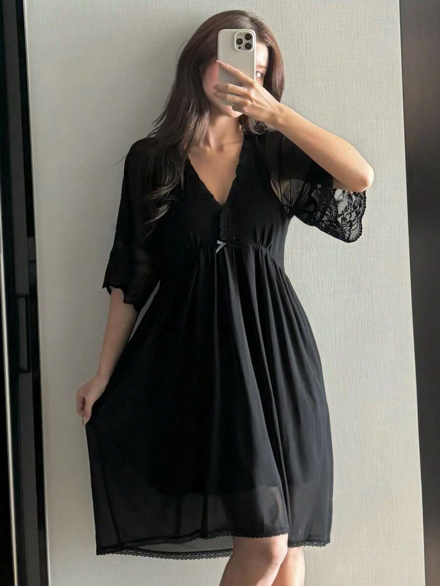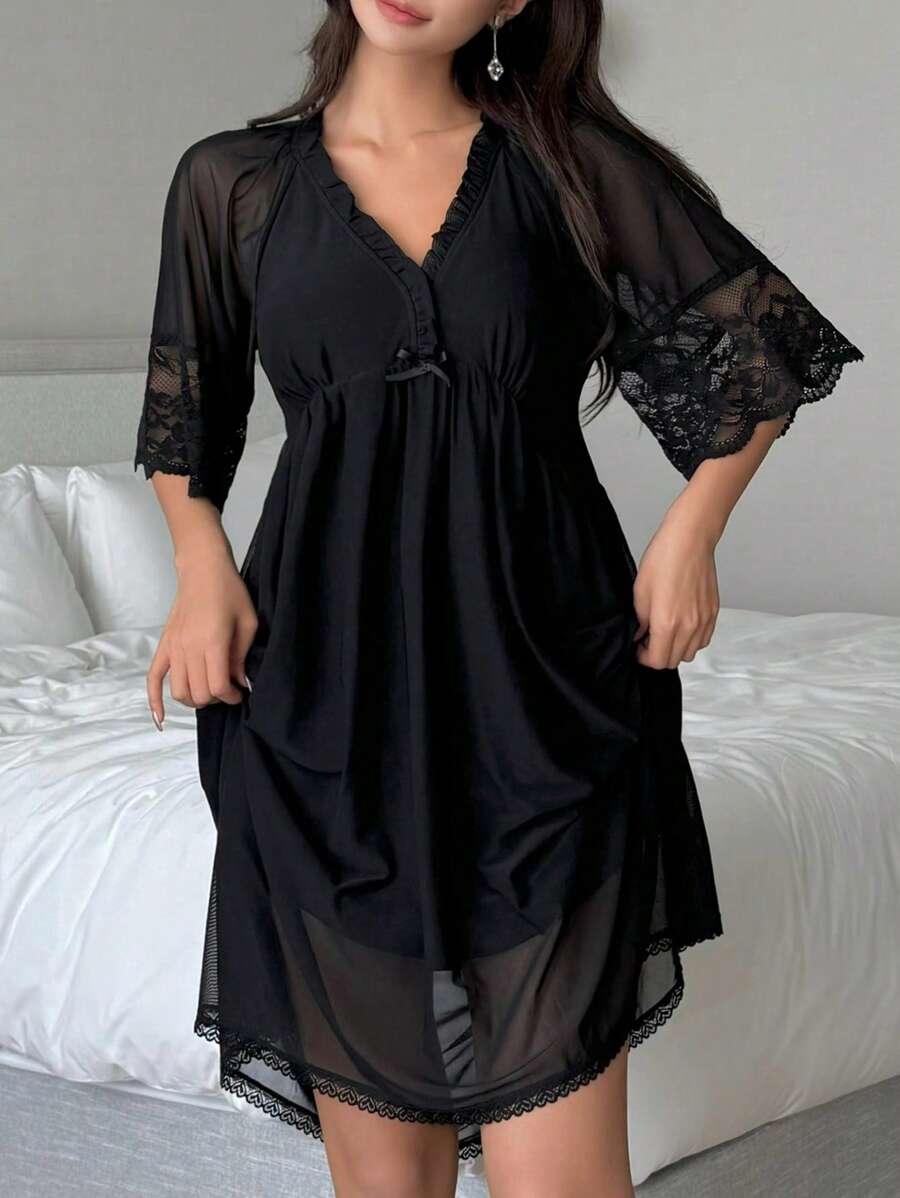 Vestido de dormir de manga corta con cuello en v y ribete de encaje con malla transparente para mujer con lazo de cinta