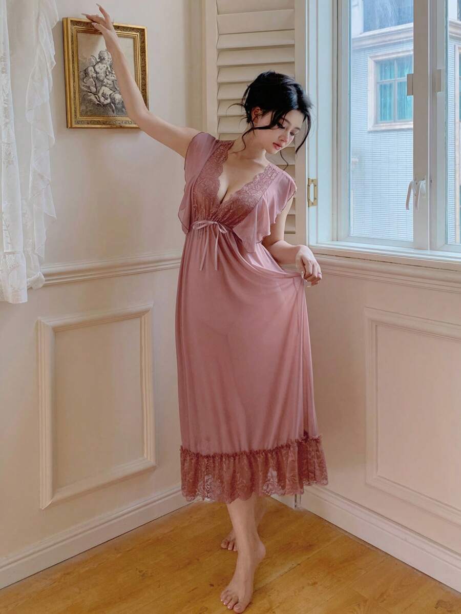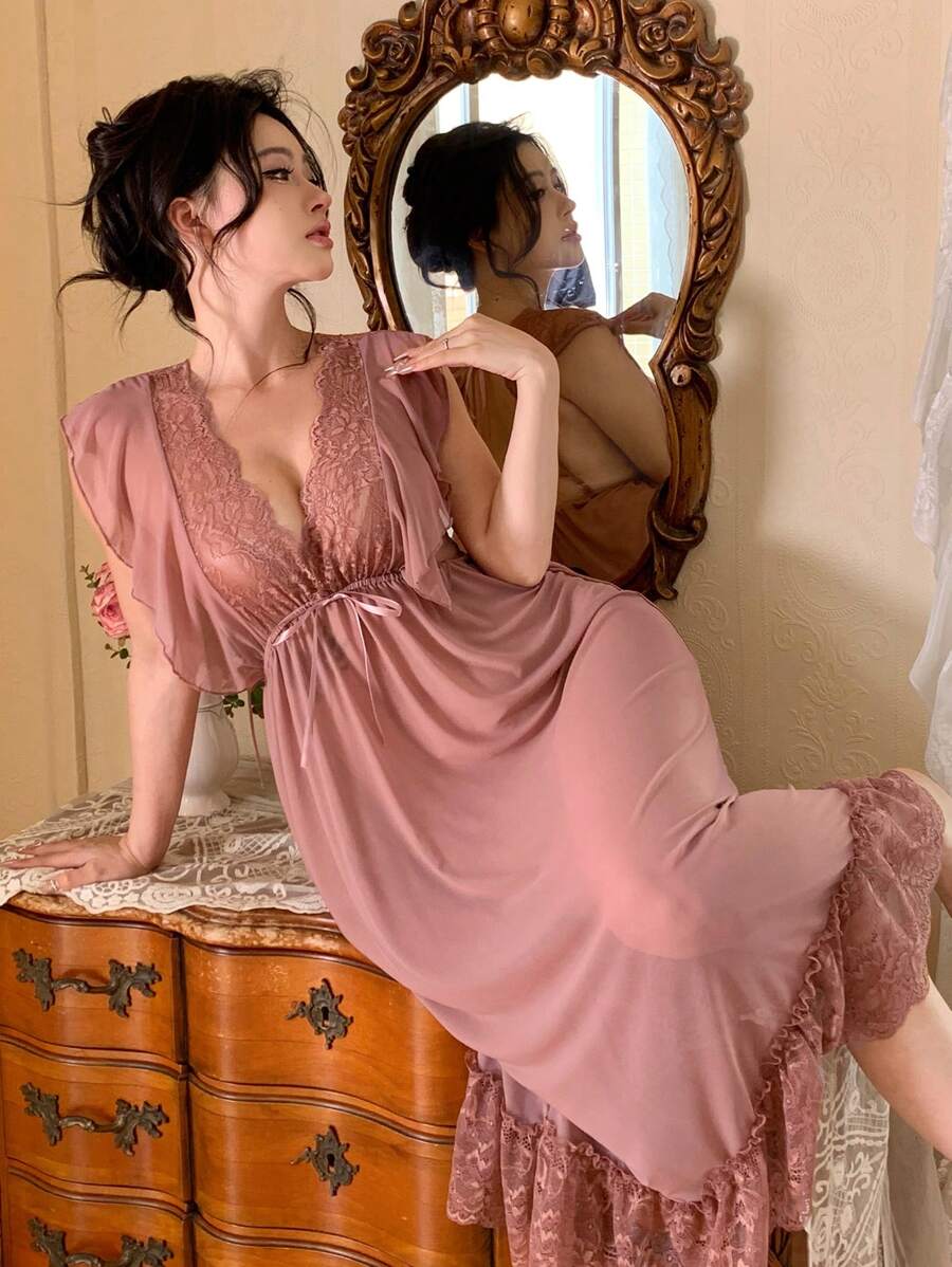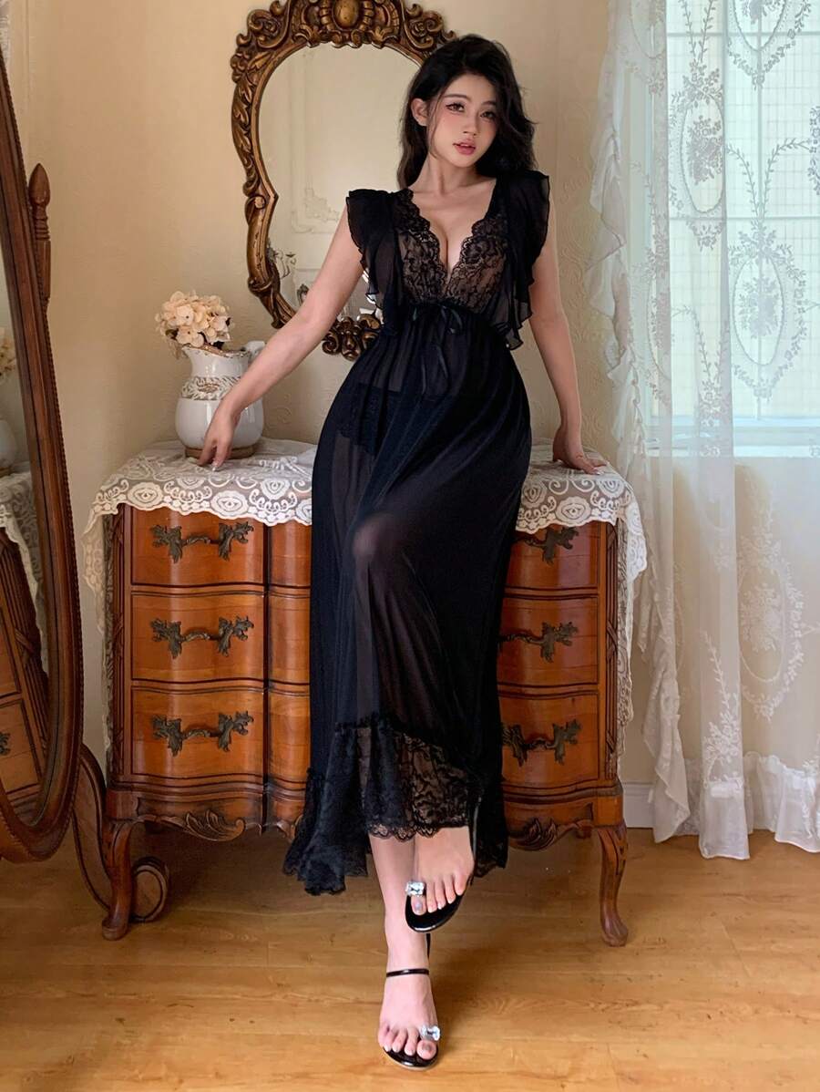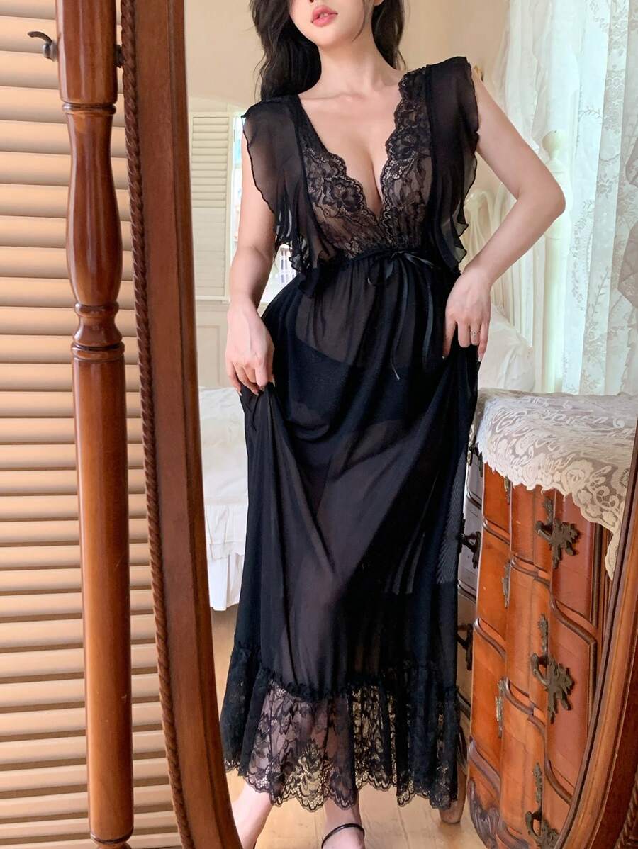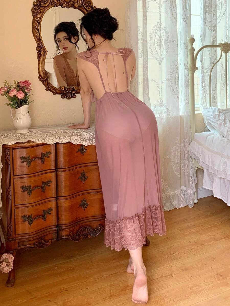 Vestido lencero con corte sexy y bajo, con contraste de encaje de malla y tirantes con lazo, de moda