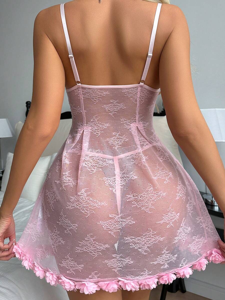 2 piezas/conjunto vestido de lenceria rosado sonador con flores aplicadas de encaje delgado y sexy