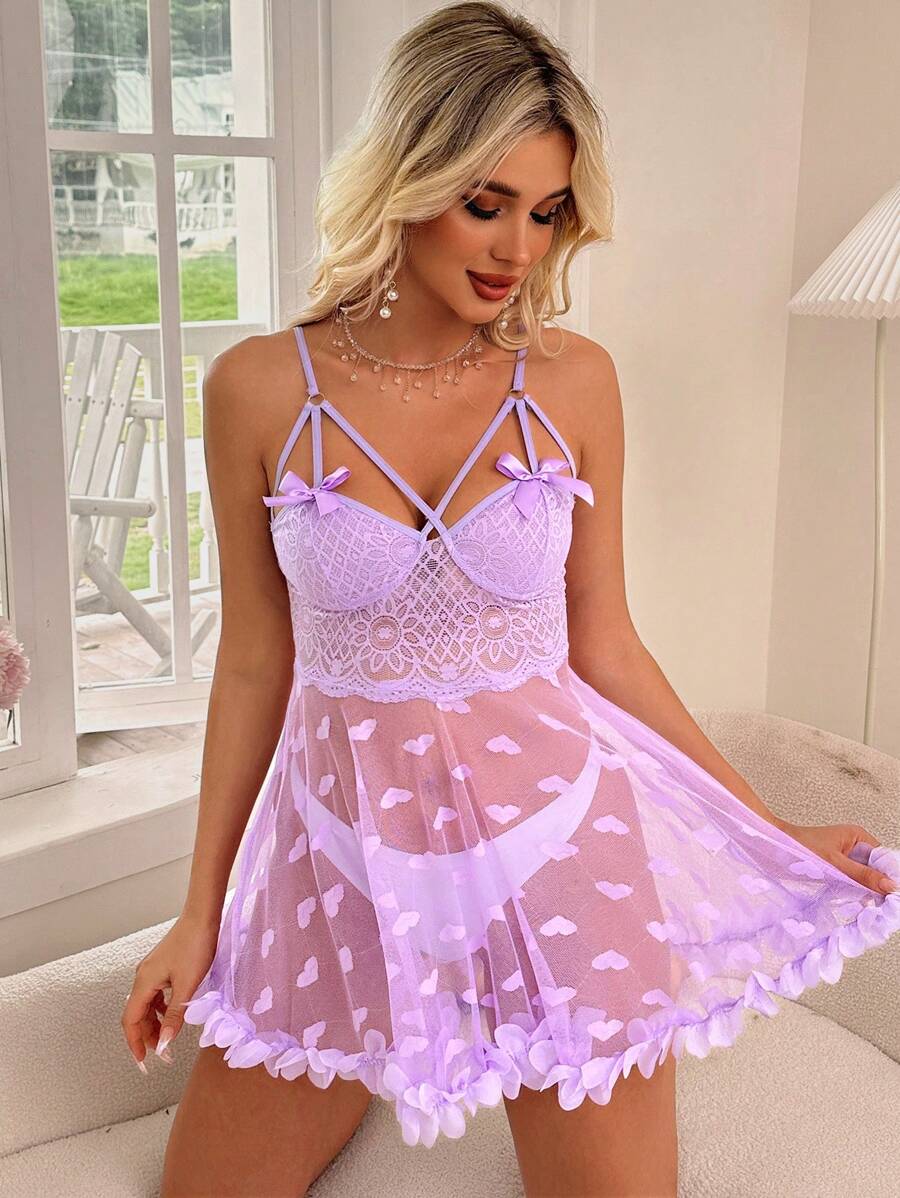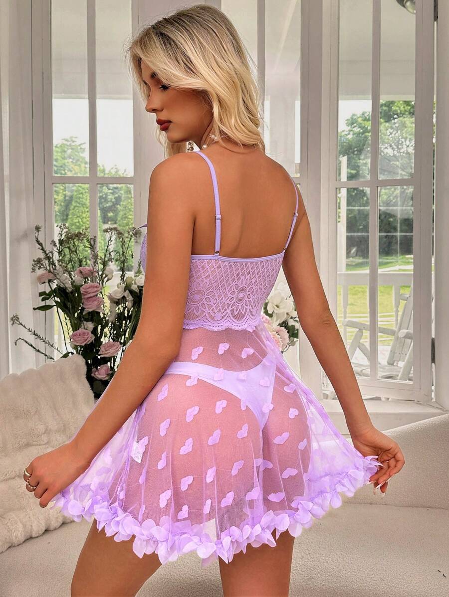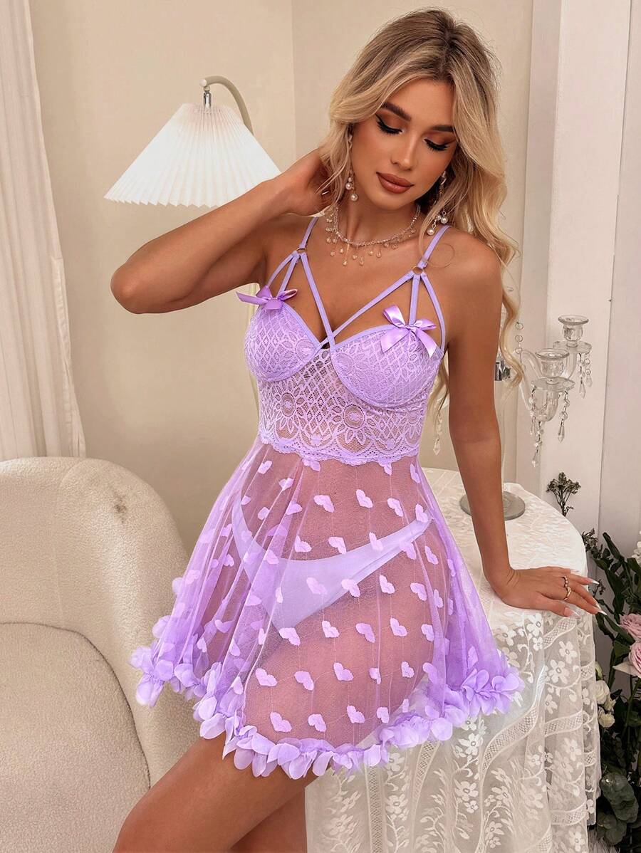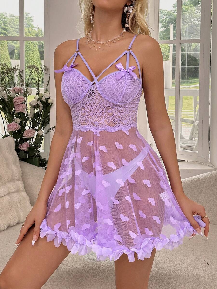 Vestido de dormir para mujer estilo cami con forma de corazon y detalles de encaje y malla empalmados