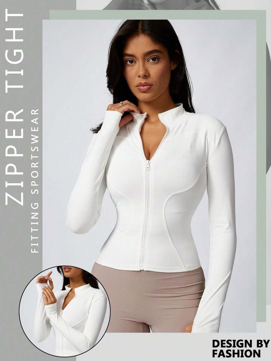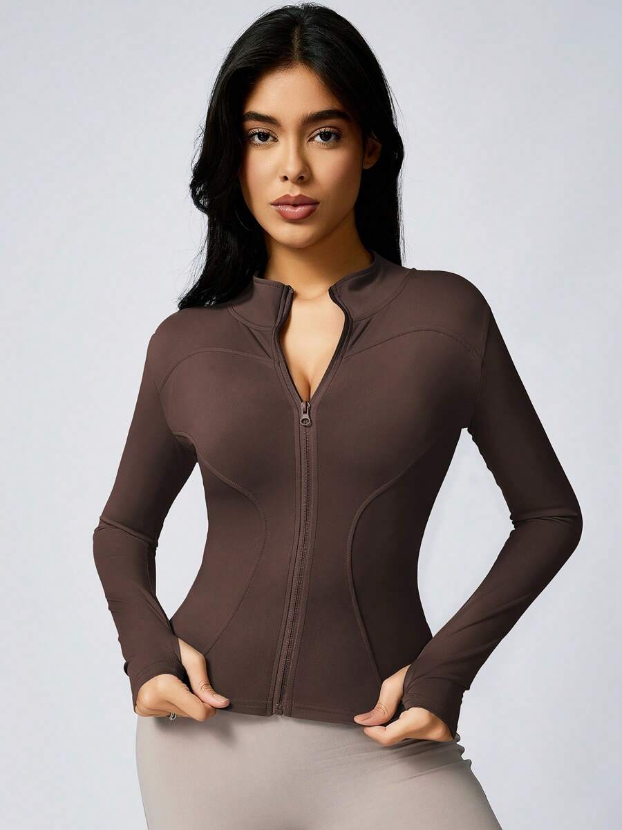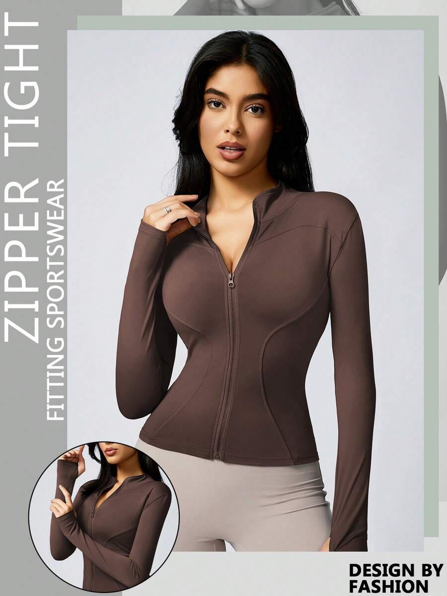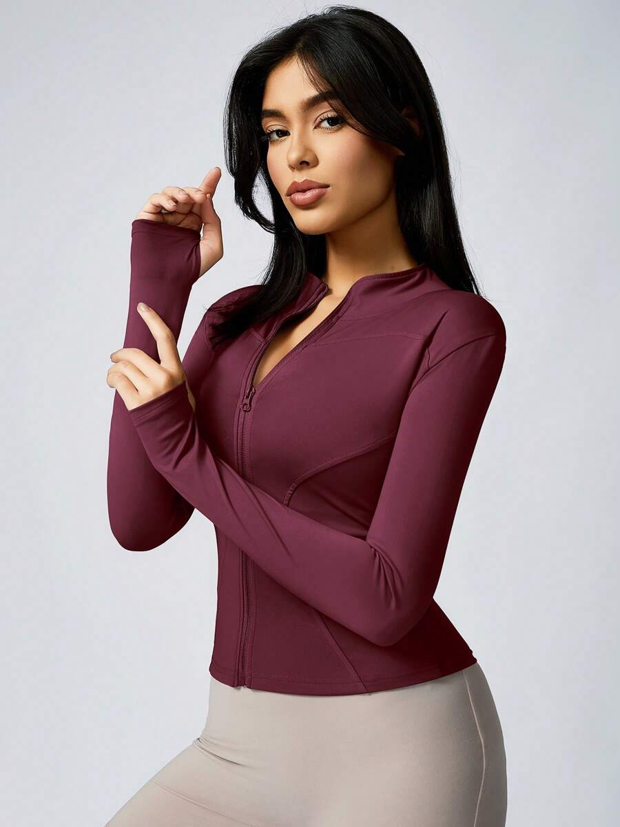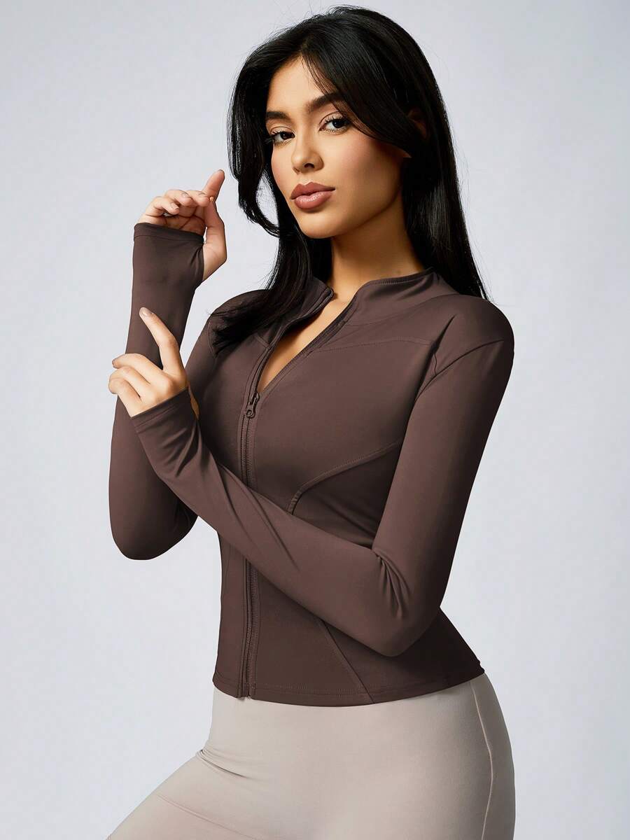 1 pieza chaqueta con cremallera de deporte de manga larga con agujero para el pulgar, unicolor, para yoga y uso diario en otono, para mujer