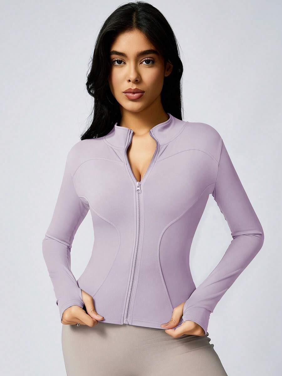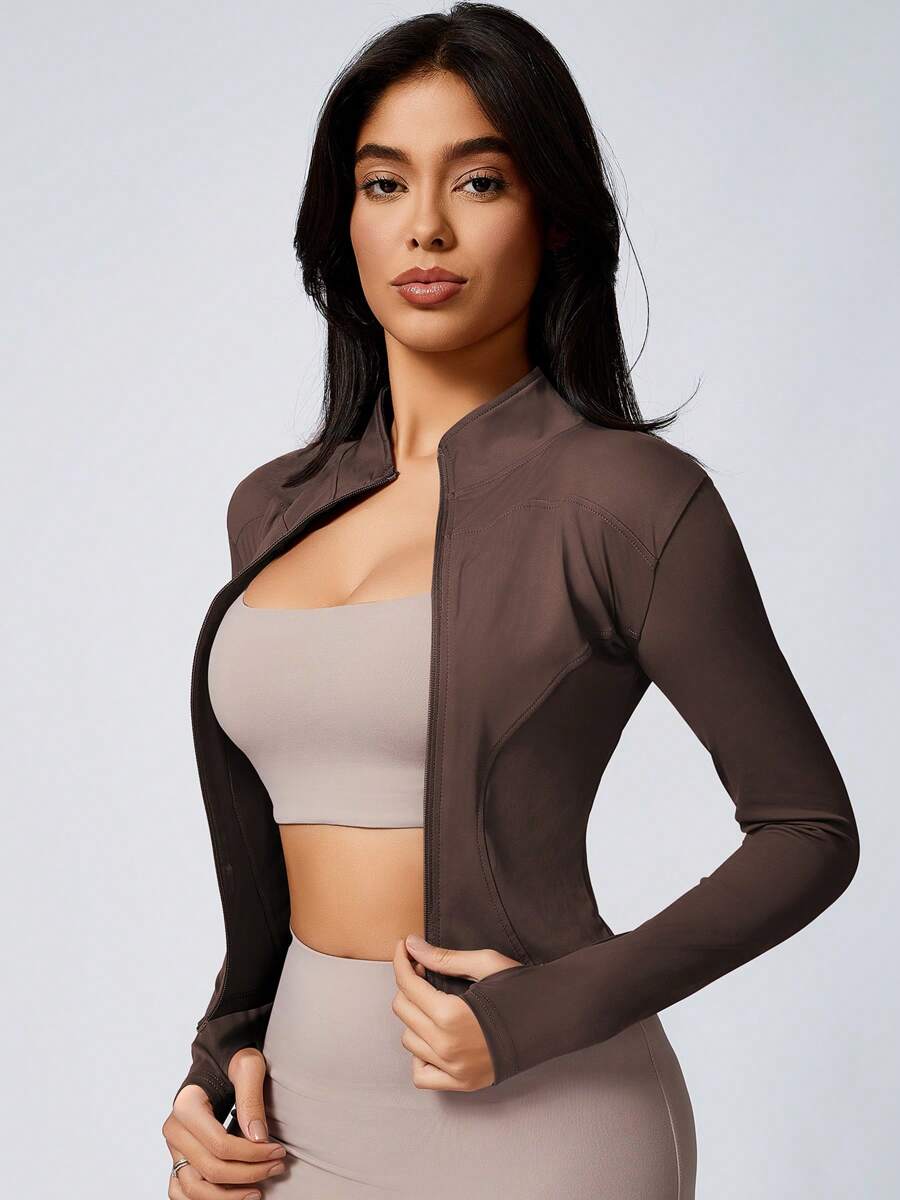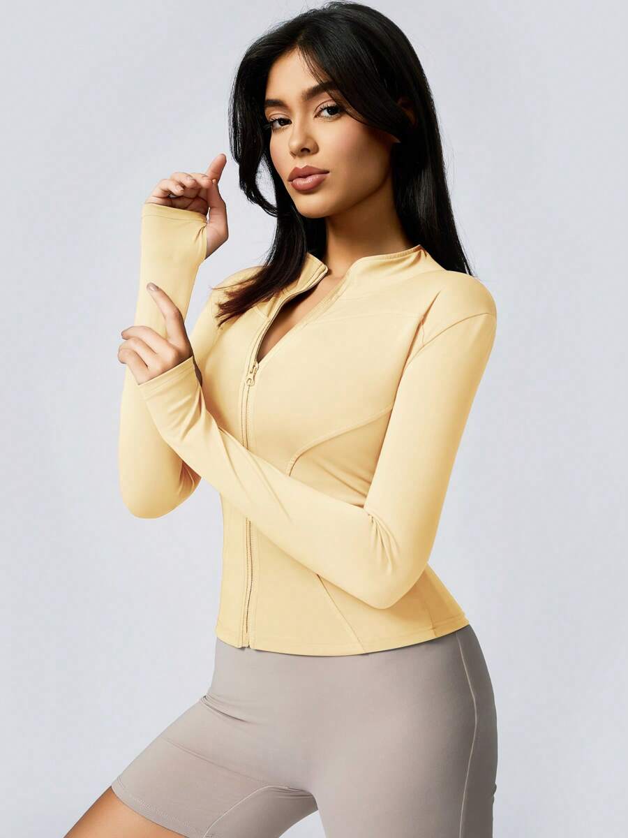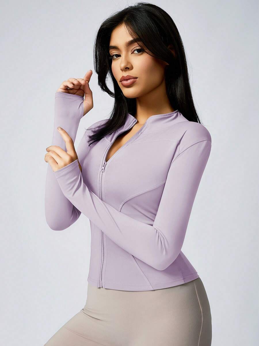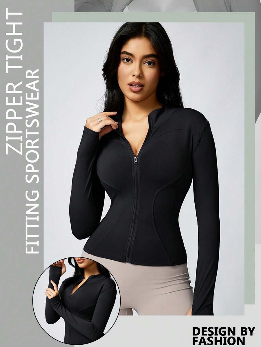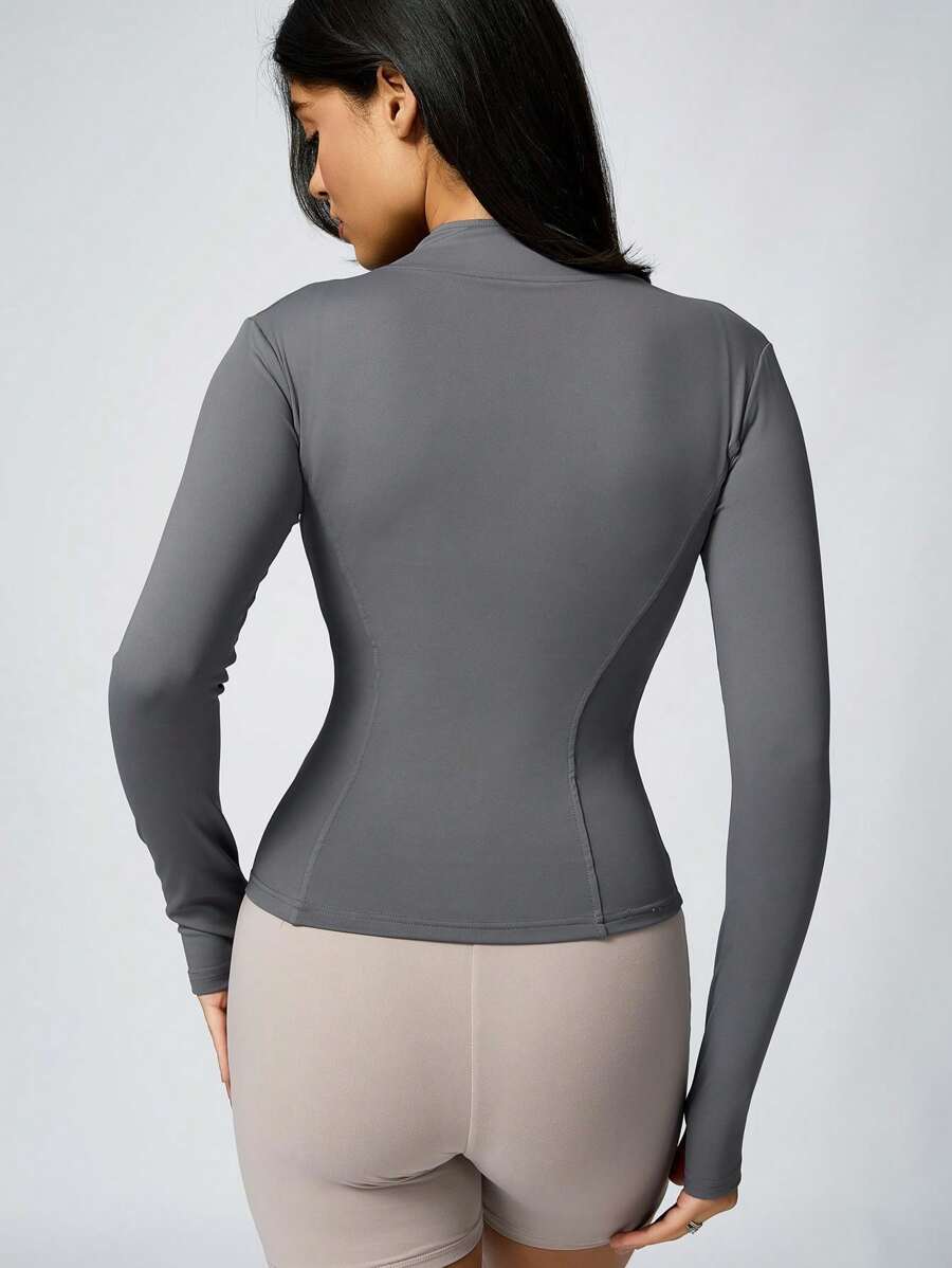 1 pieza chaqueta con cremallera de deporte de manga larga con agujero para el pulgar, unicolor, para yoga y uso diario en otono, para mujer