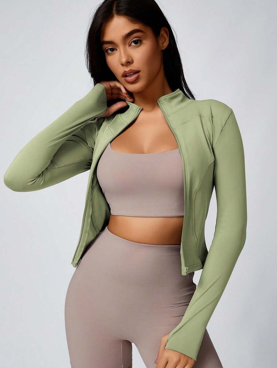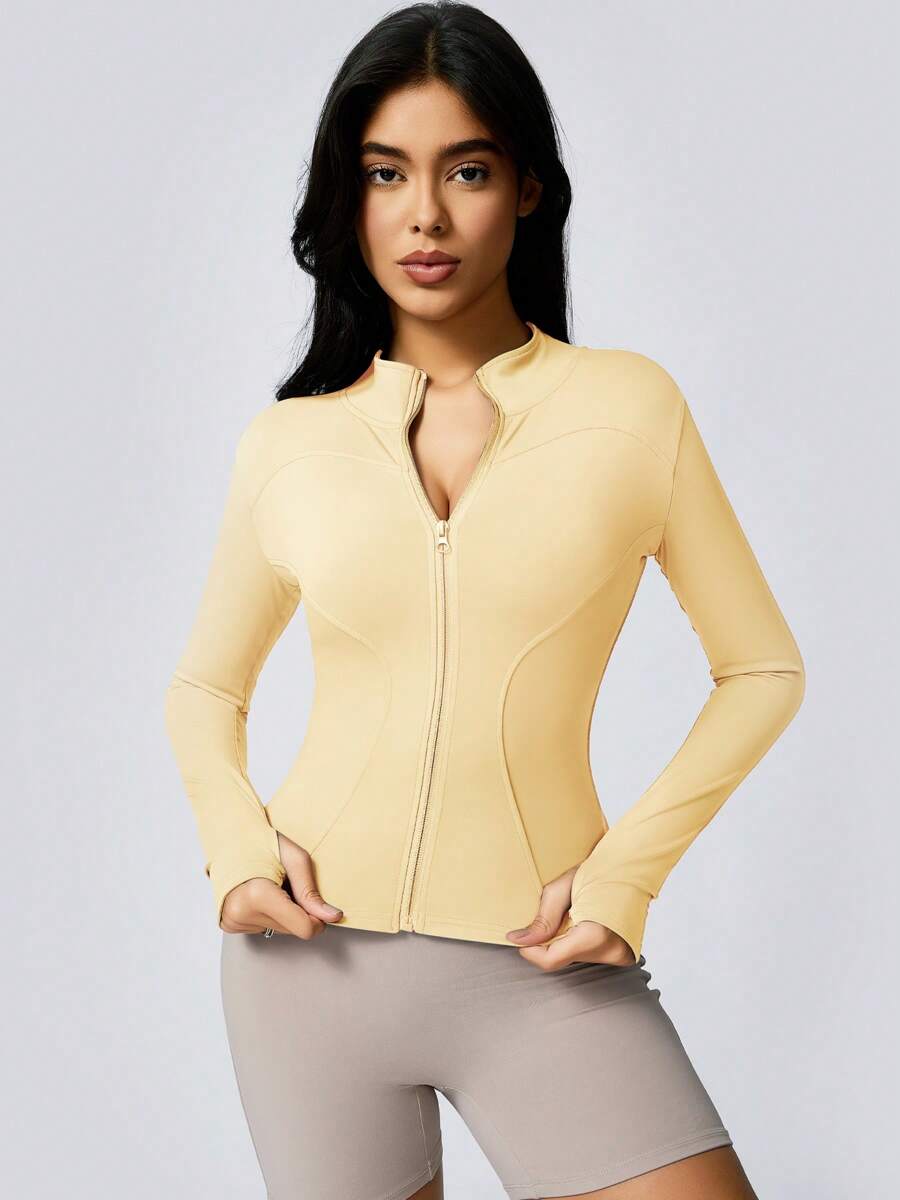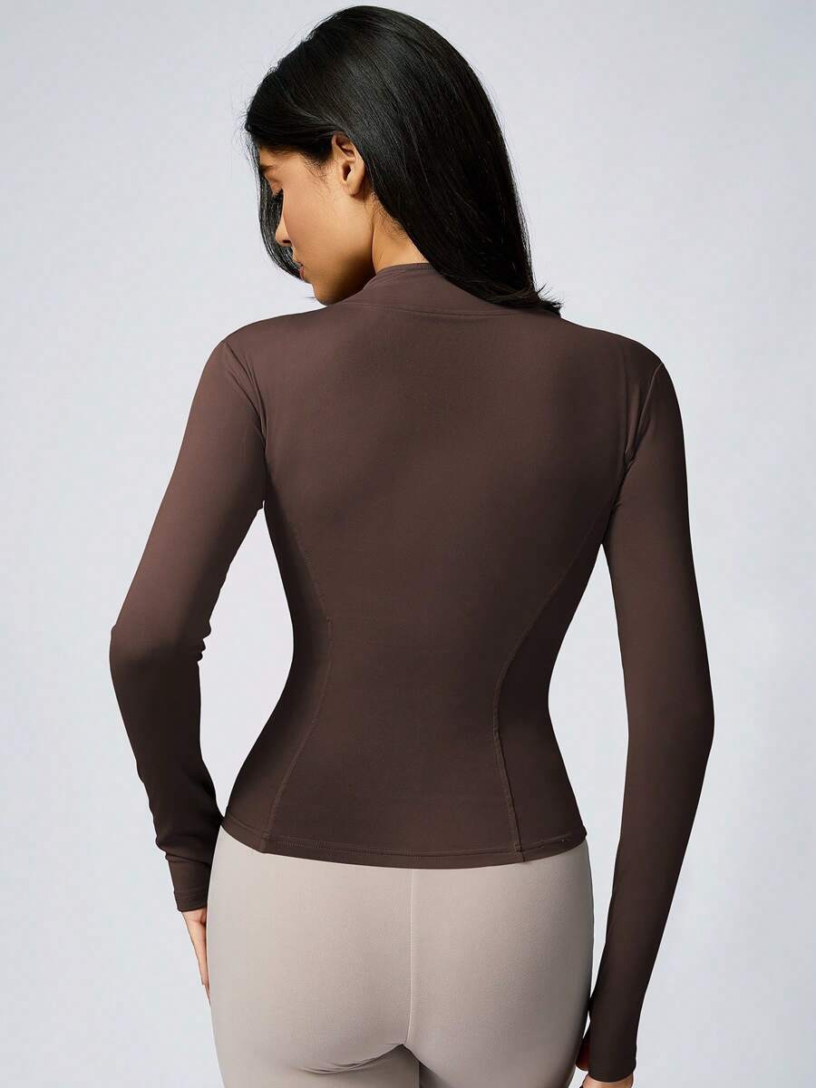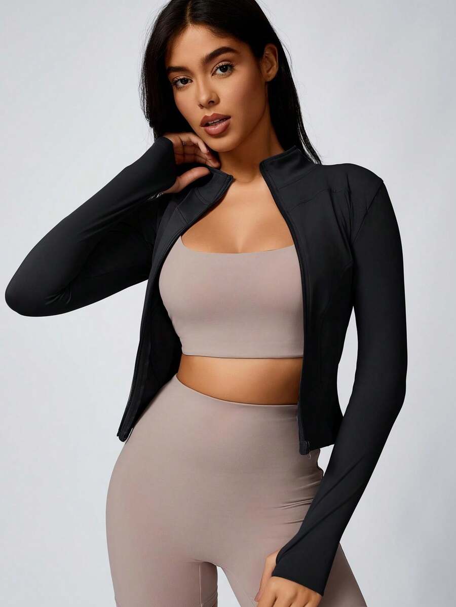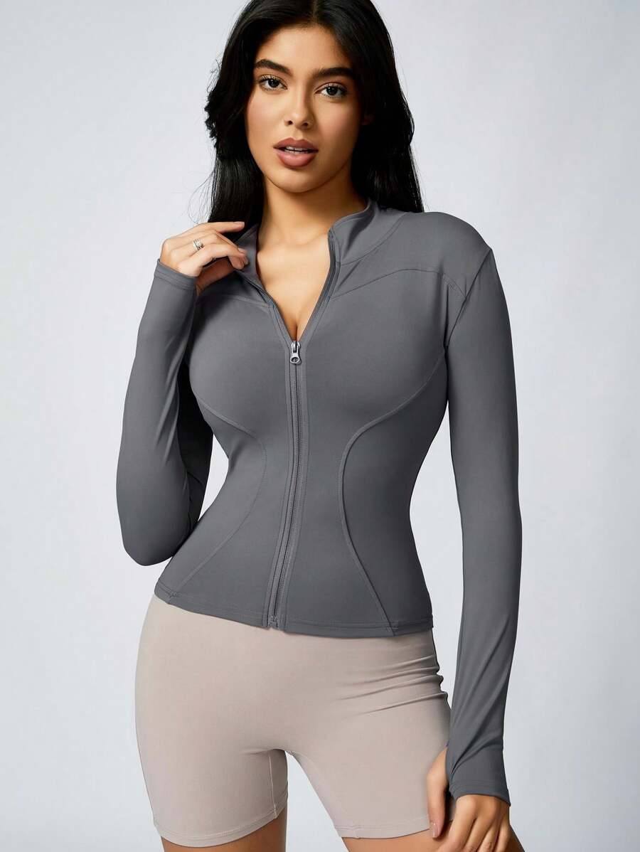 1 pieza chaqueta con cremallera de deporte de manga larga con agujero para el pulgar, unicolor, para yoga y uso diario en otono, para mujer