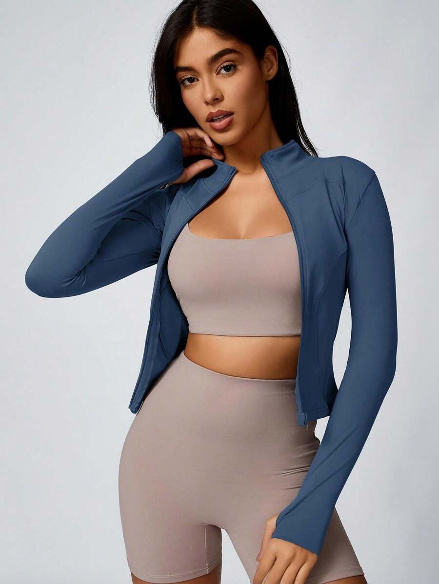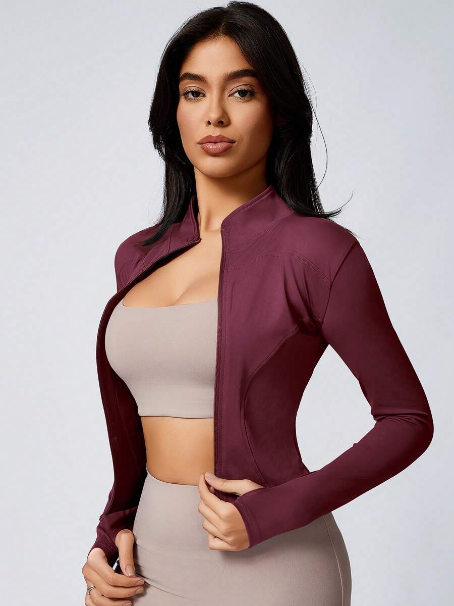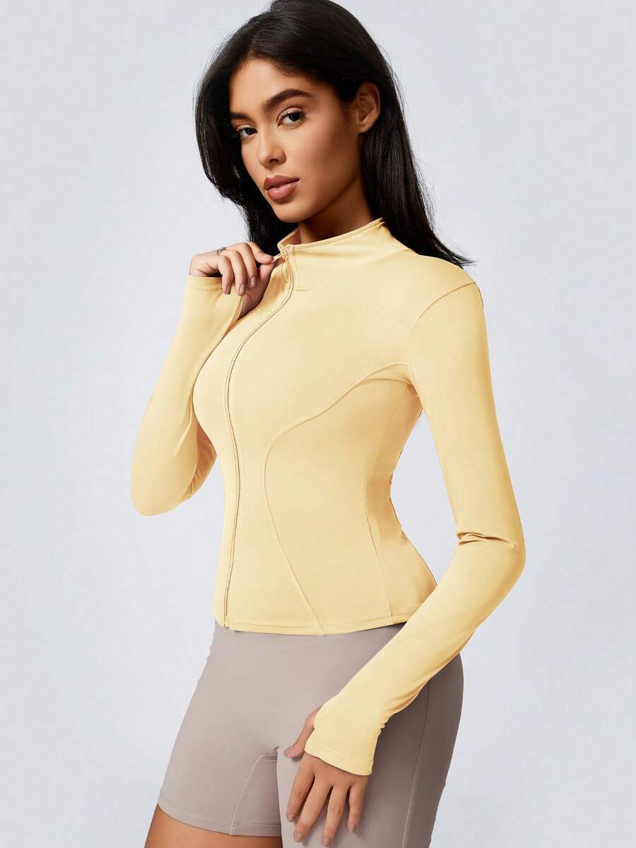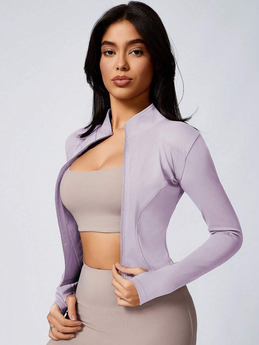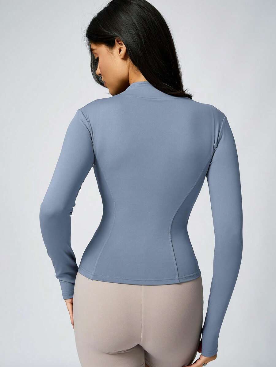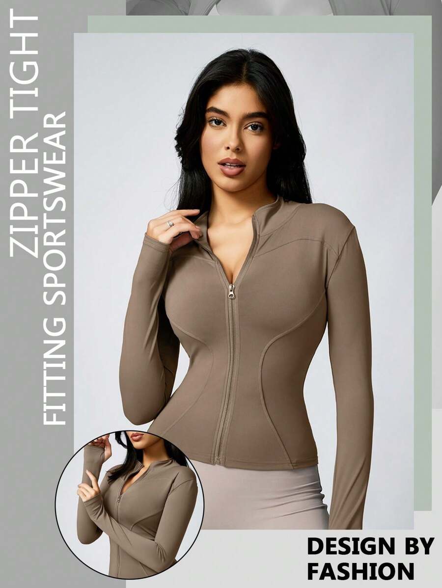 1 pieza chaqueta con cremallera de deporte de manga larga con agujero para el pulgar, unicolor, para yoga y uso diario en otono, para mujer