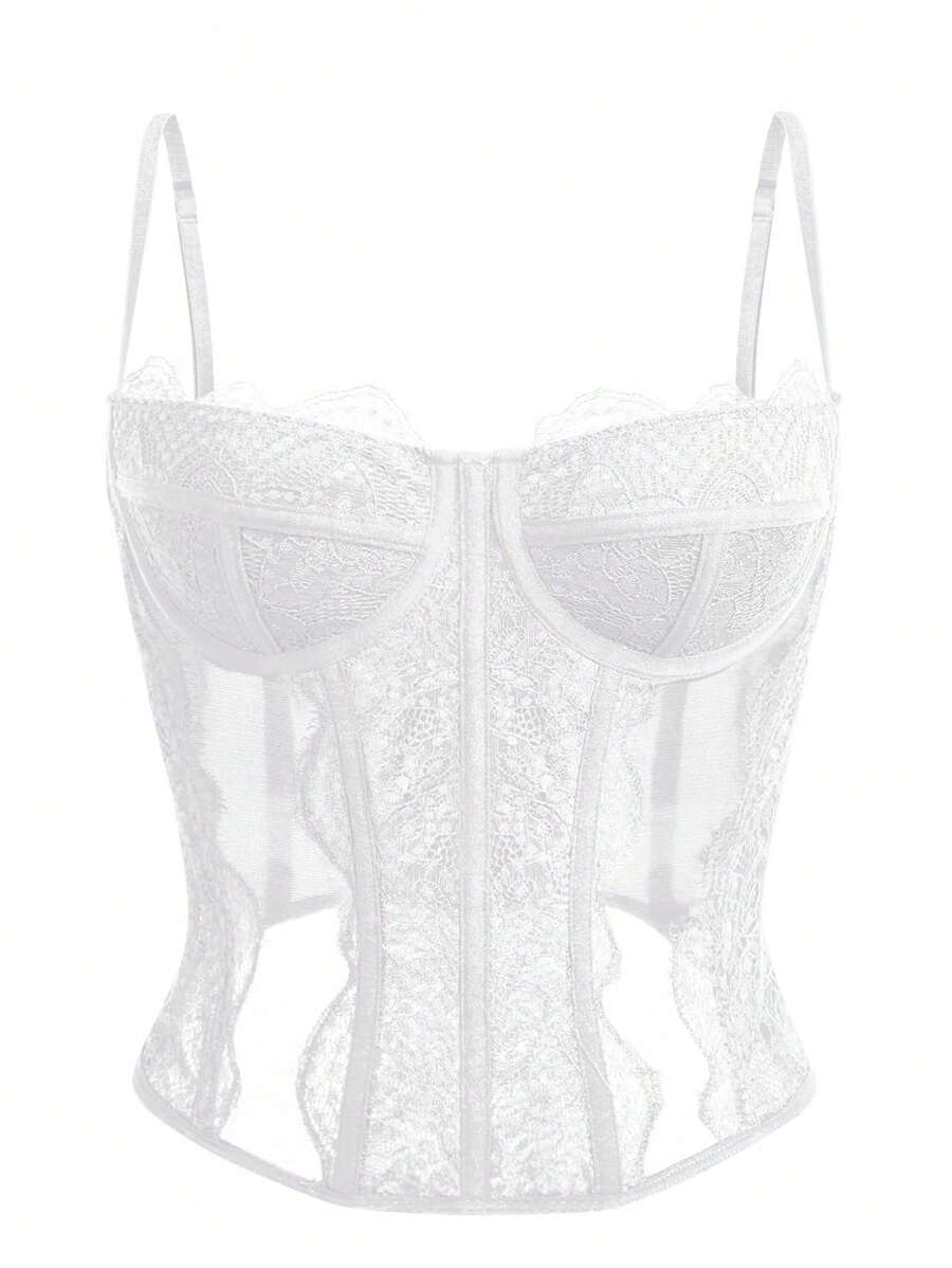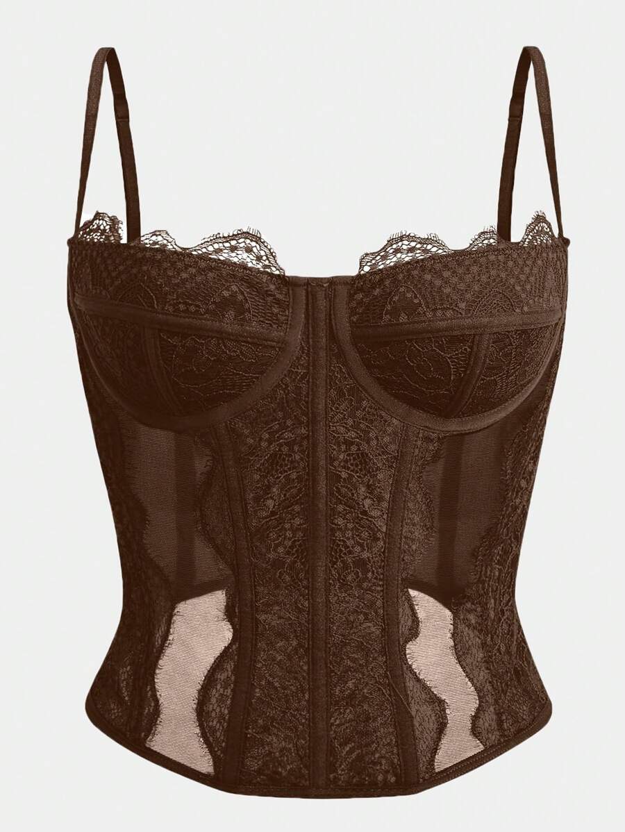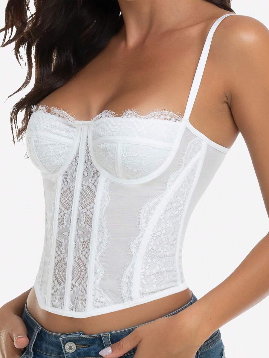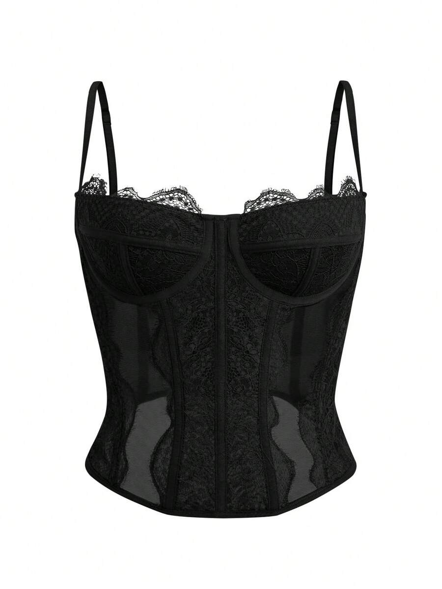 1 pieza parte superior de corse linda para mujeres para salir, parte superior de encaje y malla para cita nocturna con tirantes de espagueti para fiesta y club