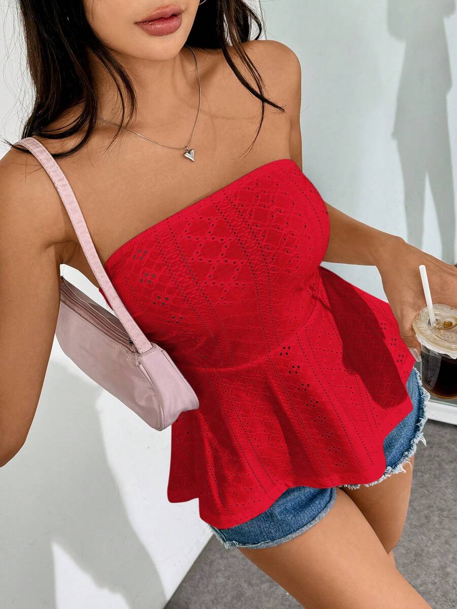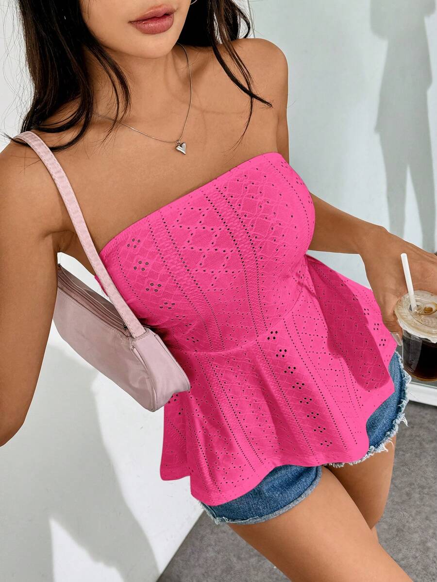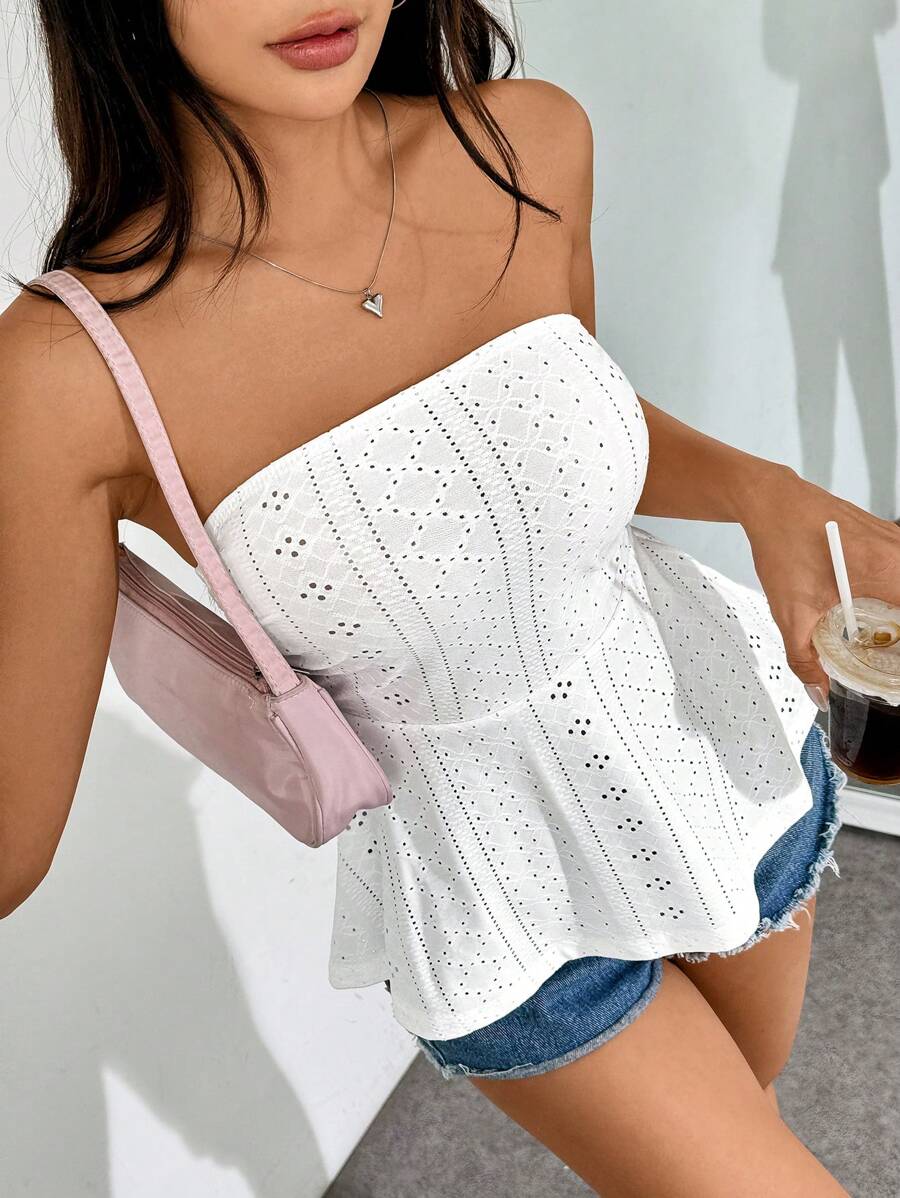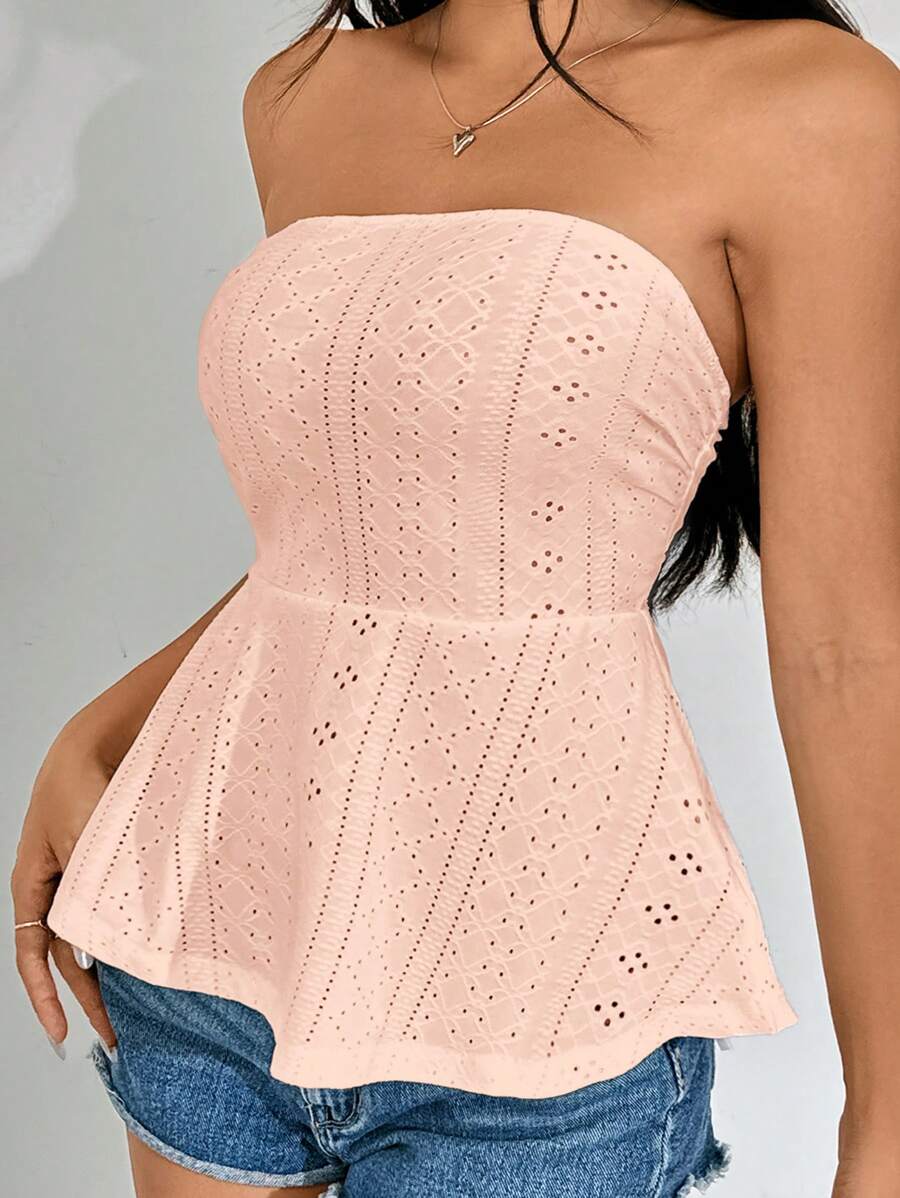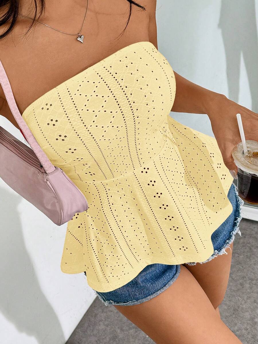 Top tubo con volante en el bajo, unicolor con bordado de ojales