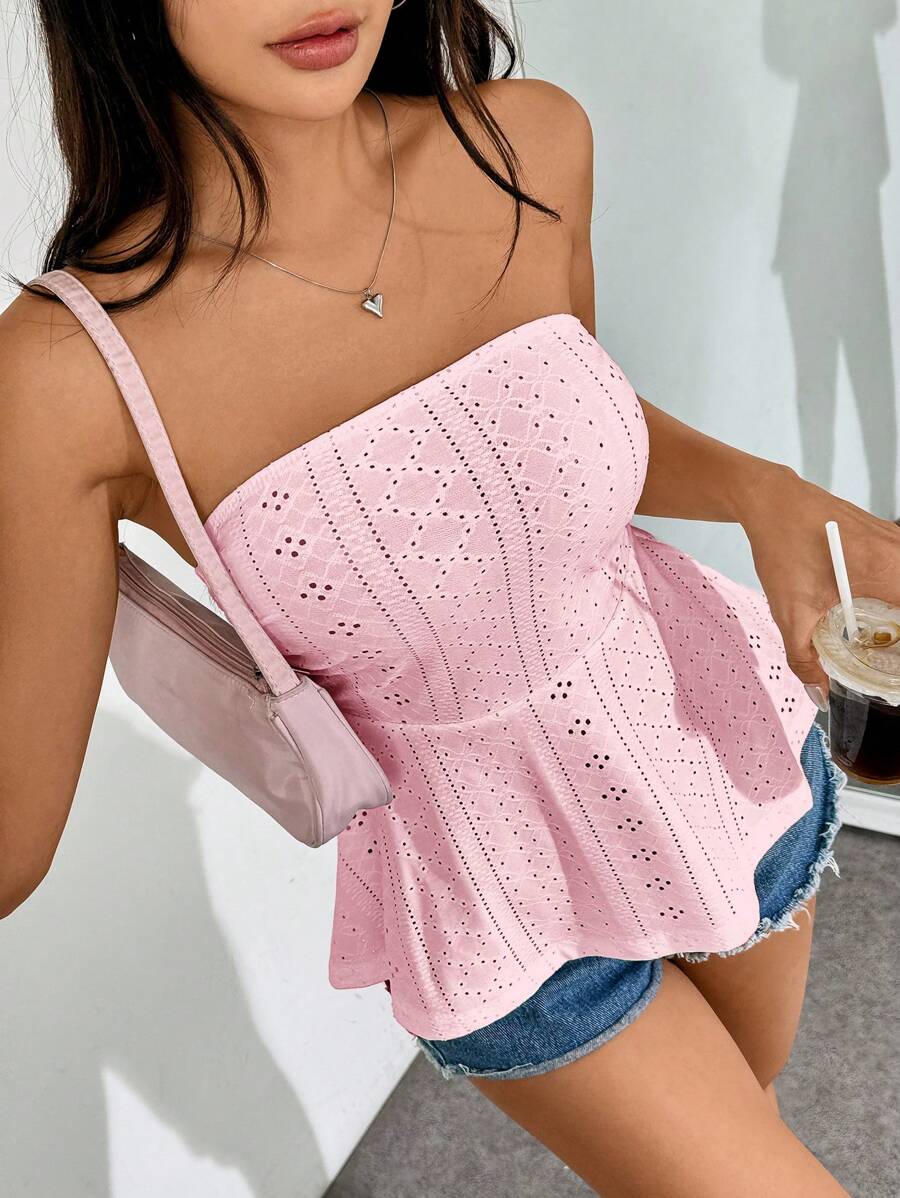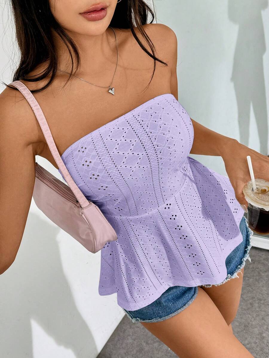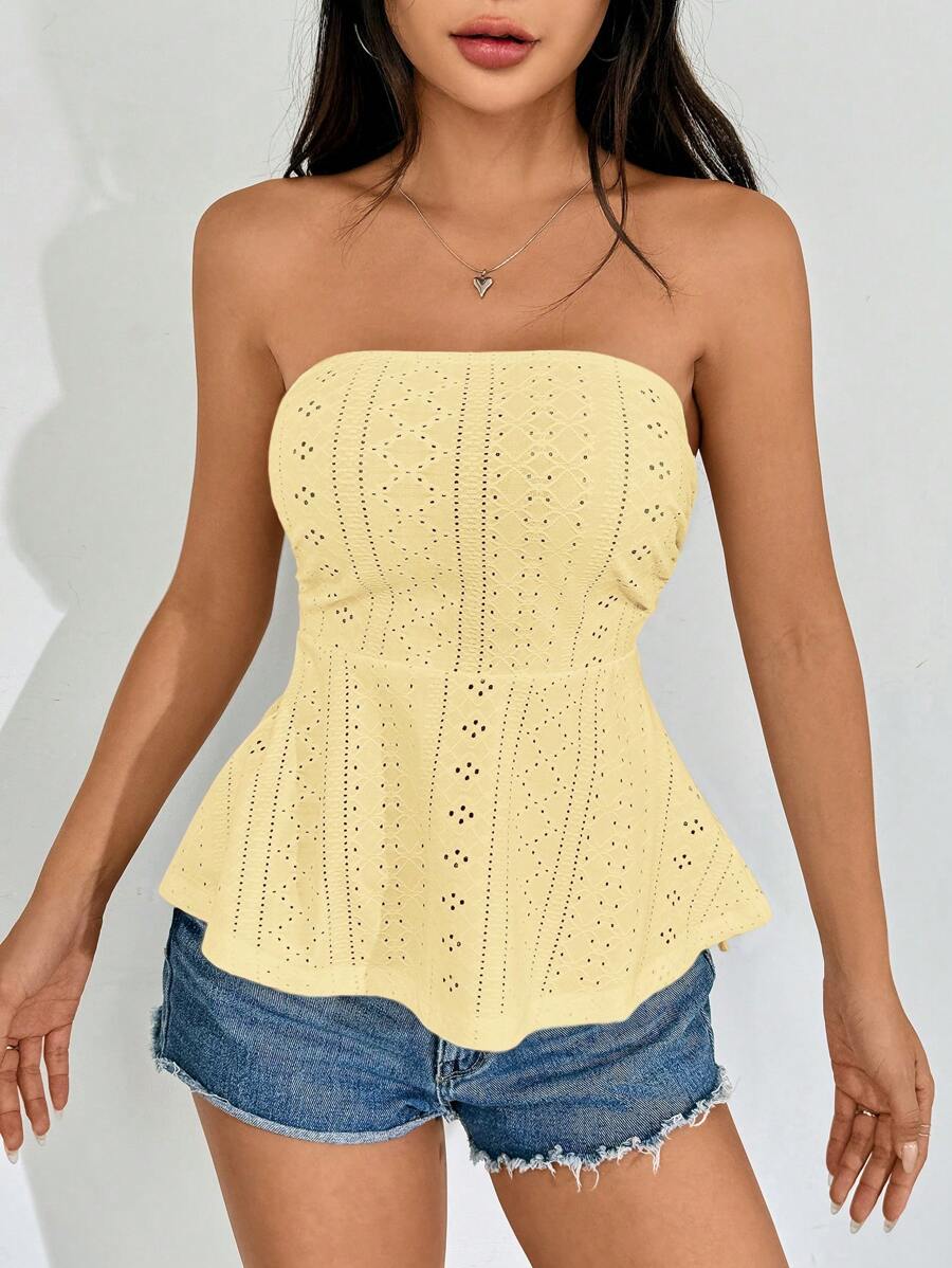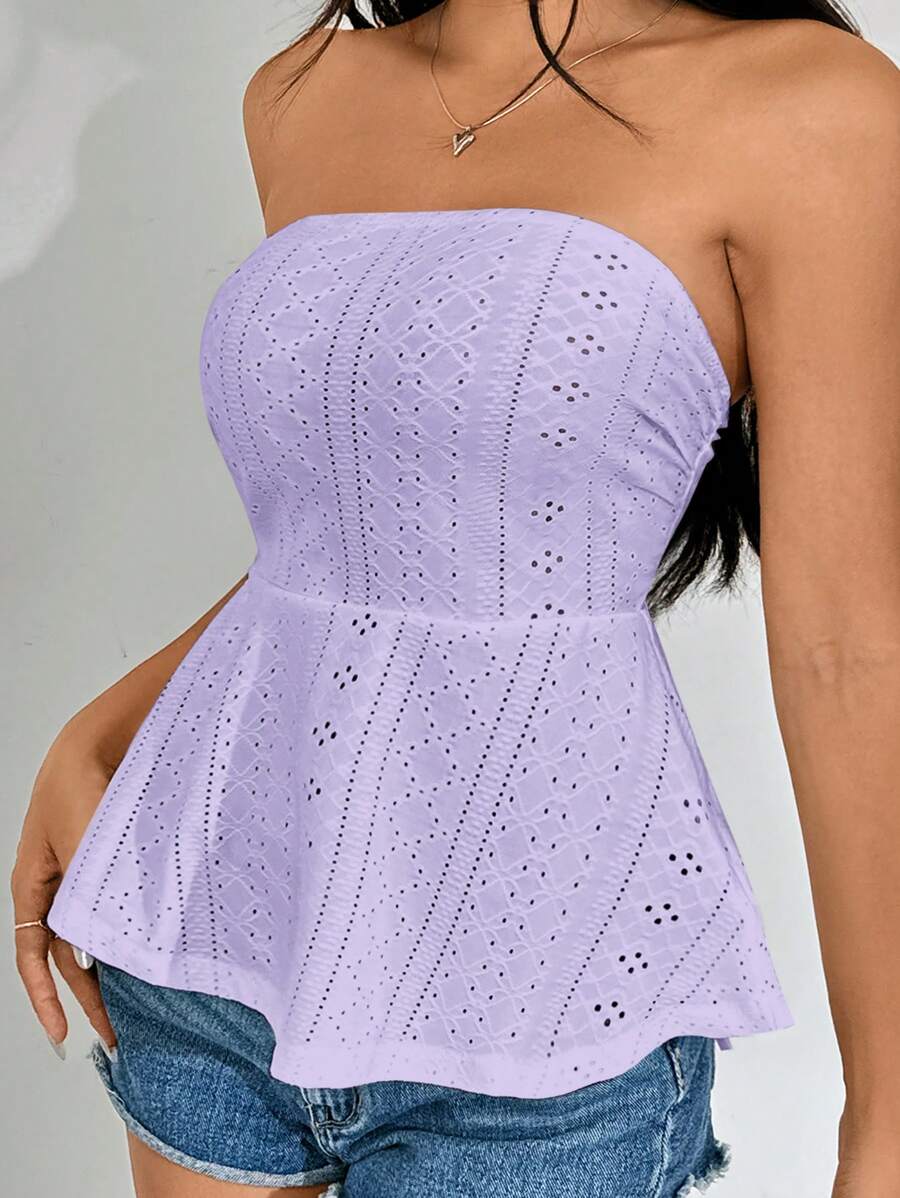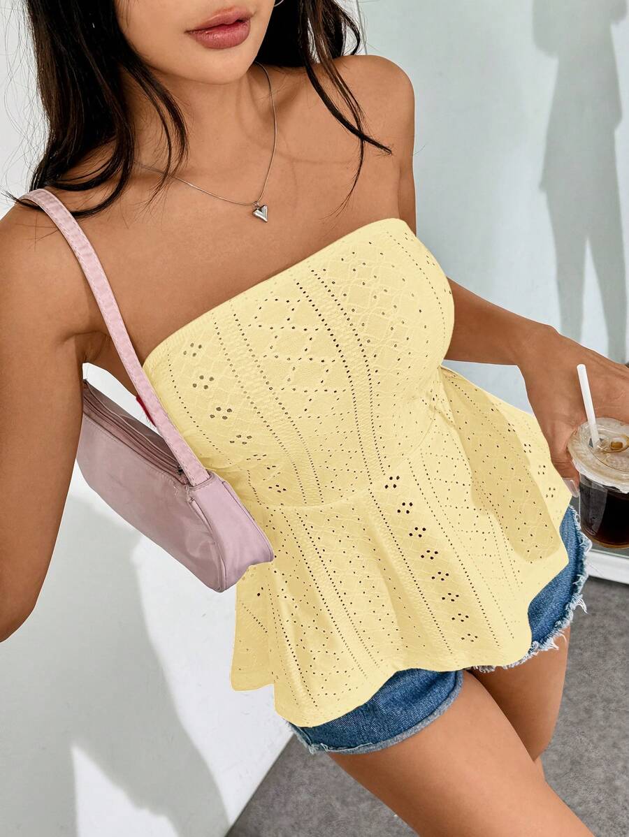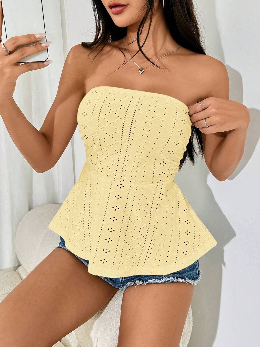 Top tubo con volante en el bajo, unicolor con bordado de ojales