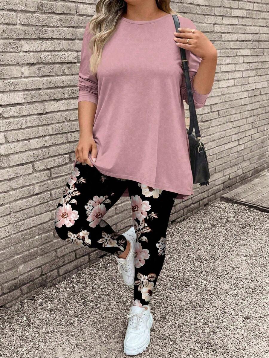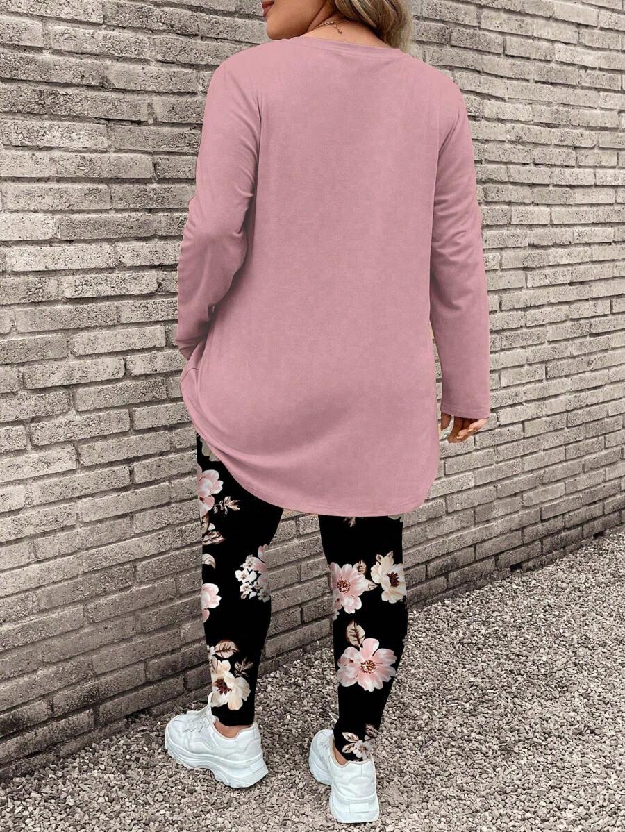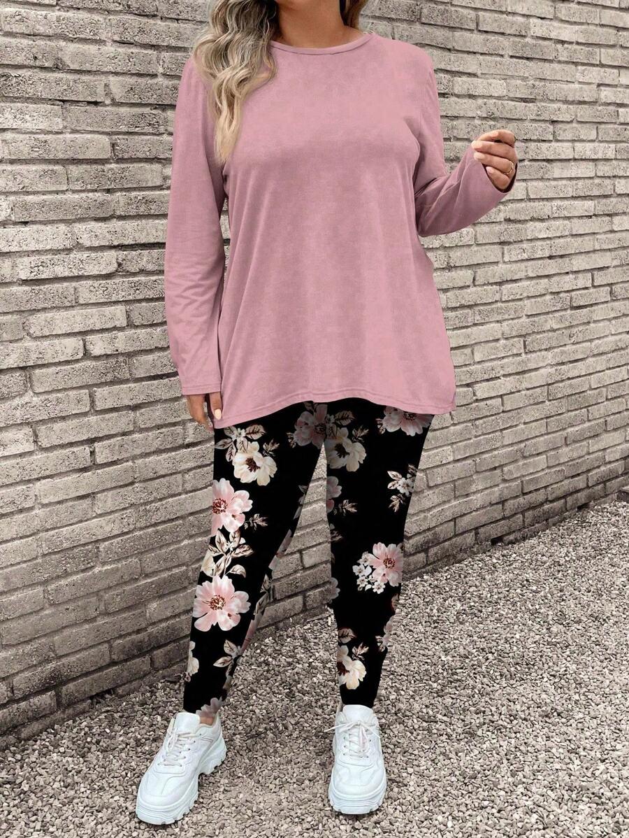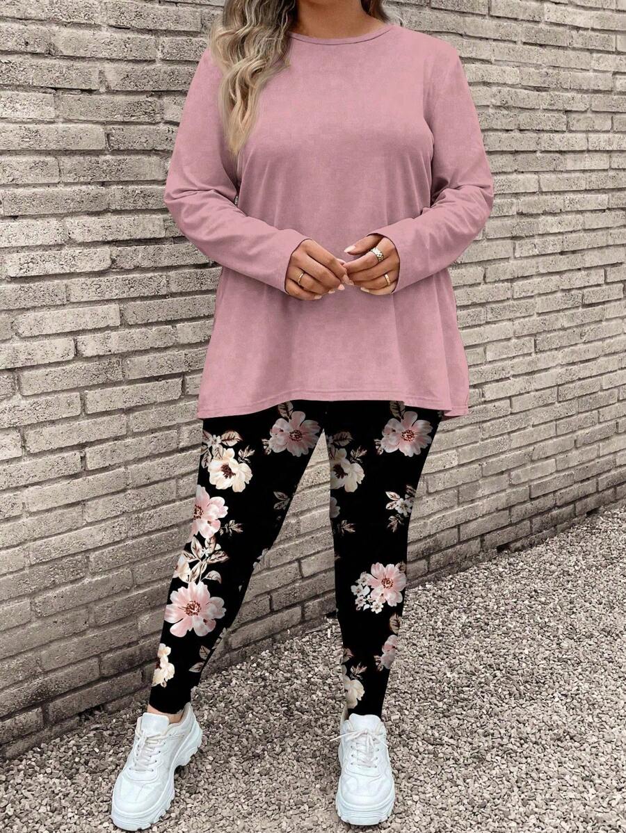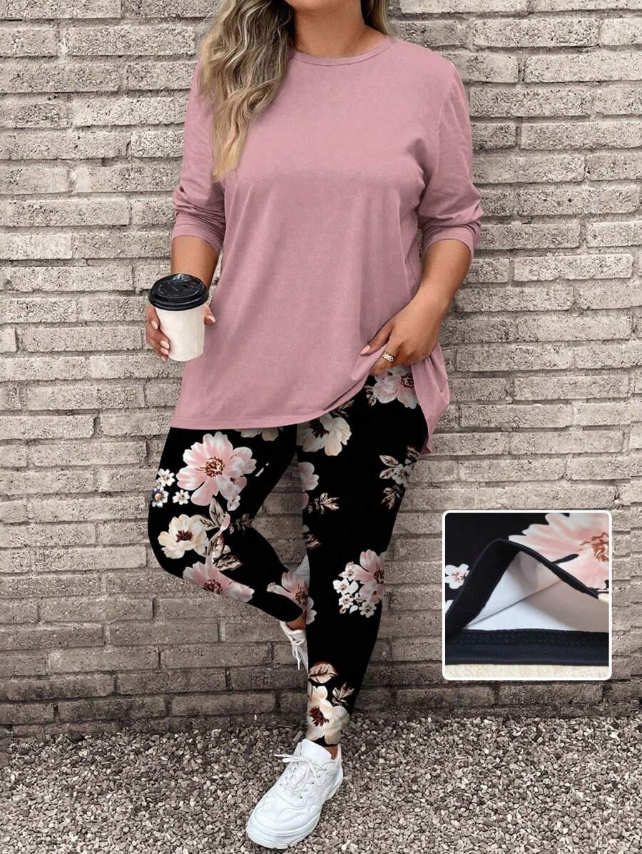 2 piezas/set conjunto de top de manga larga con estampado floral rosa y pantalones de yoga talla grande, adecuado para otono e invierno