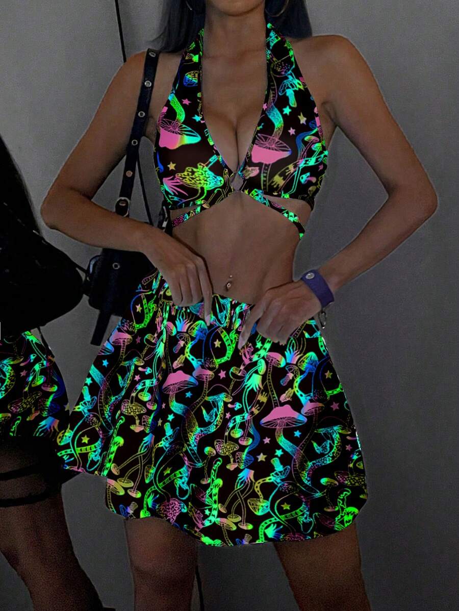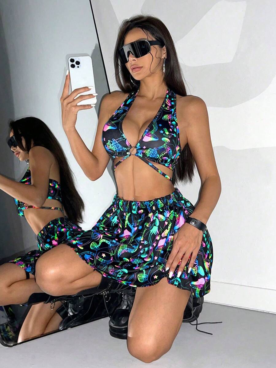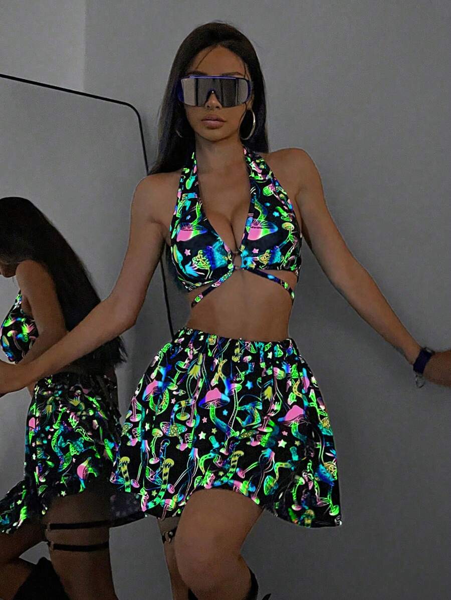 2 piezas conjunto de top corto halter con hebilla reflectante de color seta y mini falda de cintura alta para mujeres