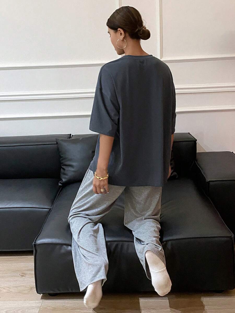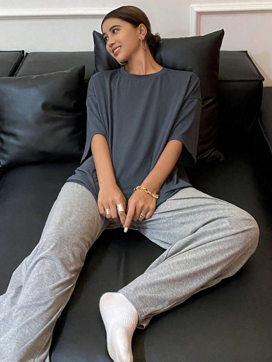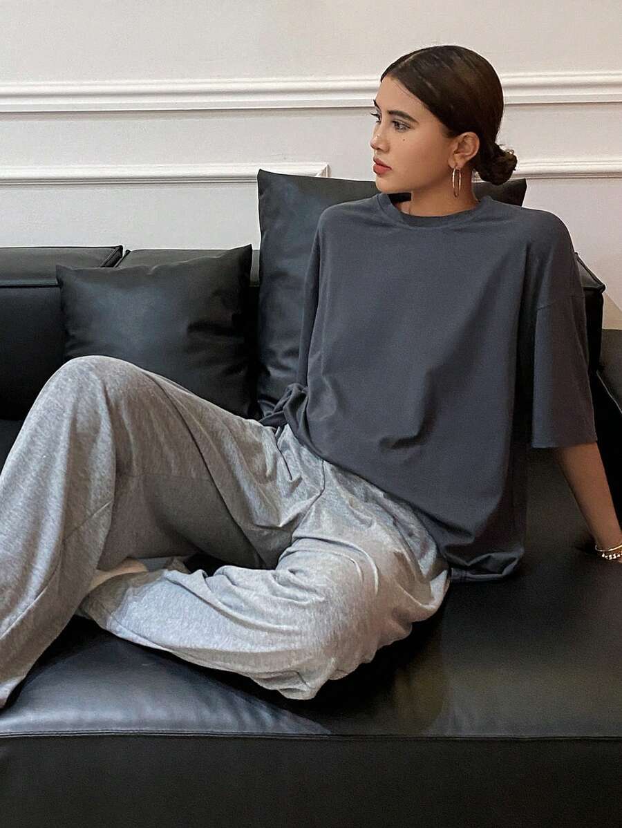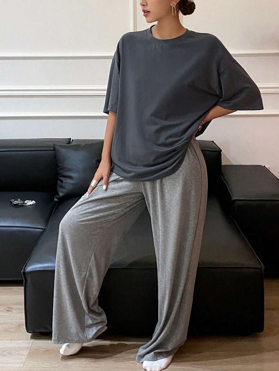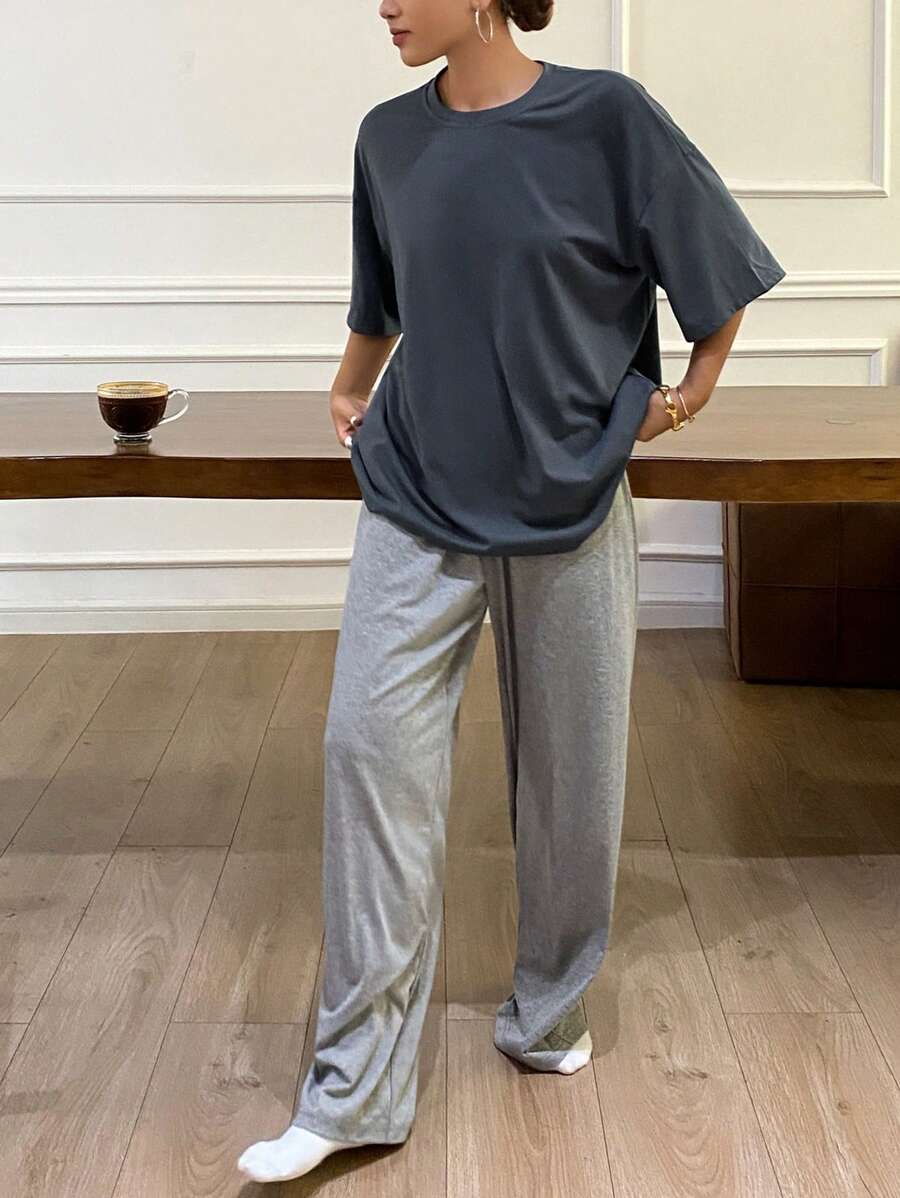 2 piezas conjunto de ropa informal de mujer de verano con top de cuello redondo y pantalones sueltos de unicolor para uso en el hogar