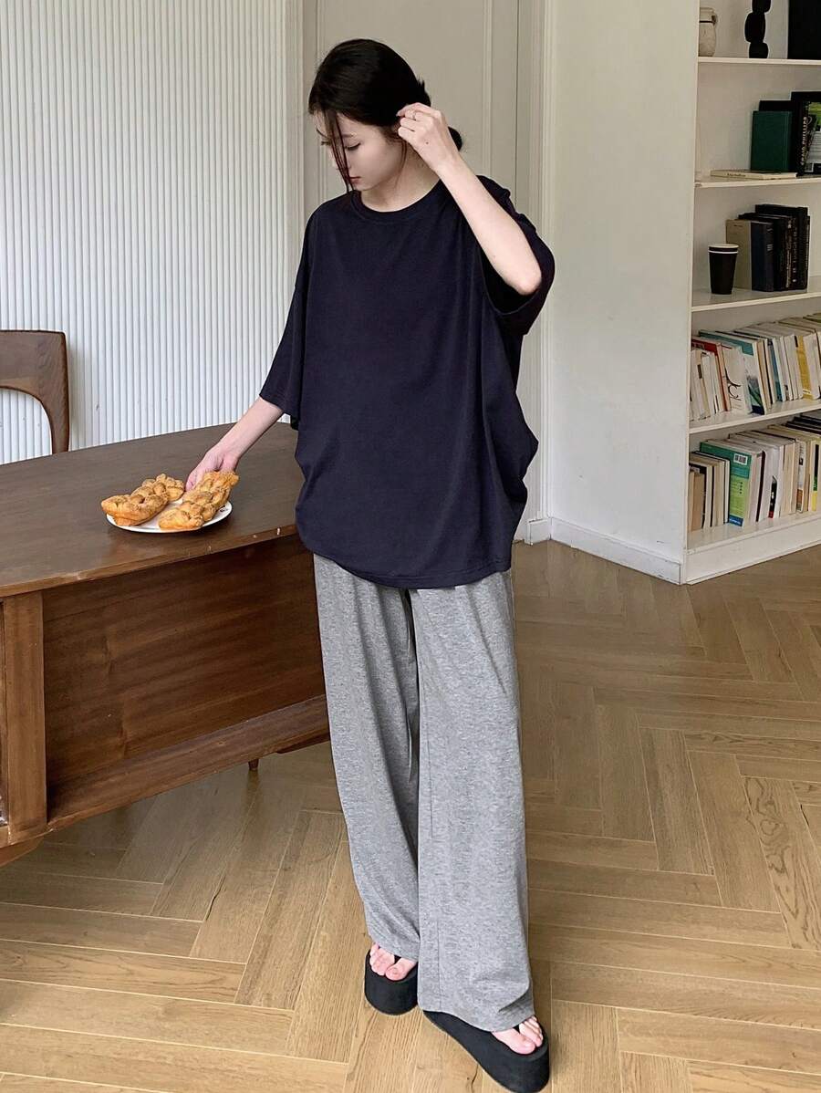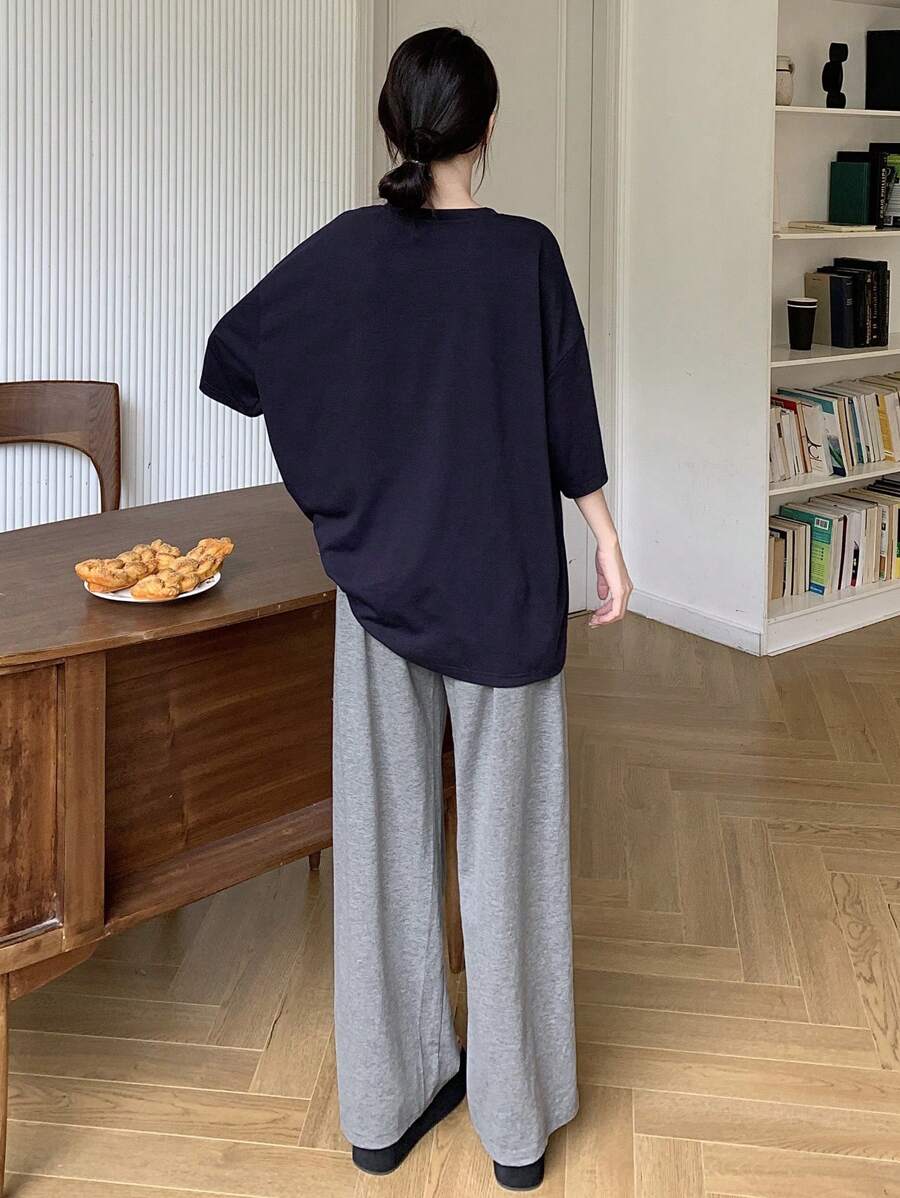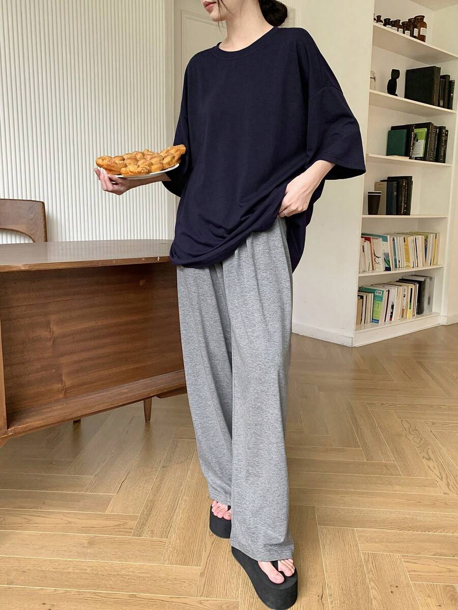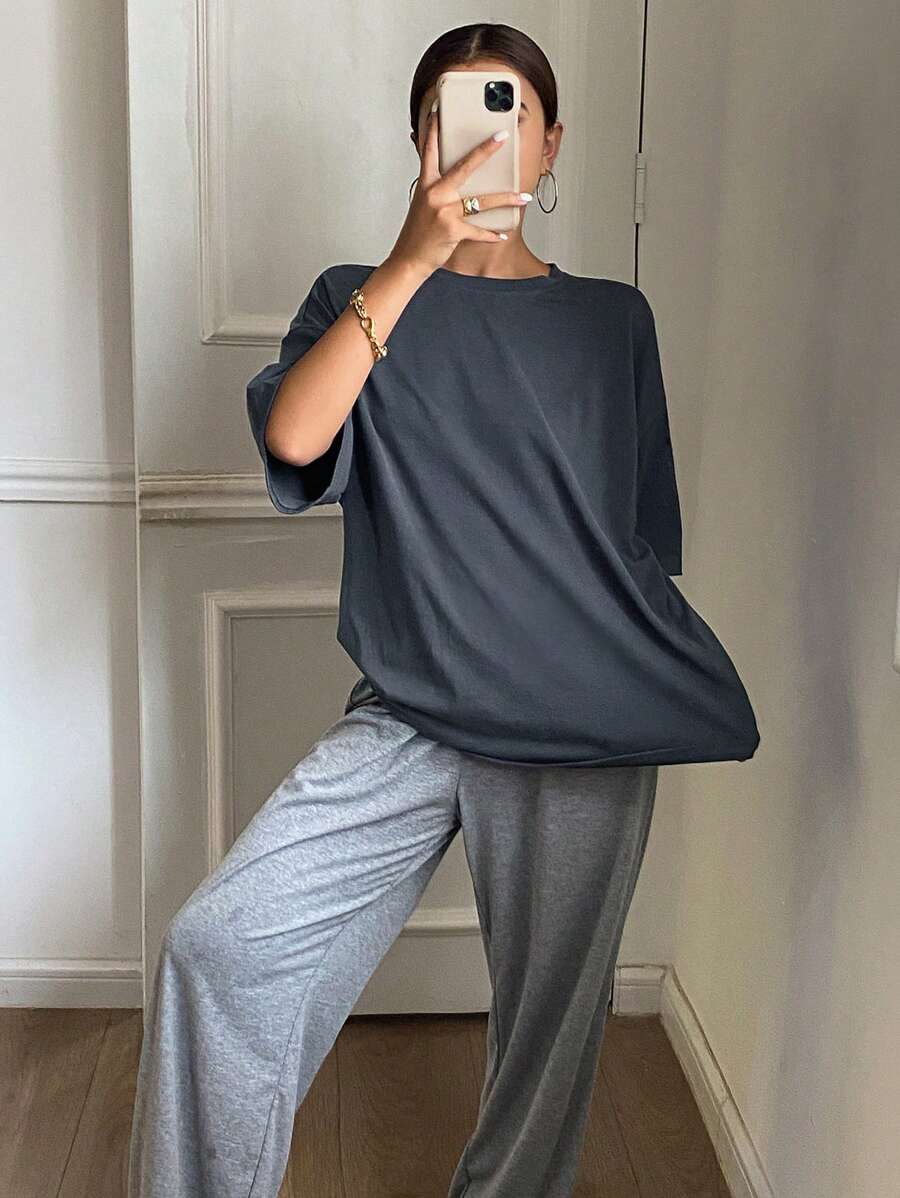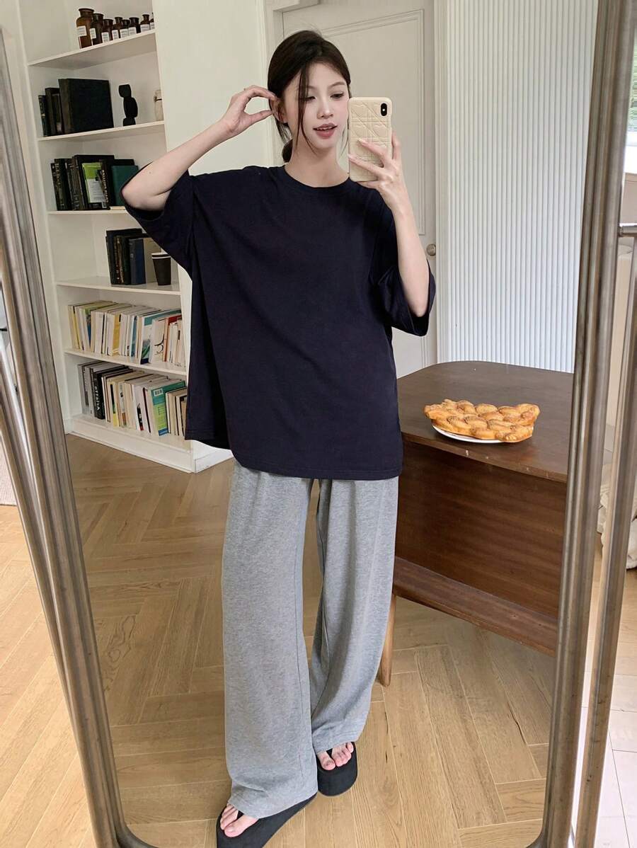 2 piezas conjunto de ropa informal de mujer de verano con top de cuello redondo y pantalones sueltos de unicolor para uso en el hogar