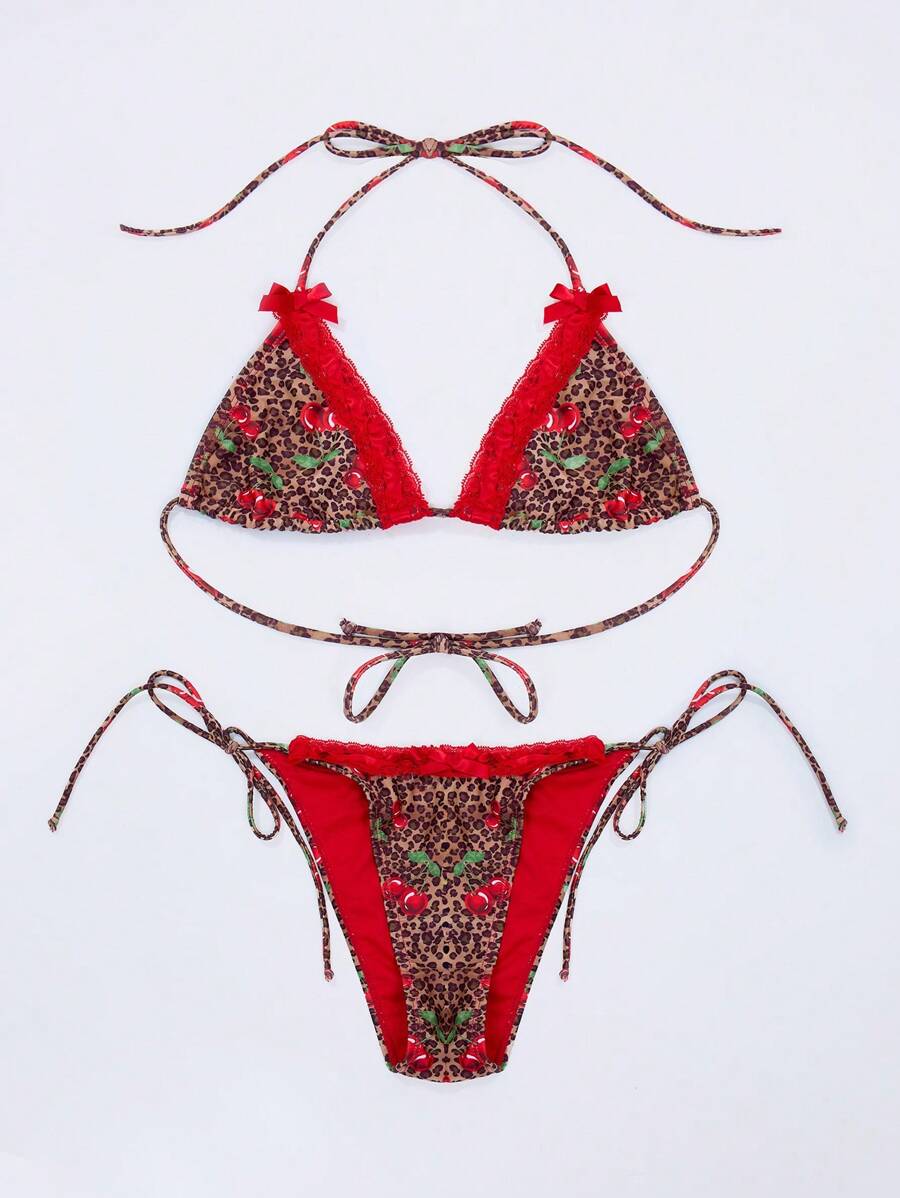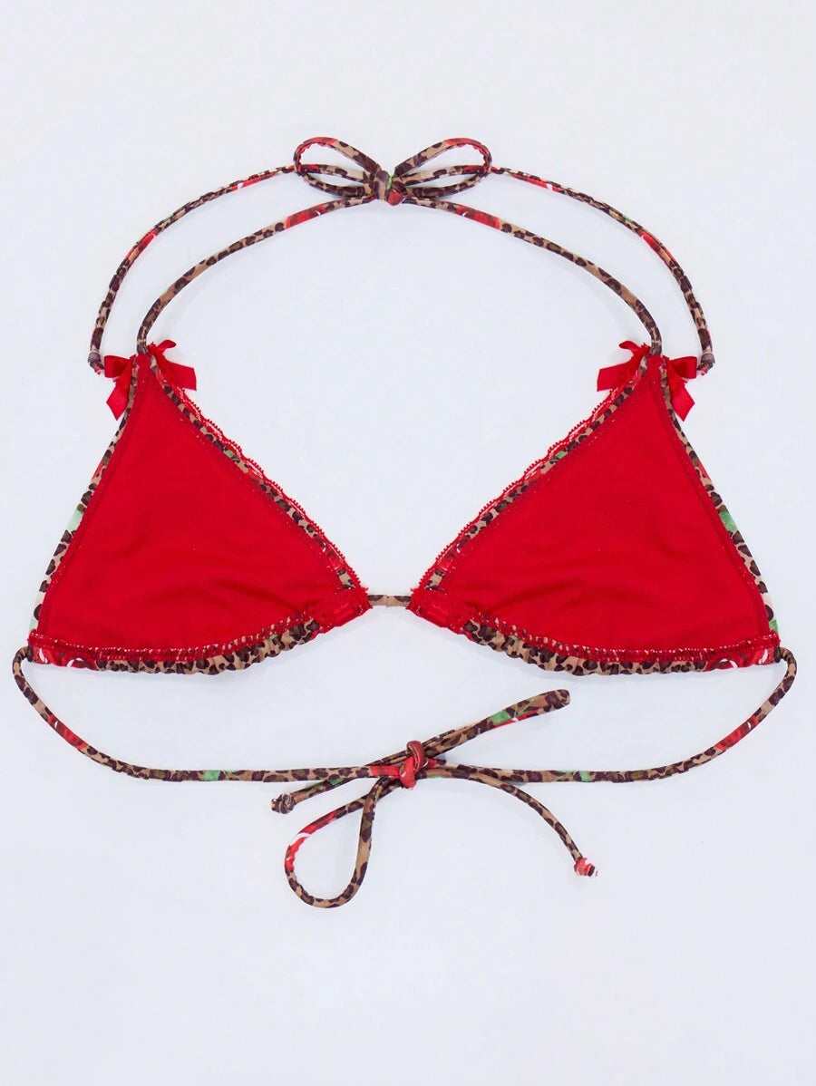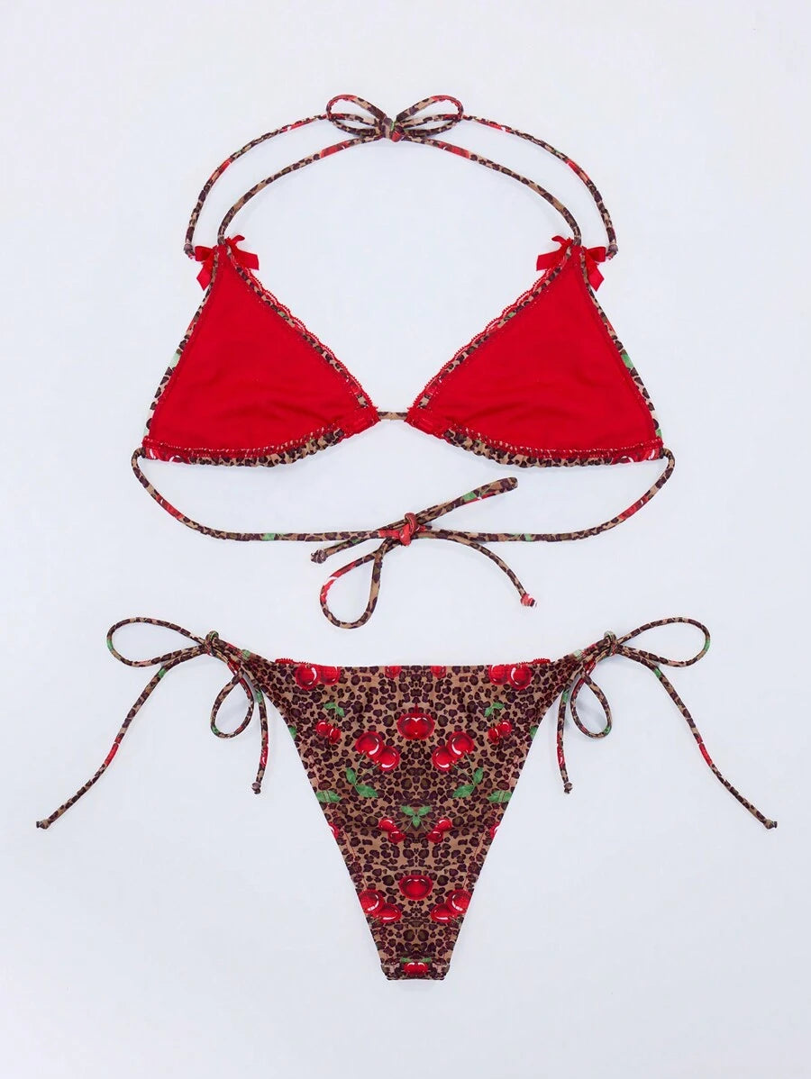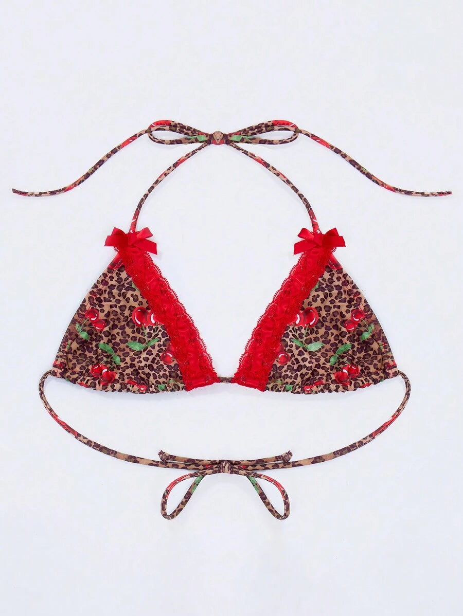 Resort top de bikini con estampado de leopardo y cereza para vacaciones de verano, playa, ibiza, dias festivos
