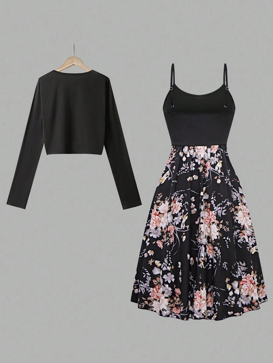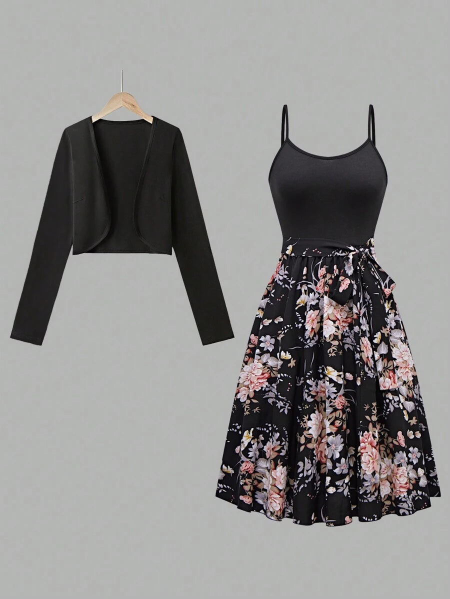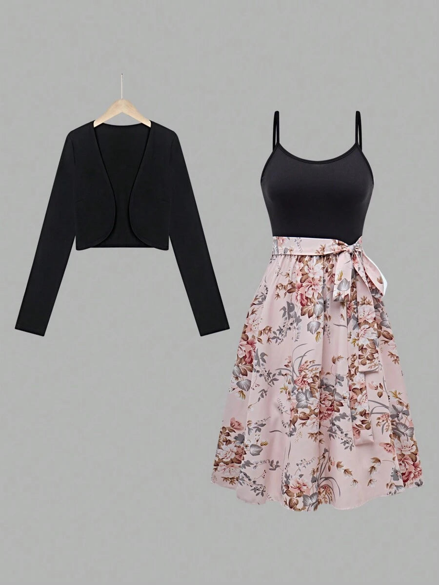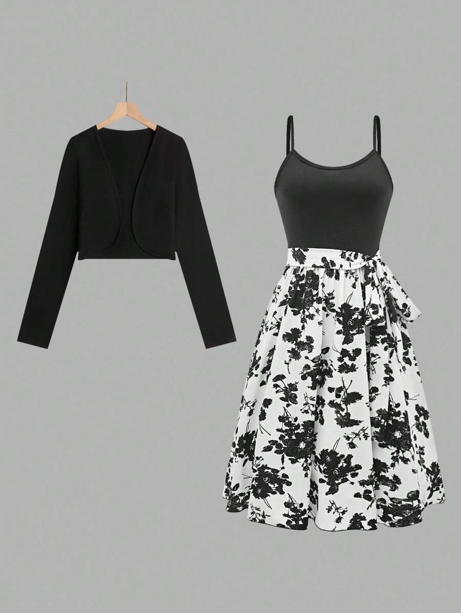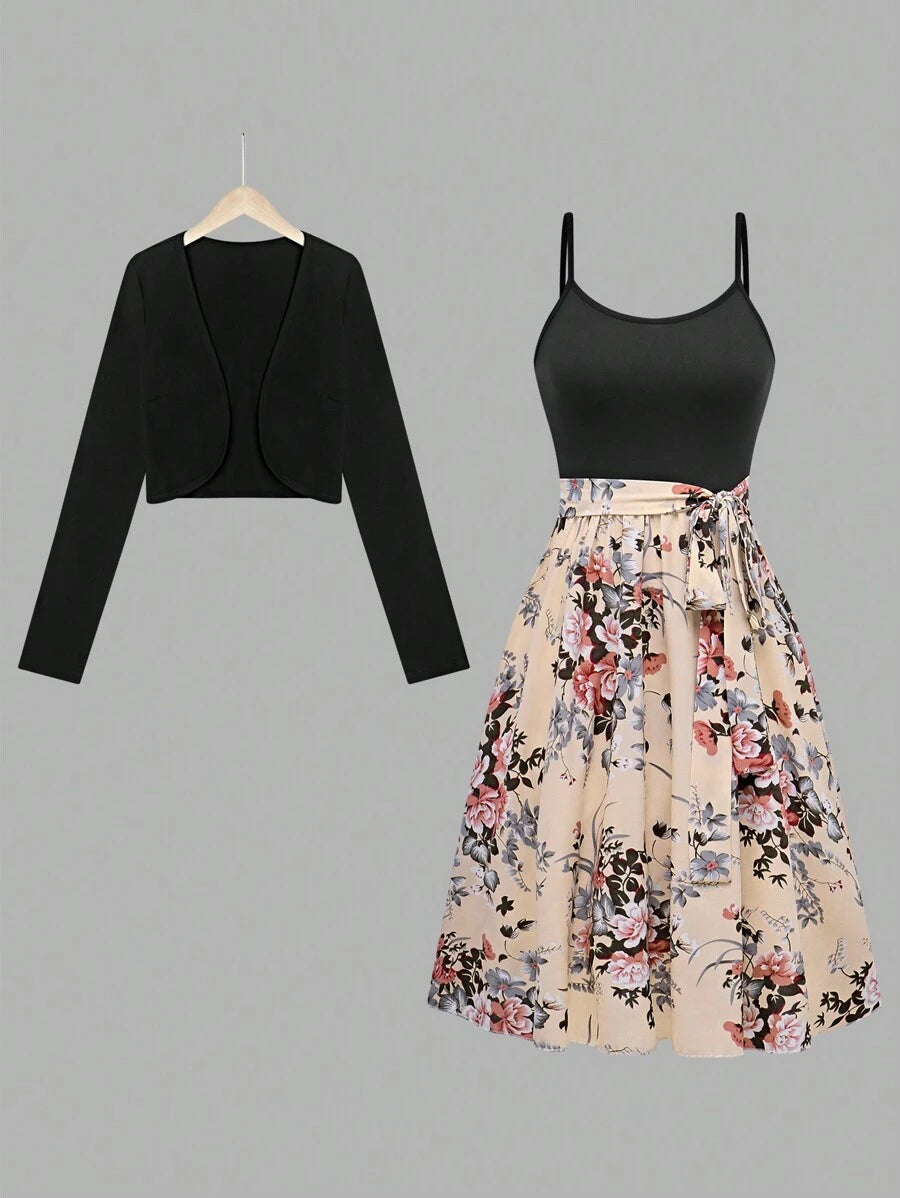 2 piezas conjunto elegante de vestido de tirantes con estampado floral y cinturon + cardigan de manga larga de unicolor para mujer