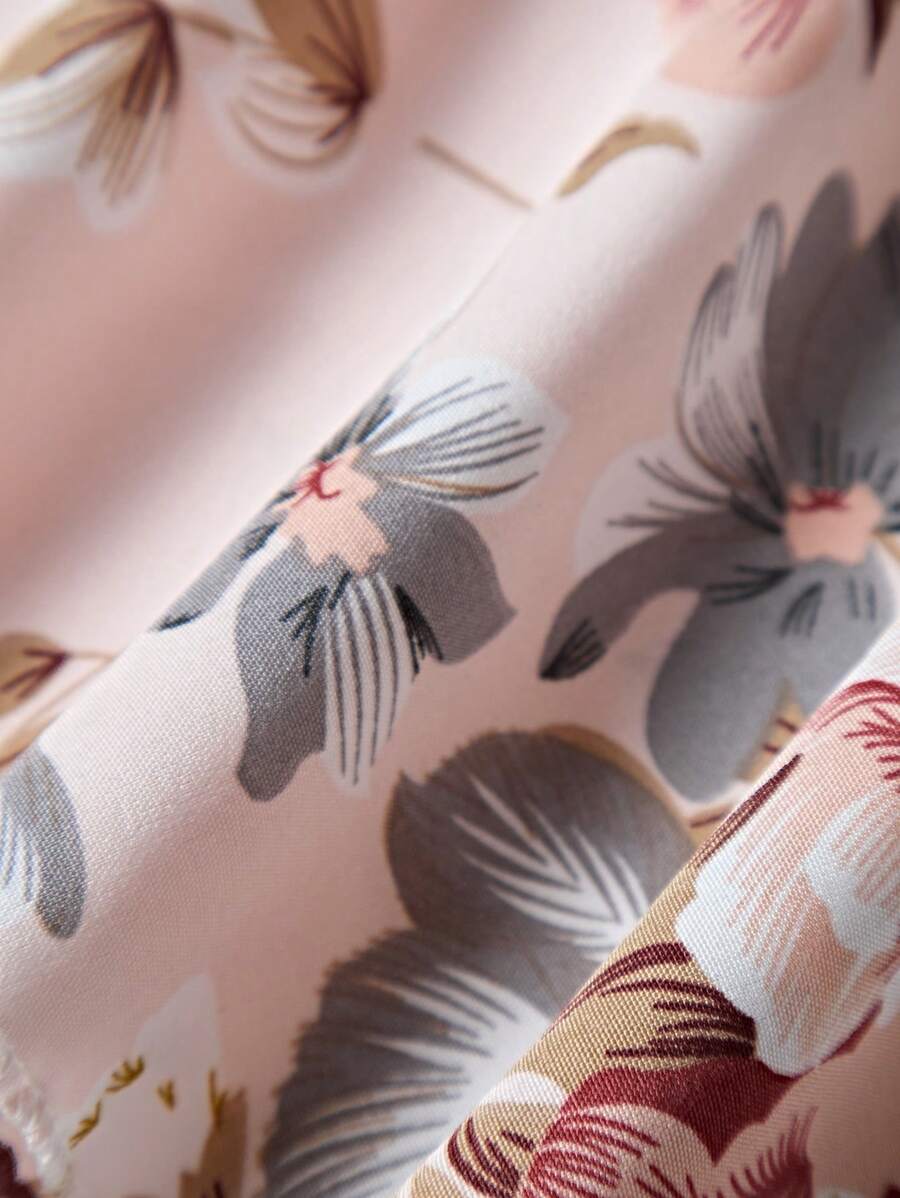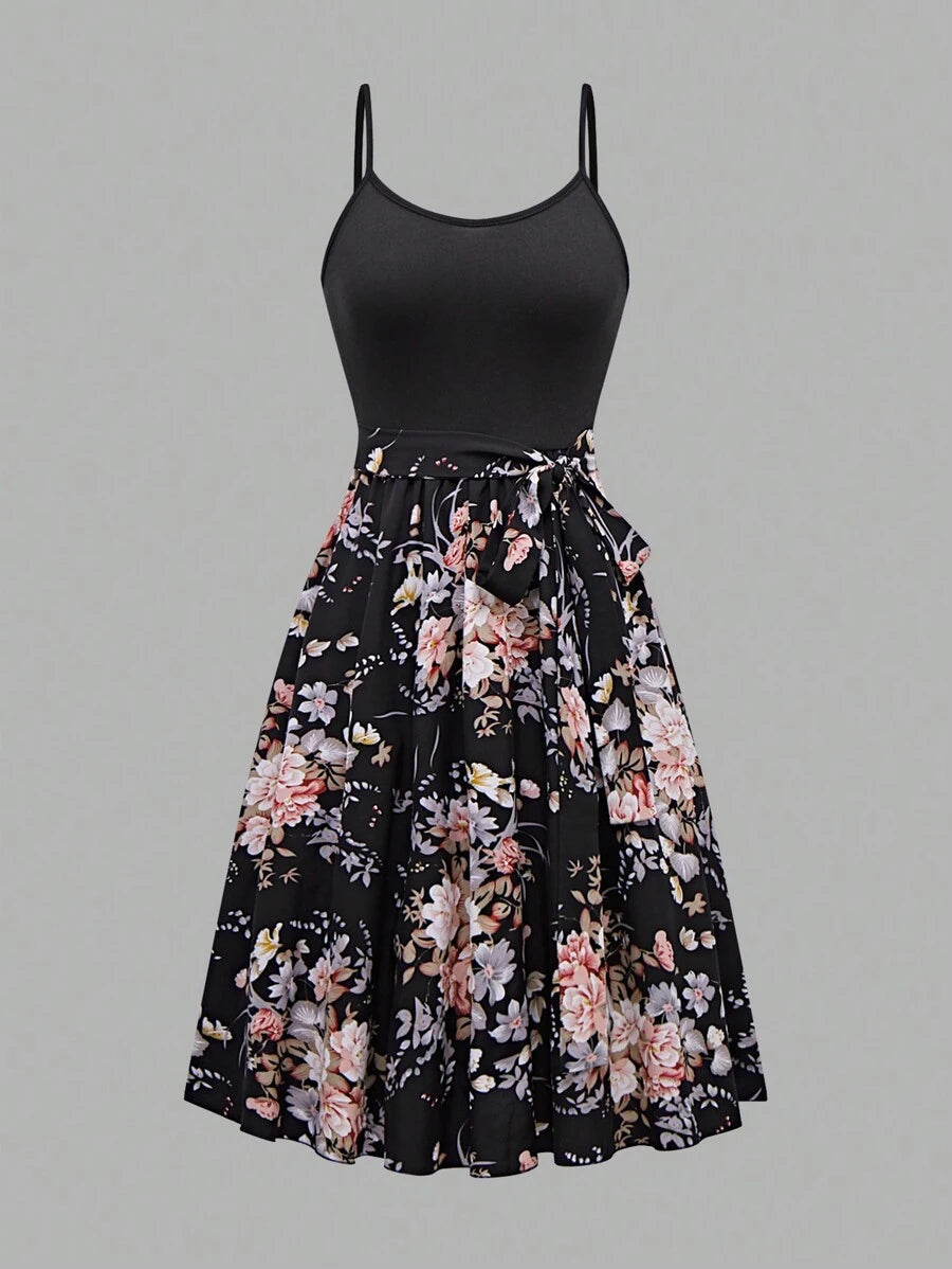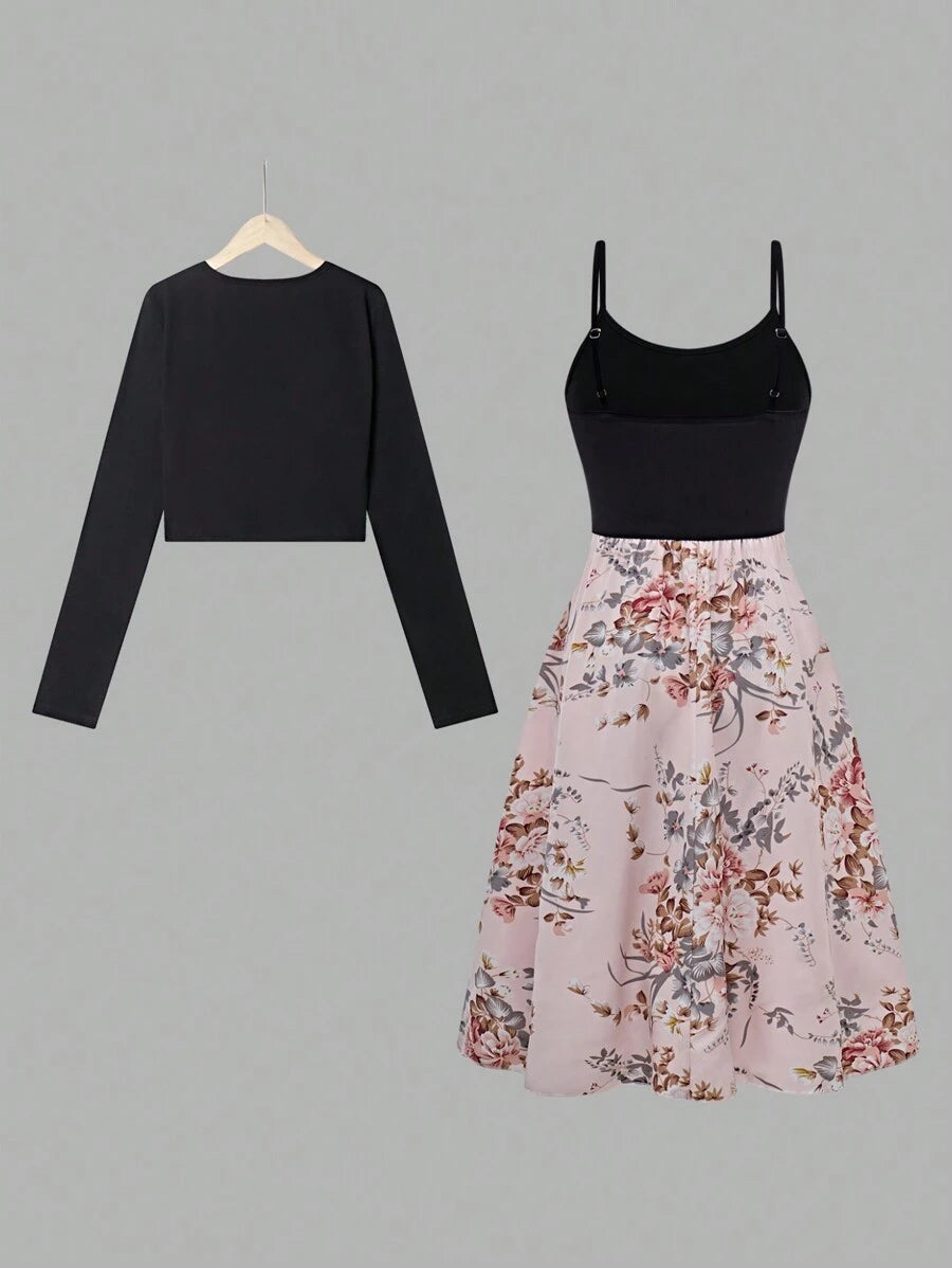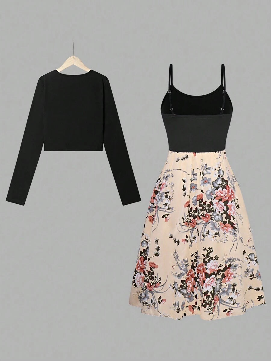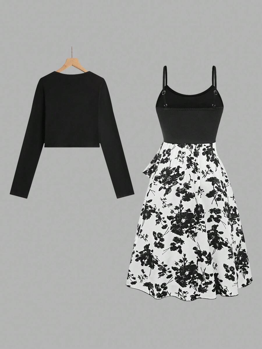 2 piezas conjunto elegante de vestido de tirantes con estampado floral y cinturon + cardigan de manga larga de unicolor para mujer
