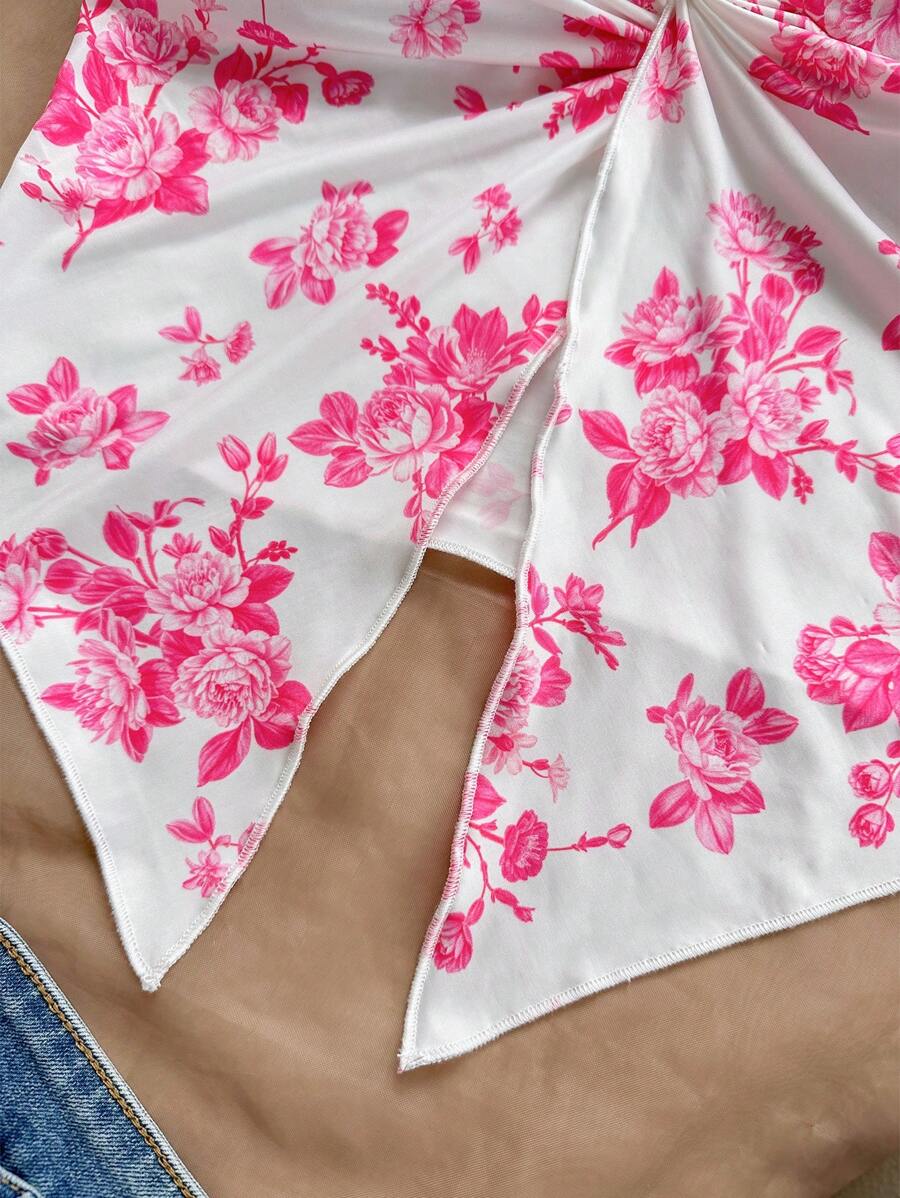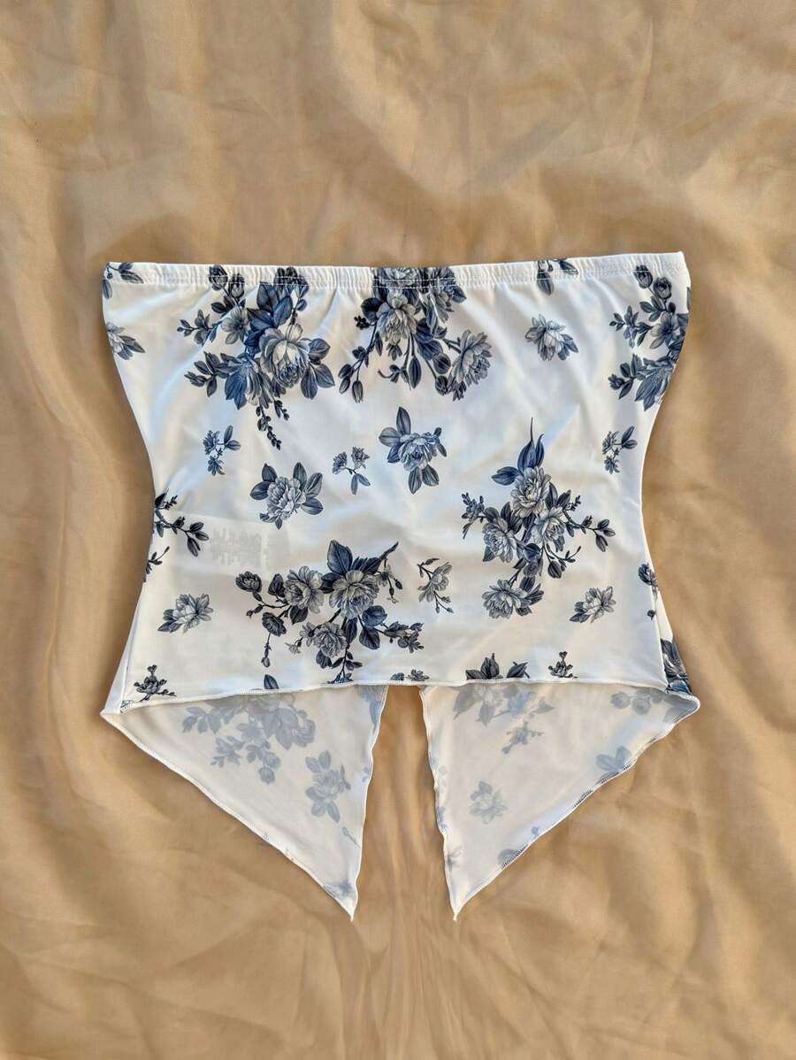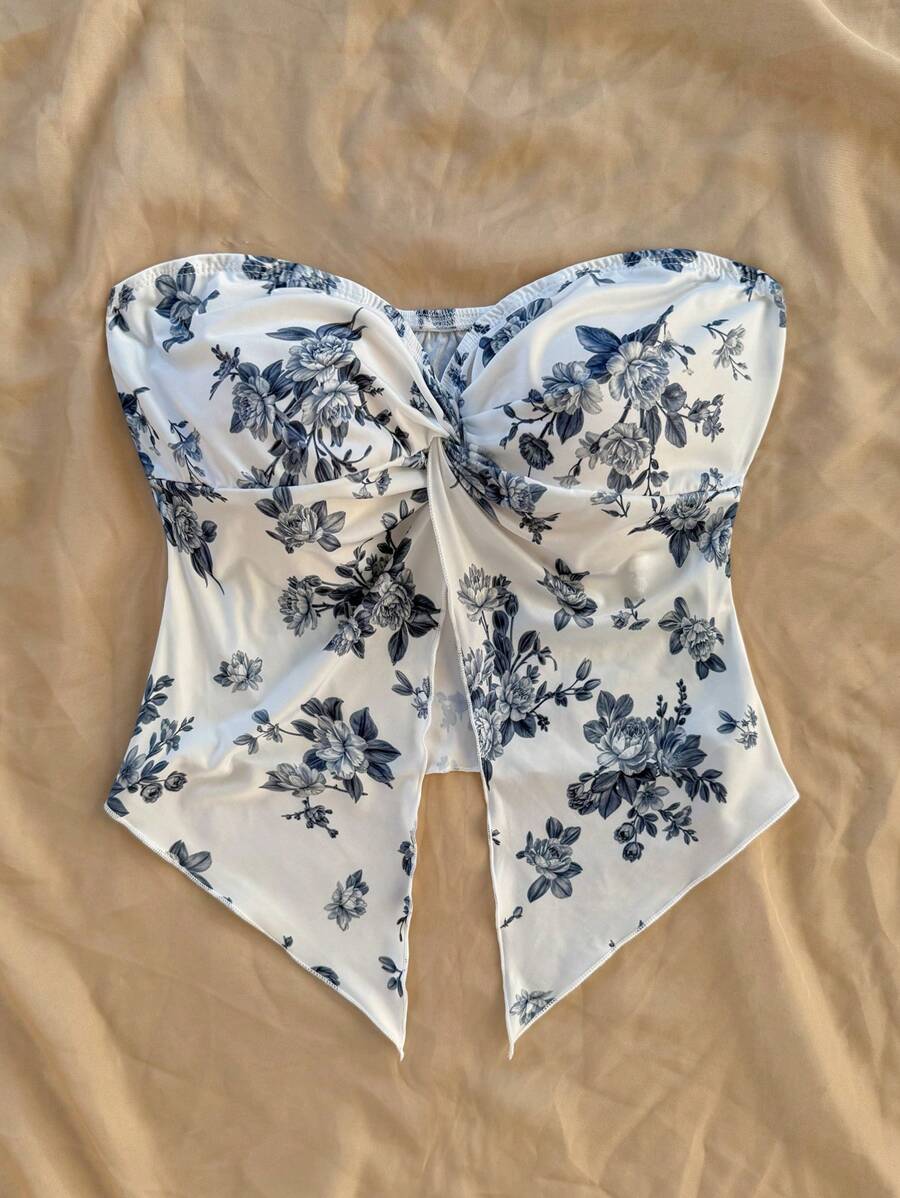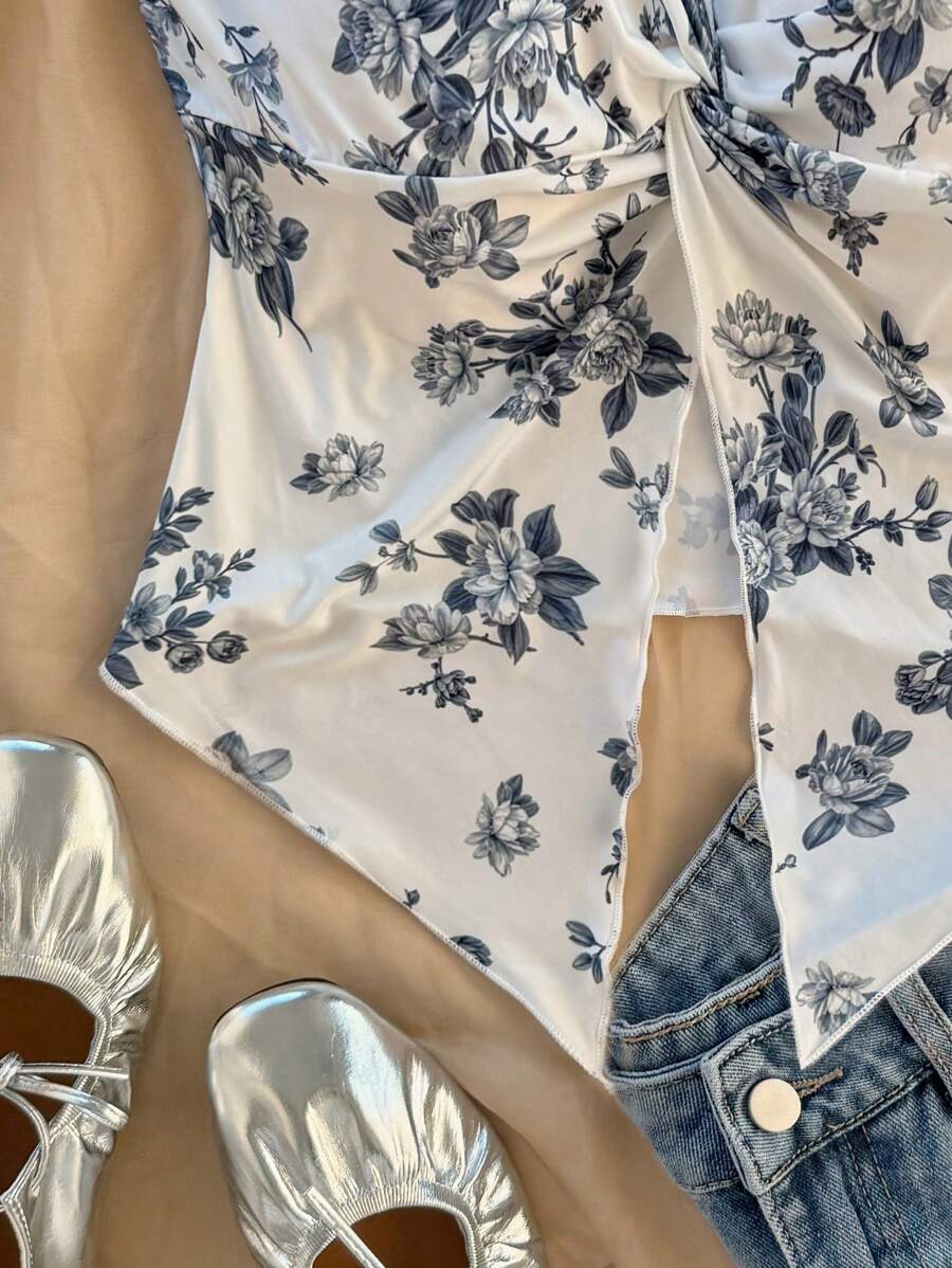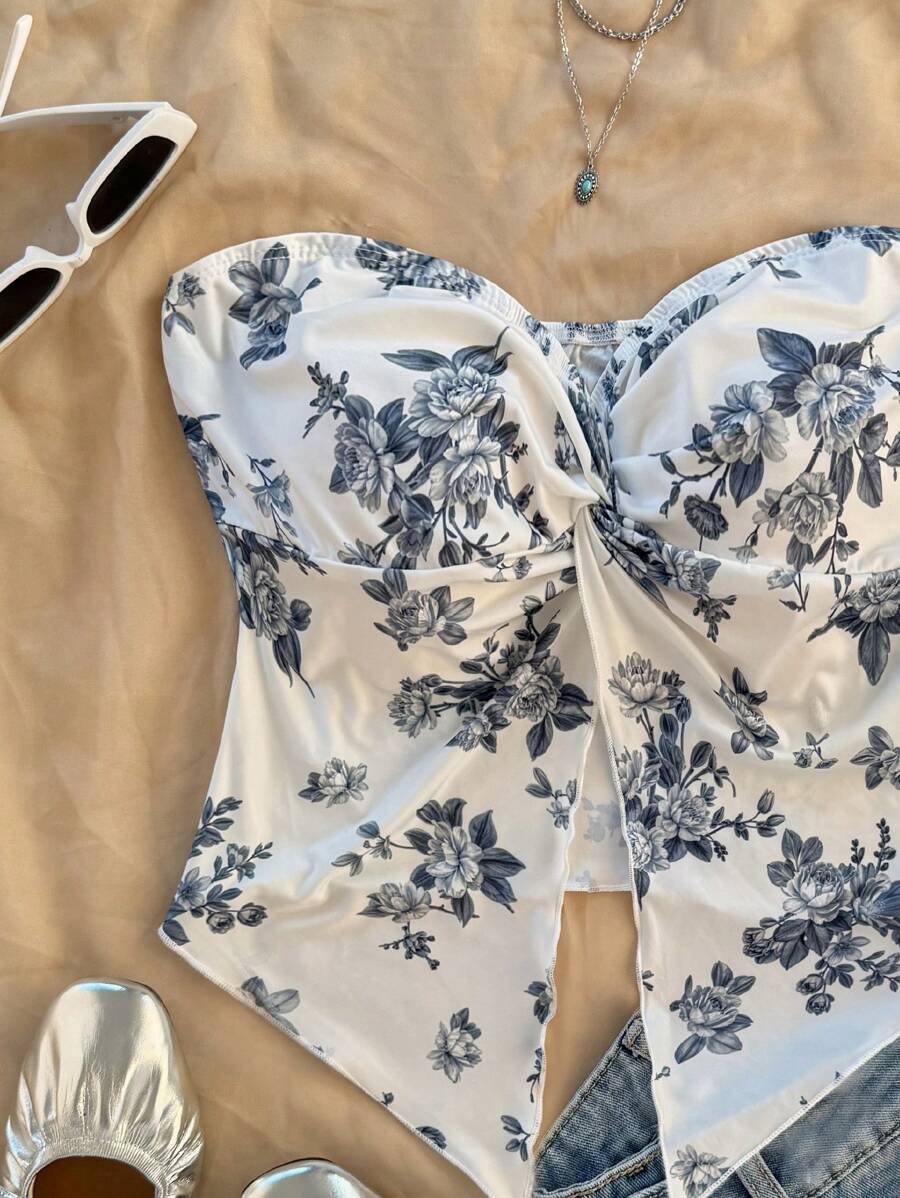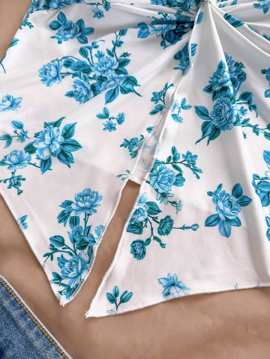 Blusa de gasa comoda con estampado floral azul y blanco, corte halter y abertura frontal, adecuada para te de la tarde, temporada de graduacion, y como capa para el invierno
