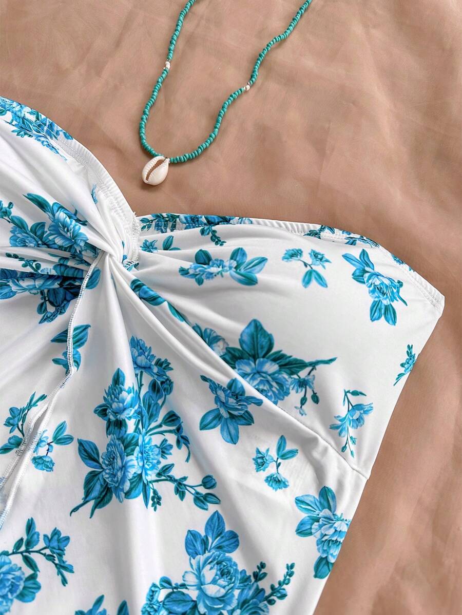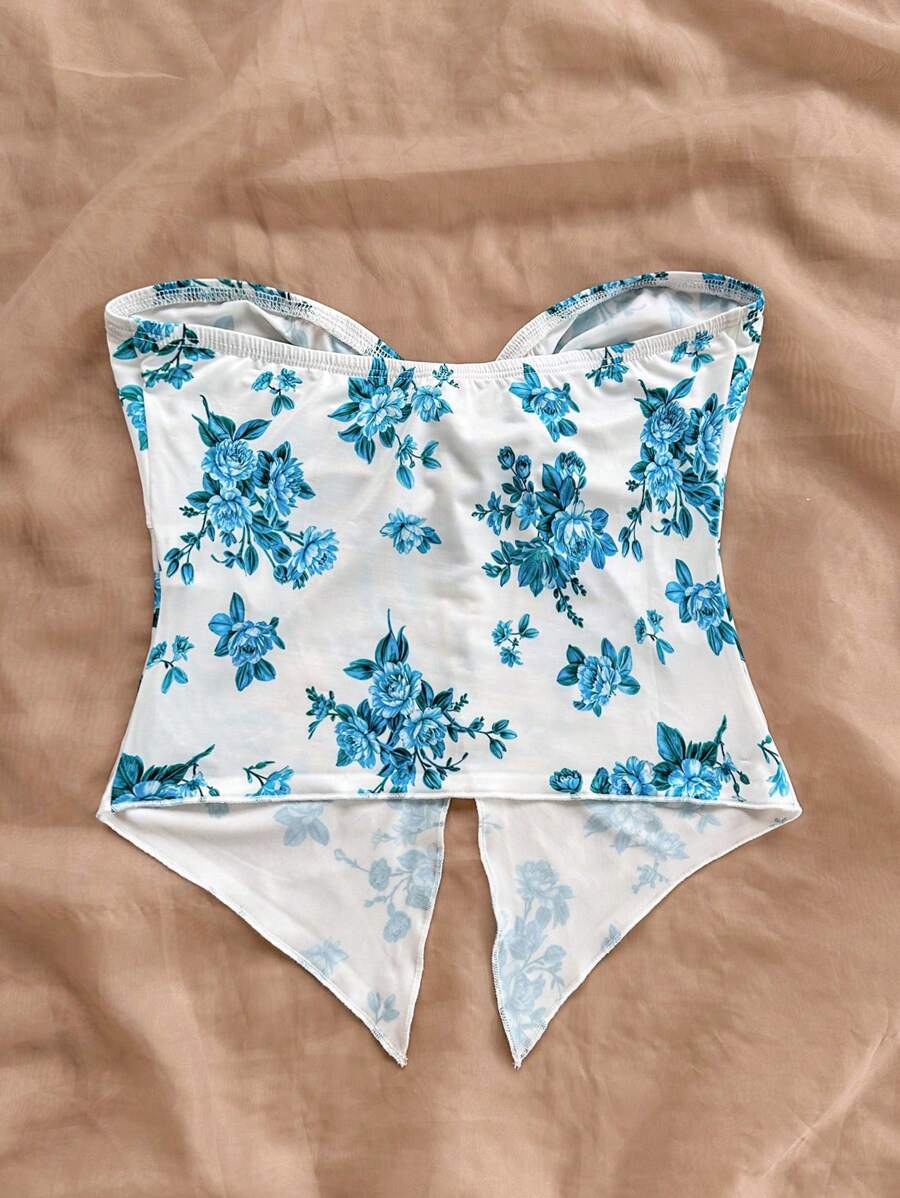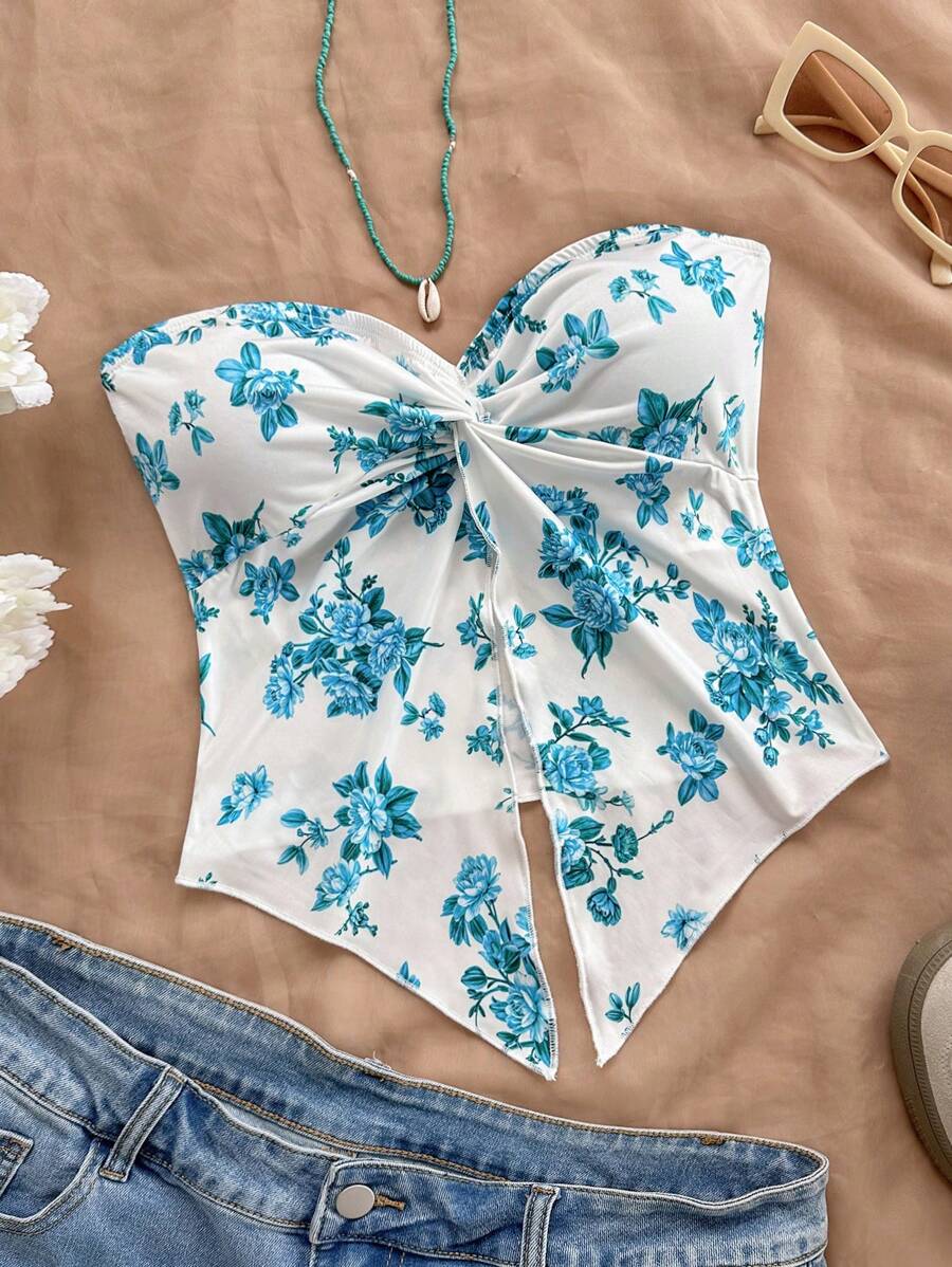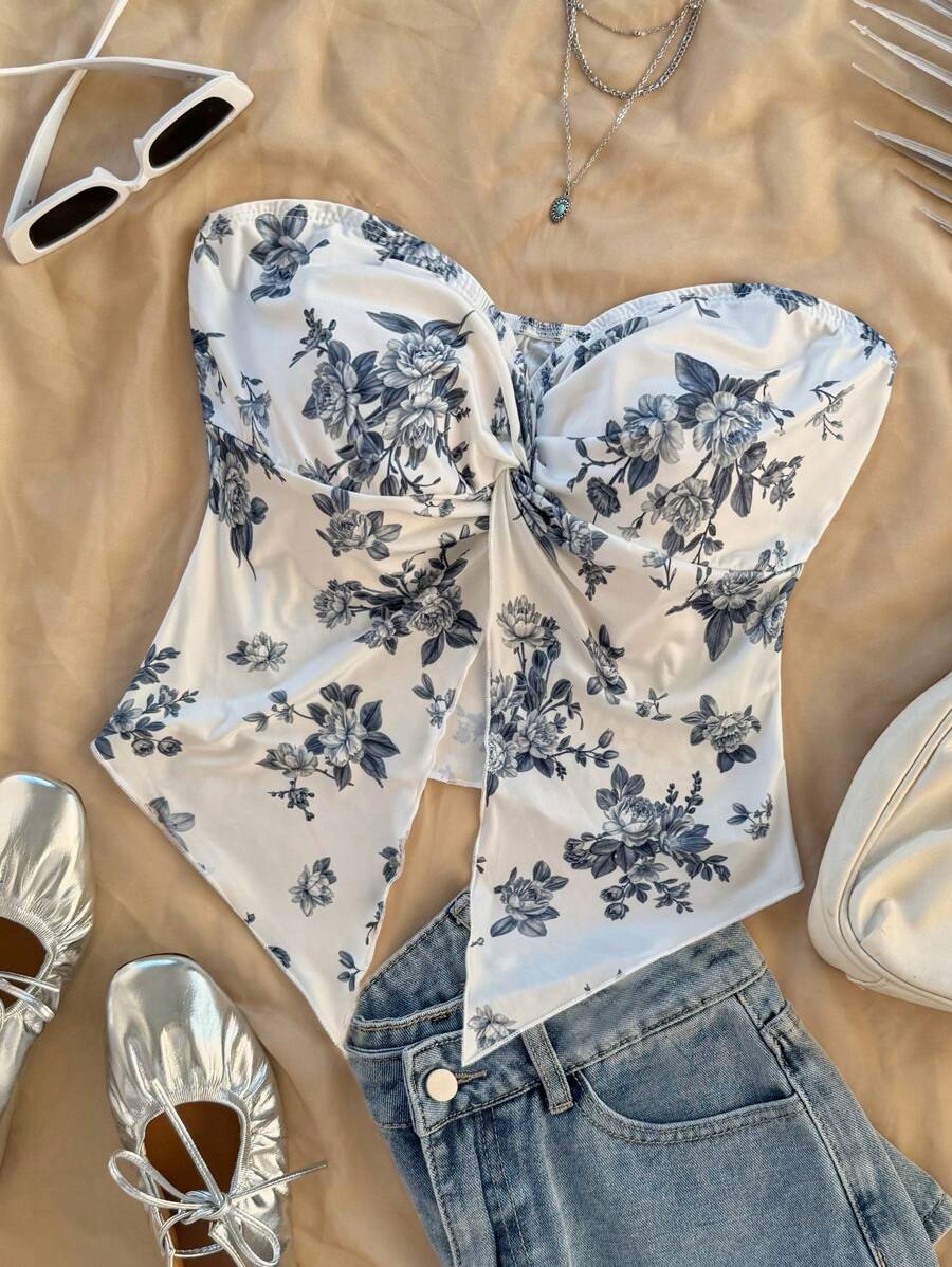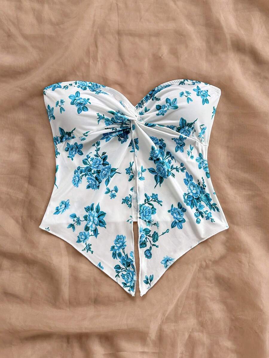 Blusa de gasa comoda con estampado floral azul y blanco, corte halter y abertura frontal, adecuada para te de la tarde, temporada de graduacion, y como capa para el invierno