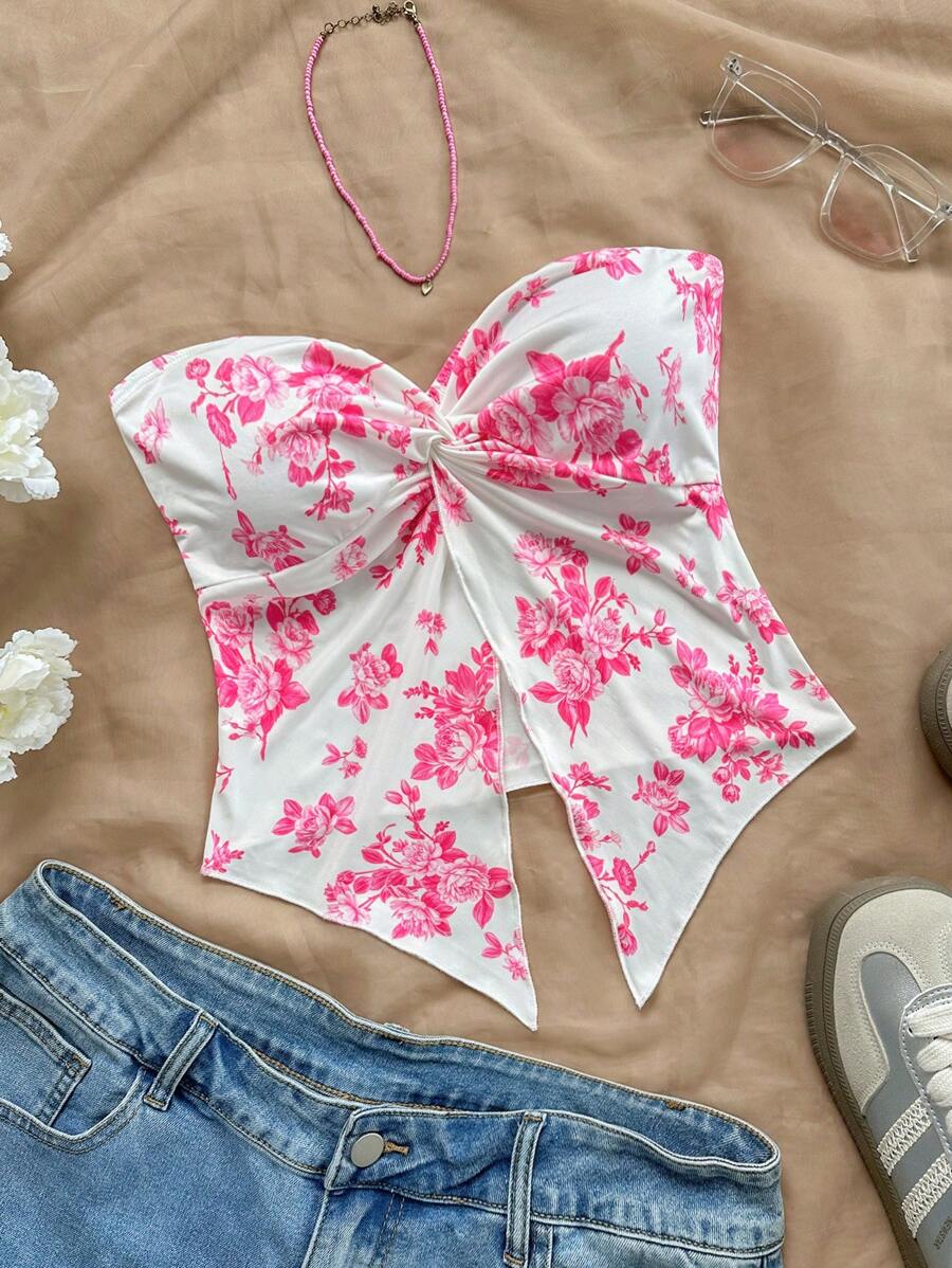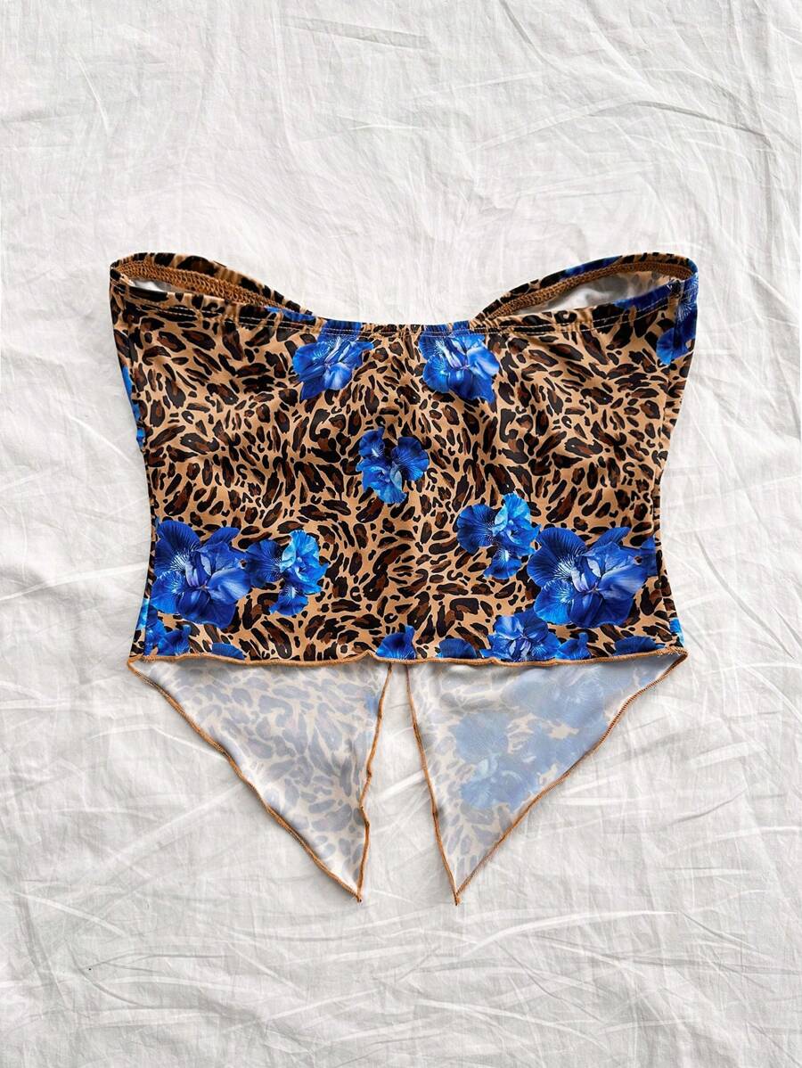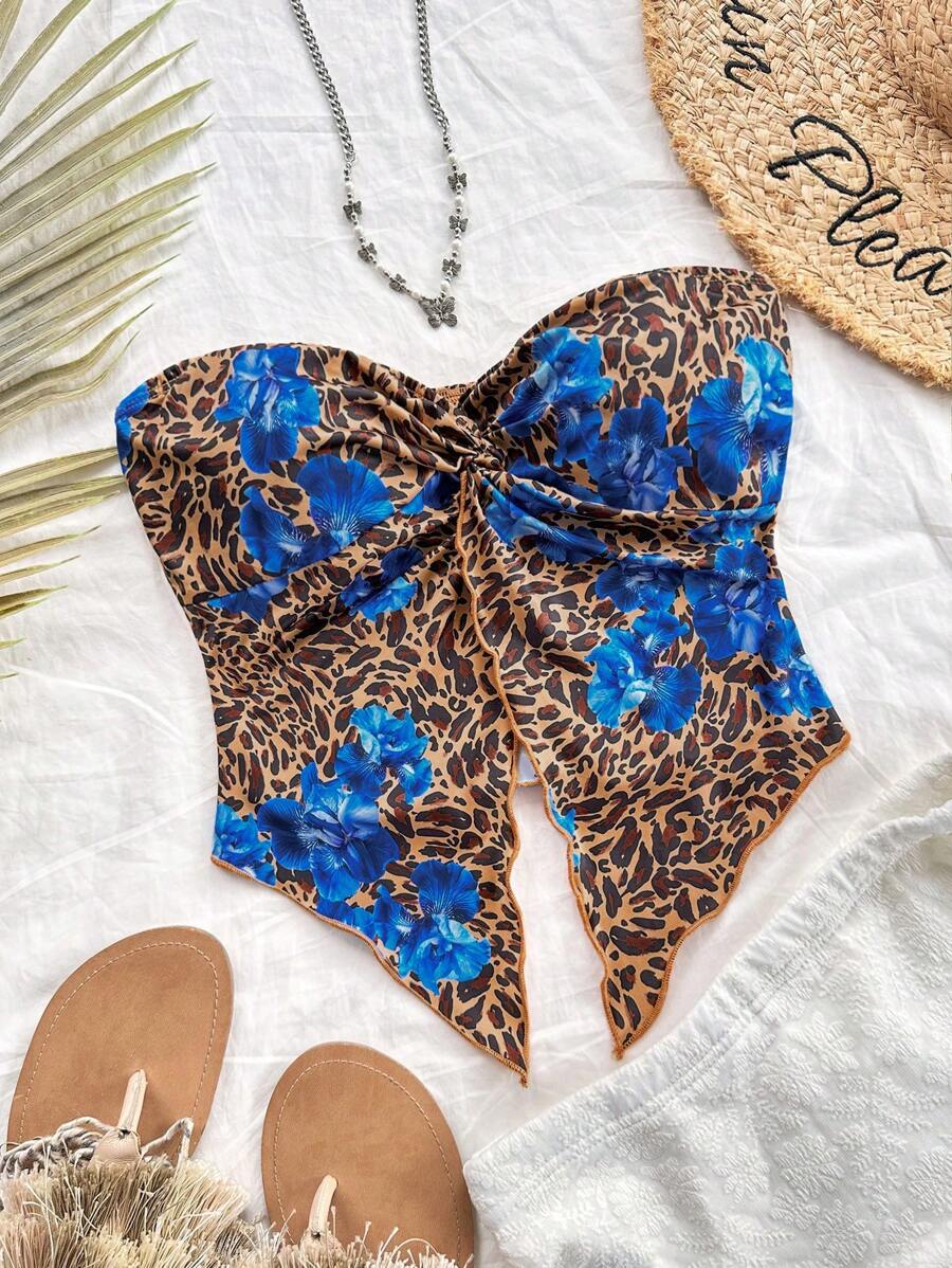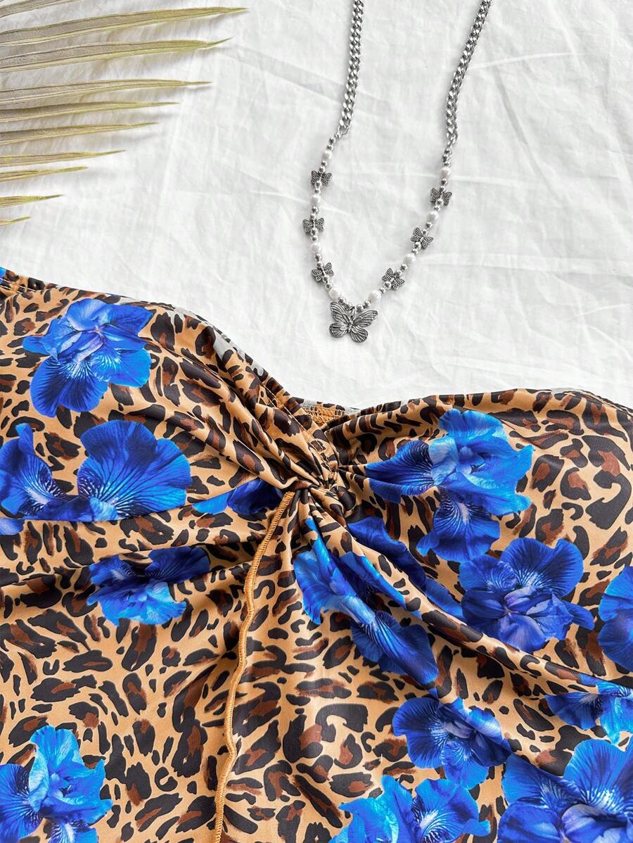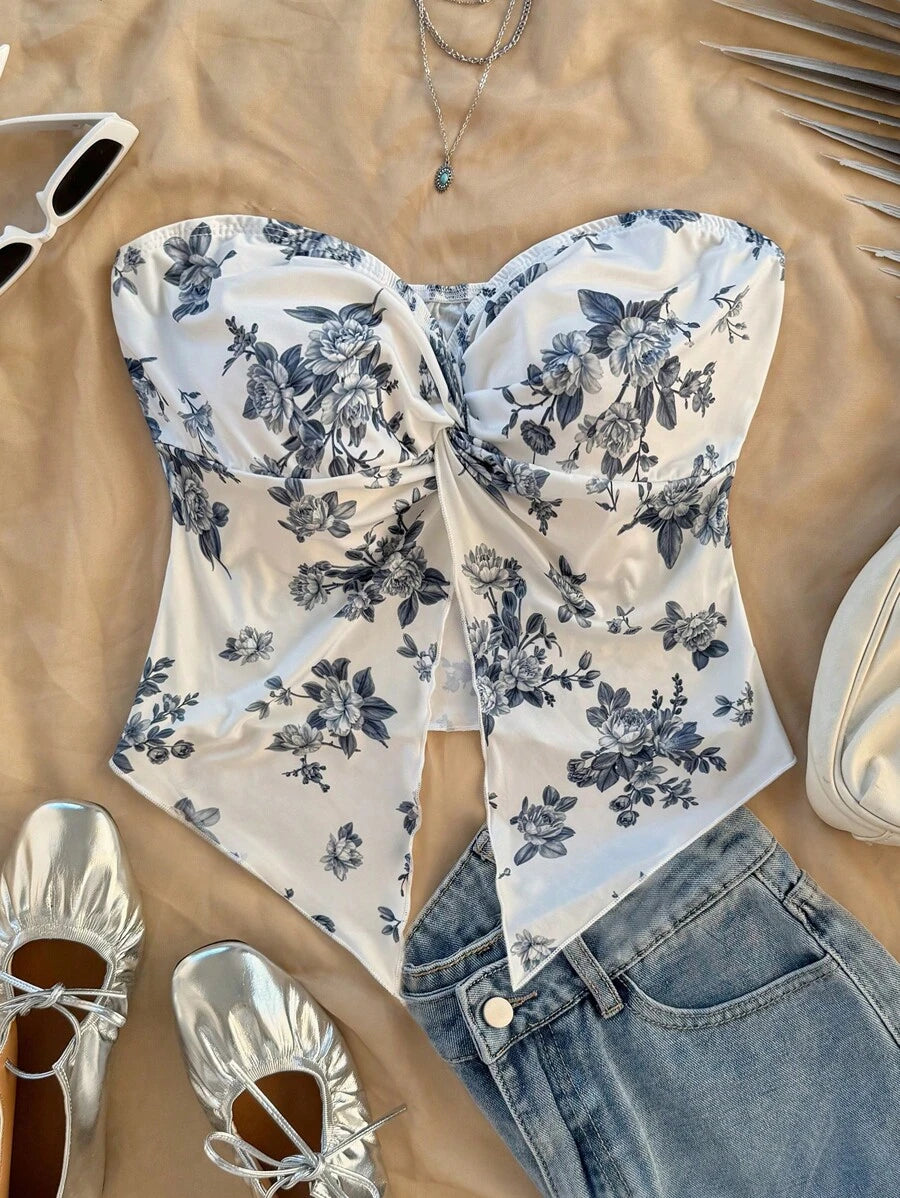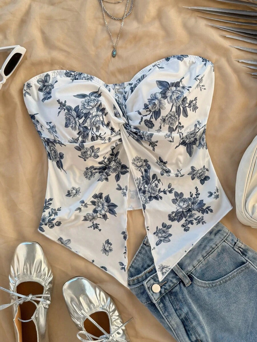 Blusa de gasa comoda con estampado floral azul y blanco, corte halter y abertura frontal, adecuada para te de la tarde, temporada de graduacion, y como capa para el invierno
